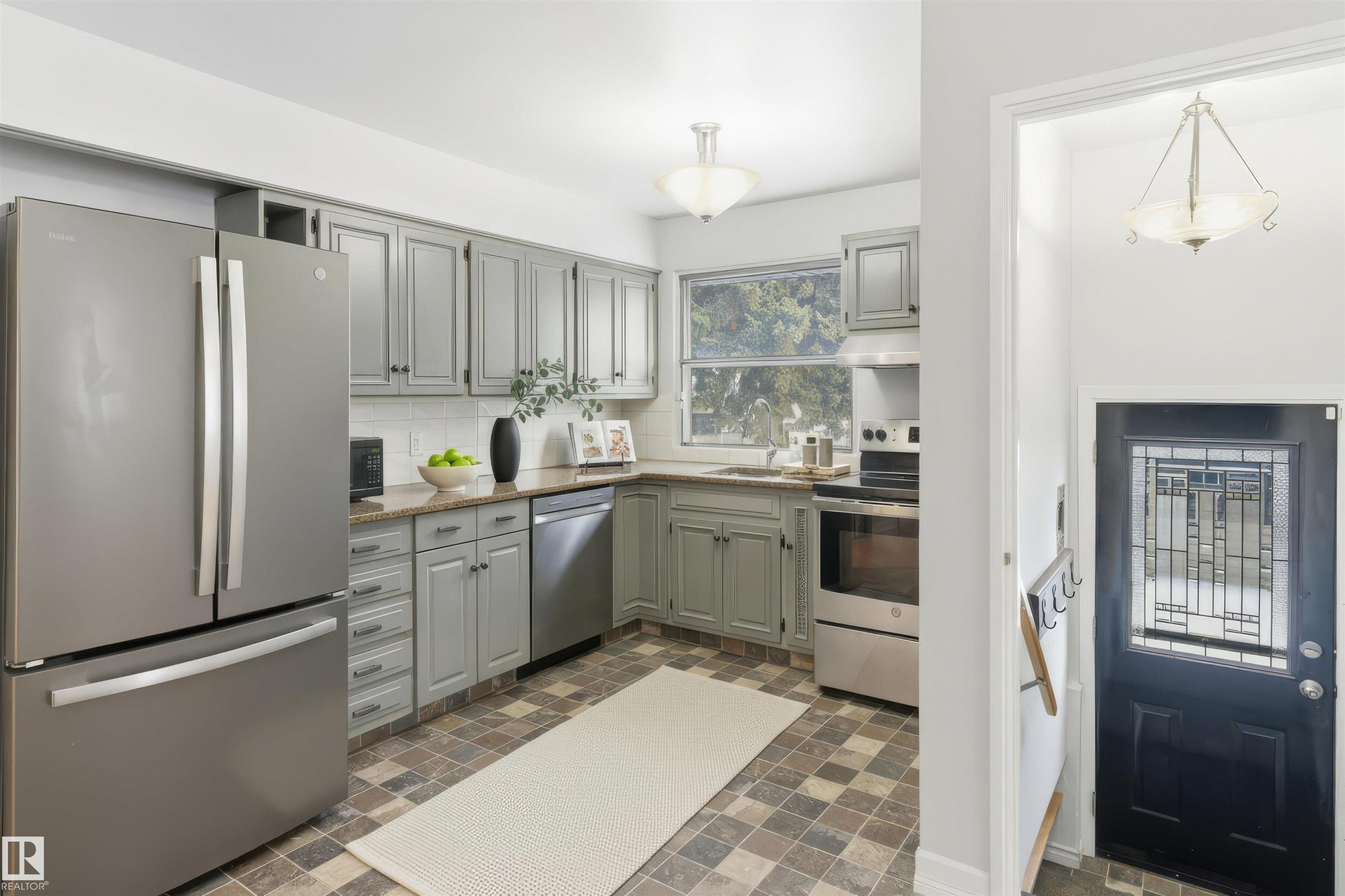 Discover the perfect blend of timeless character & contemporary updates in this truly delightful bungalow, nestled on an spacious lot along a tree lined street in Grovenor. The Living & Dining room are highlighted by gleaming hardwood floors, & coved ceilings. The eat-in kitchen features granite counters, tile backsplash, rich cabinetry, & sleek stainless steel appliances. 3 ample bedrooms & a 4pc bathroom complete the main level. The fully finished basement adds even more living space with a generous rec room, cozy fireplace, Den, Bonus Room, a 3pc bath, & a laundry (New Washer). Modern comfort upgrades include a newer furnace & hot water tank. The exterior has also been refreshed with upgraded insulation, vinyl siding, updated soffits, fascia, & eavestroughs. The beautifully landscaped and fenced backyard offers a large deck, excellent privacy, & a double detached garage. All of this with quick access to downtown, shopping, transit & more. Some photos are virtually staged.
