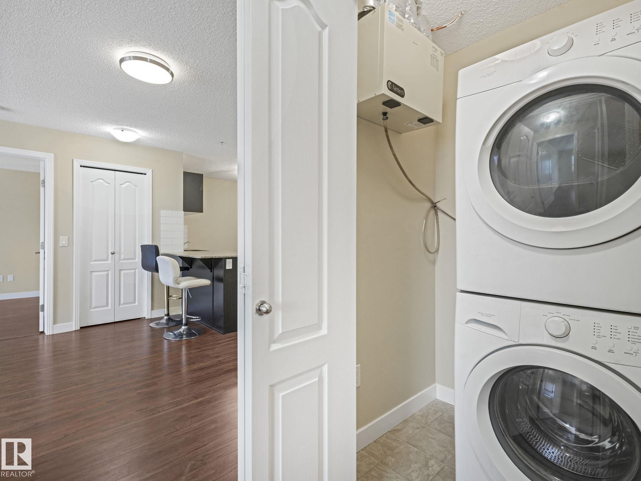 Pride of ownership with this immaculate 2014 built 2-bedroom, 2-bathroom plus Den, 3rd floor condo in Edmonton's North West Community of Baranow. Steps to everything you need such as shopping, transit and amenities. The entryway is welcoming, with a large closet and open layout which showcases the west facing windows full of natural light. The bedrooms are on opposite sides for privacy. The master suite has a walk-in closet and a 3-piece ensuite with a large glass door shower. The second bedroom has a 4-piece bath next to it. The kitchen is upgraded with granite counter-tops, a full-height tile backsplash, and quality cabinets. There?s also in-suite laundry. Large west facing balcony is an ideal spot for relaxing in the evenings. Solara provides an onsite gym. Titled energized parking stall is included with this property. This condo is designed for comfort and style. Don?t miss your chance to own a home in the Solara At Skyview! Low condo fee $410.36 which includes all utilities except for electricity.