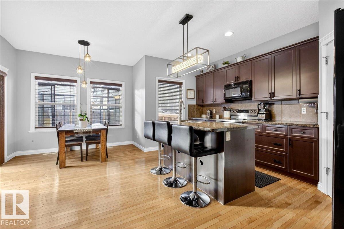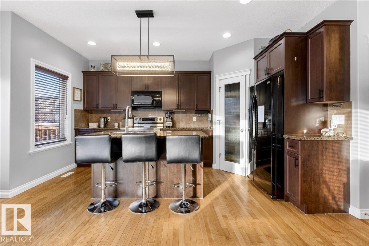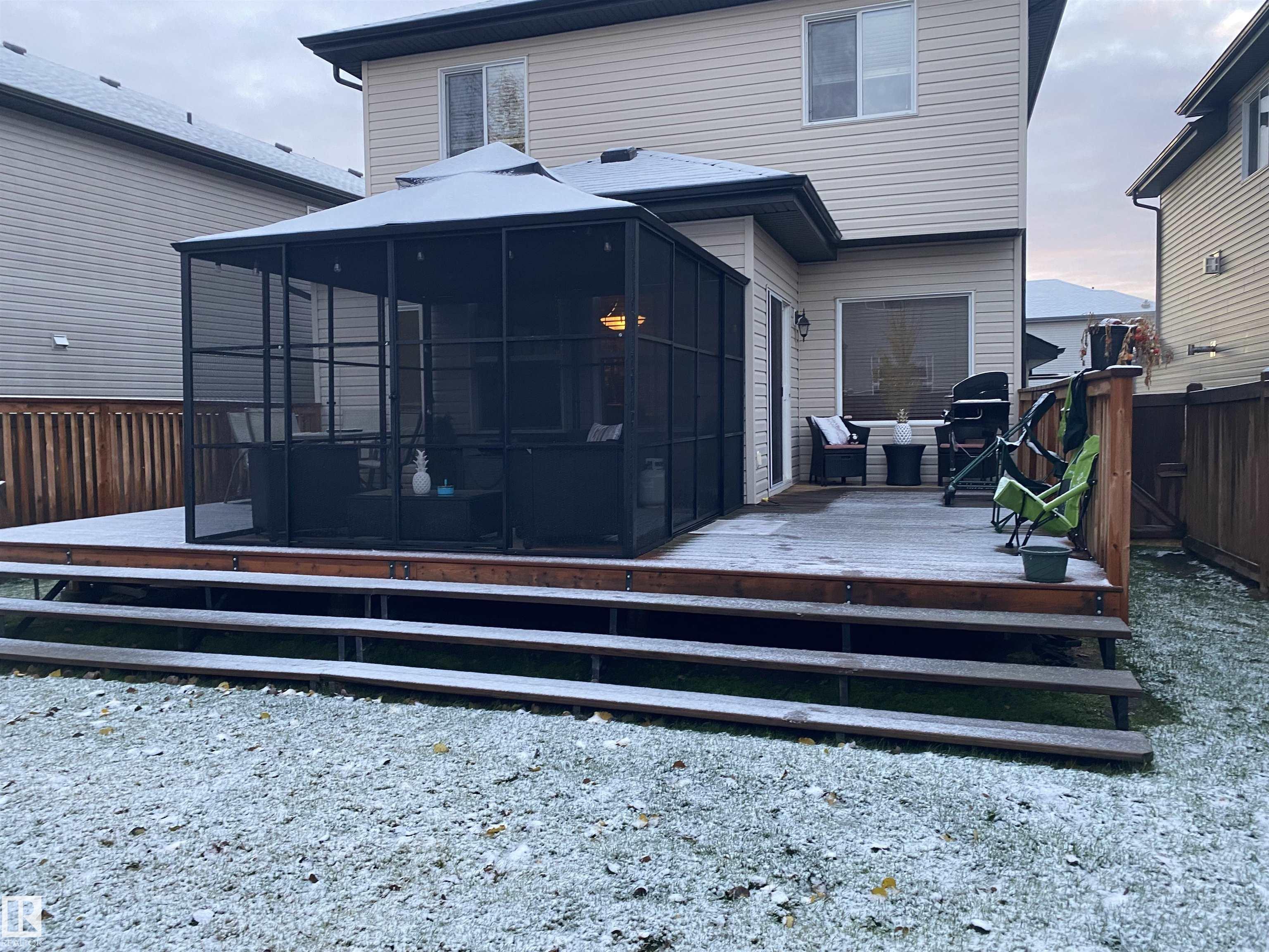 Welcome to this beautiful 2-storey home featuring an open-concept main floor with a bright kitchen, dining and living area complete with a cozy fireplace. The kitchen offers an island with breakfast bar and a pantry for extra storage. A convenient 2-piece bath completes the main level. Upstairs you'll find a laundry, a 4-piece bath, two spacious bedrooms, and a primary suite with its own 4-piece ensuite and walk-in closet. Enjoy a fully fenced backyard with a deck, gazebo, storage shed, and mature landscaping. With a double attached garage and a location close to amenities, schools, parks, playgrounds and a golf course, this home has it all.
