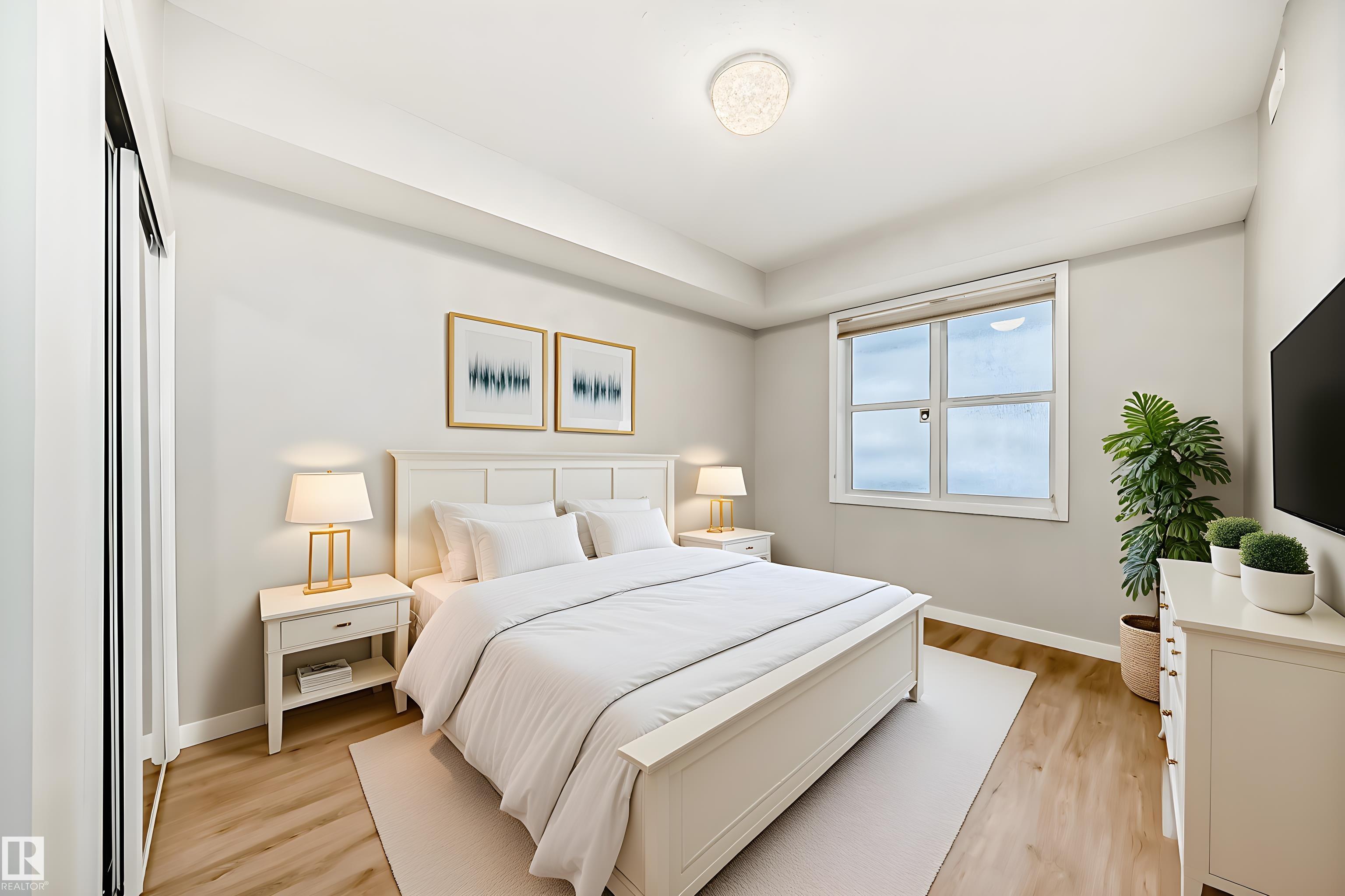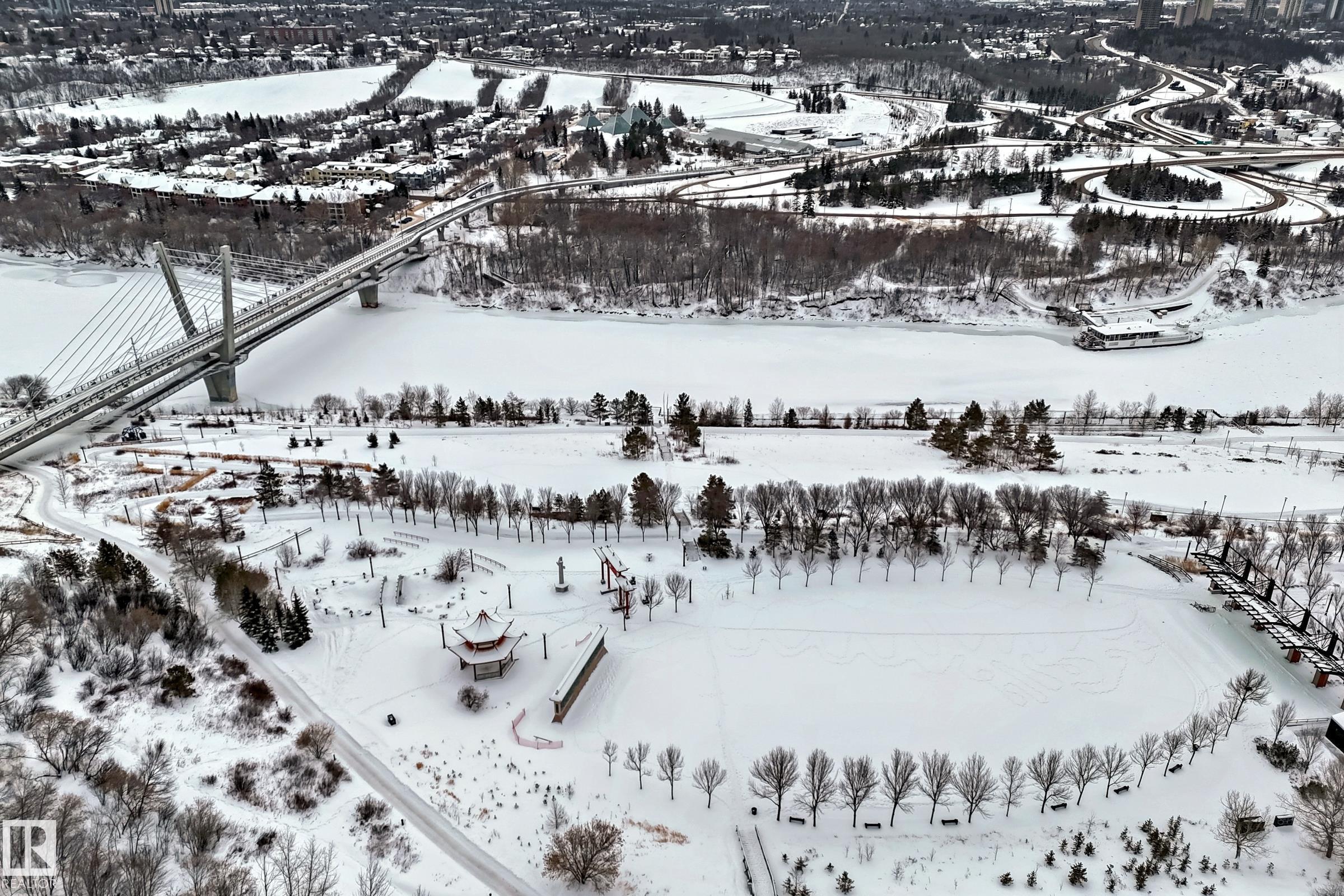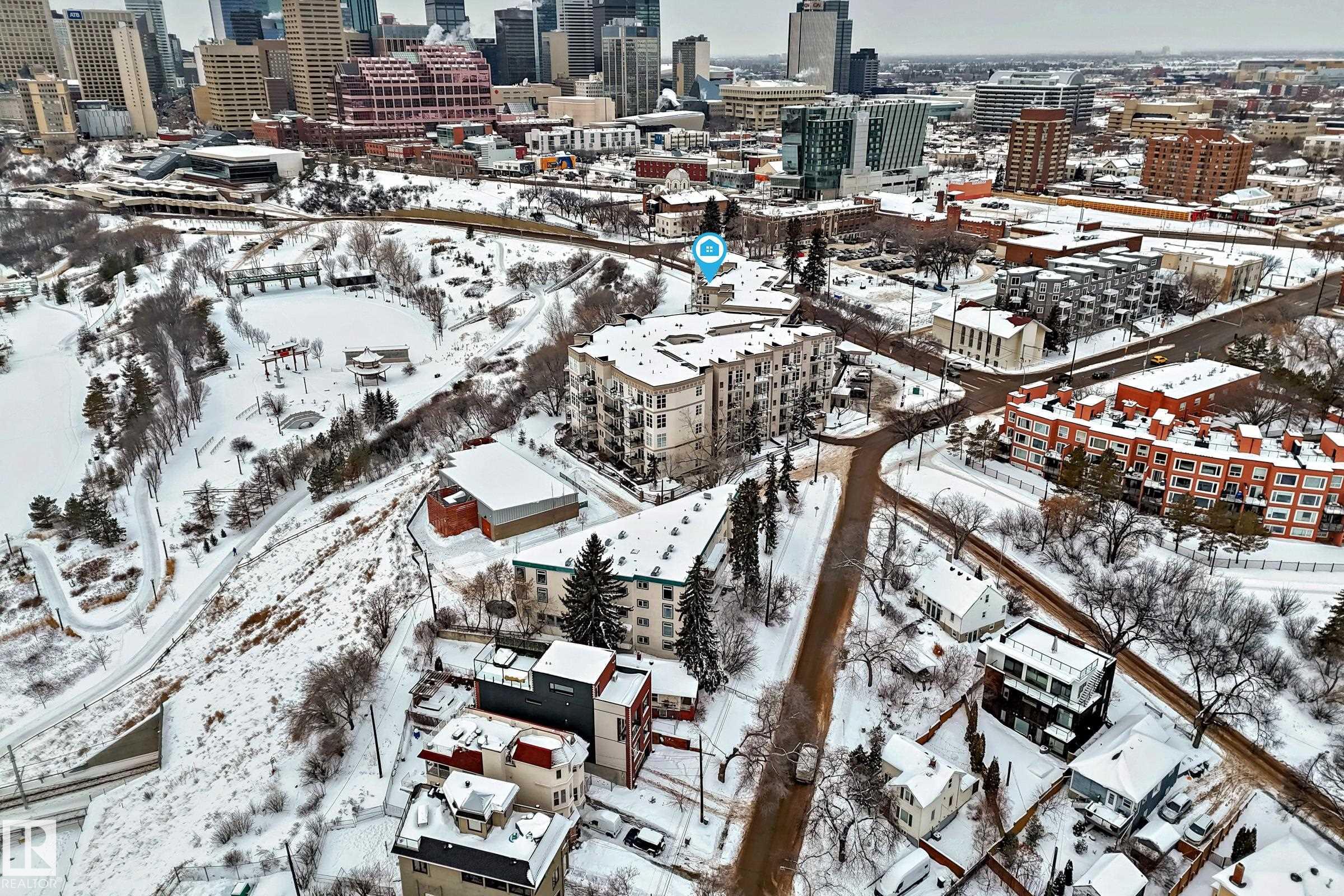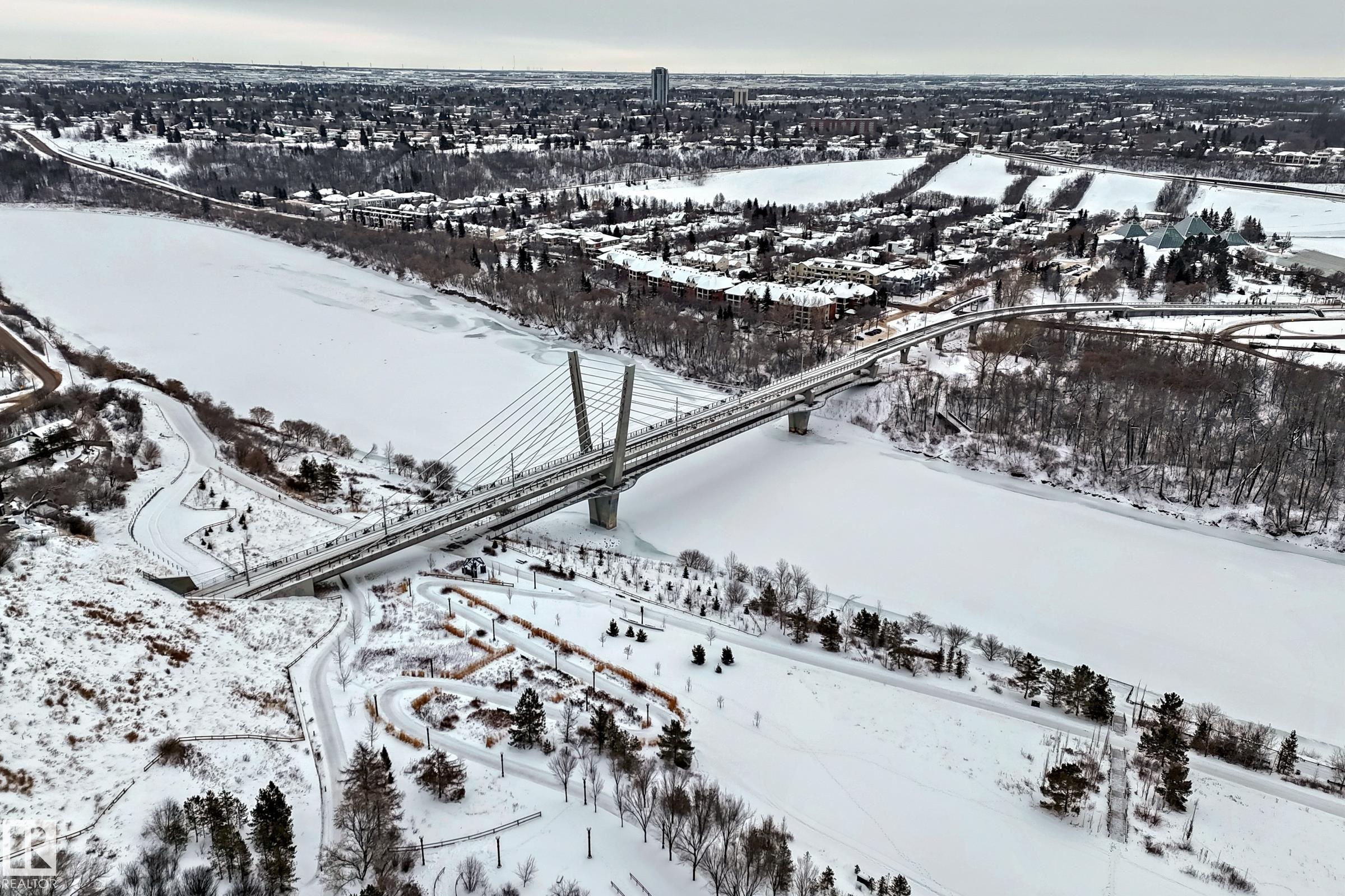 CENTRAL LIVING AT ITS FINEST! Welcome to this gorgeous, luxury two-bedroom condo unit in the incredibly desirable neighbourhood of Riverdale! This condo gives you walking access to all the great amenities within downtown Edmonton, while sitting perched right on the North Sask River Valley. Walk through the front door and you will be blown away by the front to back sight-lines and 9 foot ceilings throughout. The kitchen is a chef's dream including 9-foot island with raised breakfast bar, ample white cabinetry, gas range and more! Adjacent dining room is a fantastic space to host your dinner parties. The living room is spacious & bright with access to southwest facing patio featuring stunning river valley & downtown views. The primary bedroom is your own personal oasis with walk-in closet and 4-piece ensuite. Second bedroom is also a very good size, with 3-piece main bathroom just outside the door. Unit also features in-suite laundry, air conditioning, TWO titled underground parking stalls, and much more!