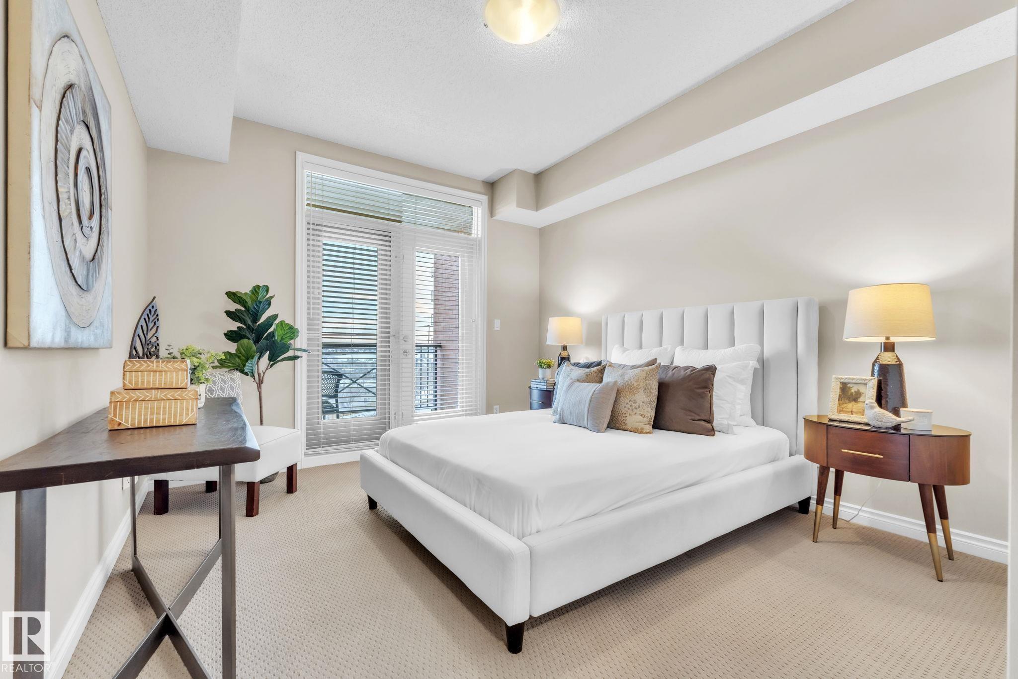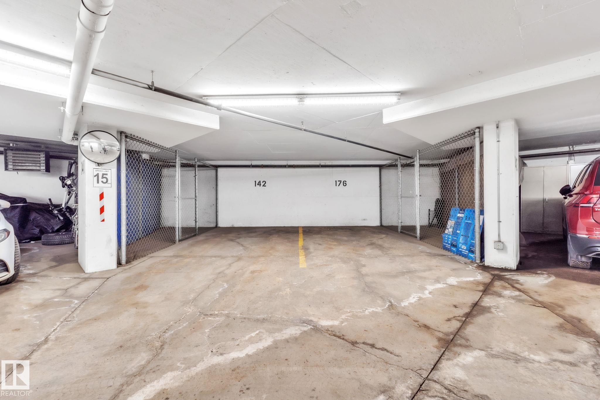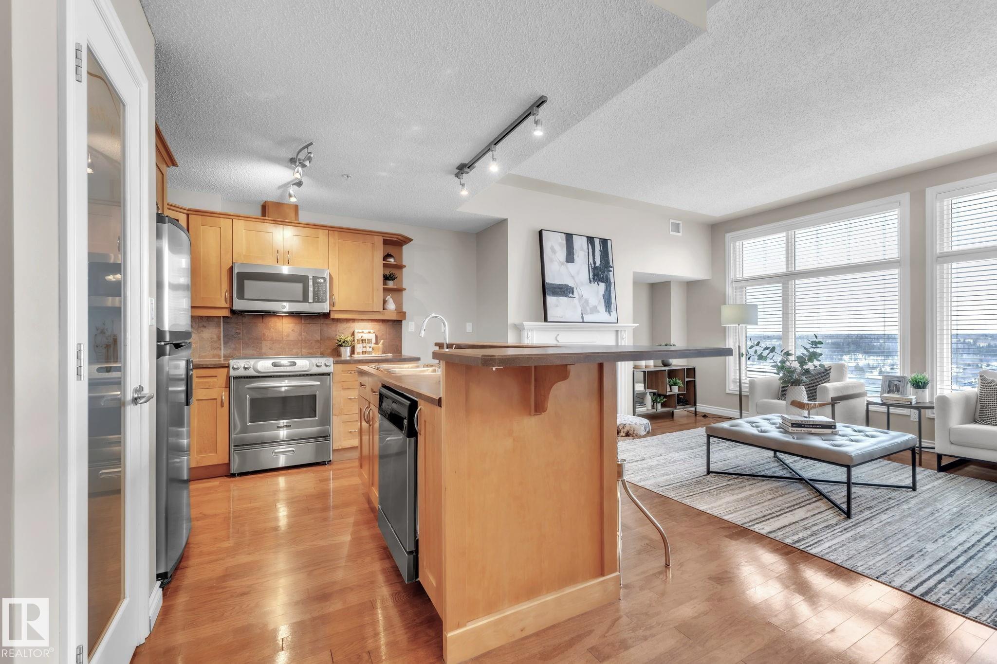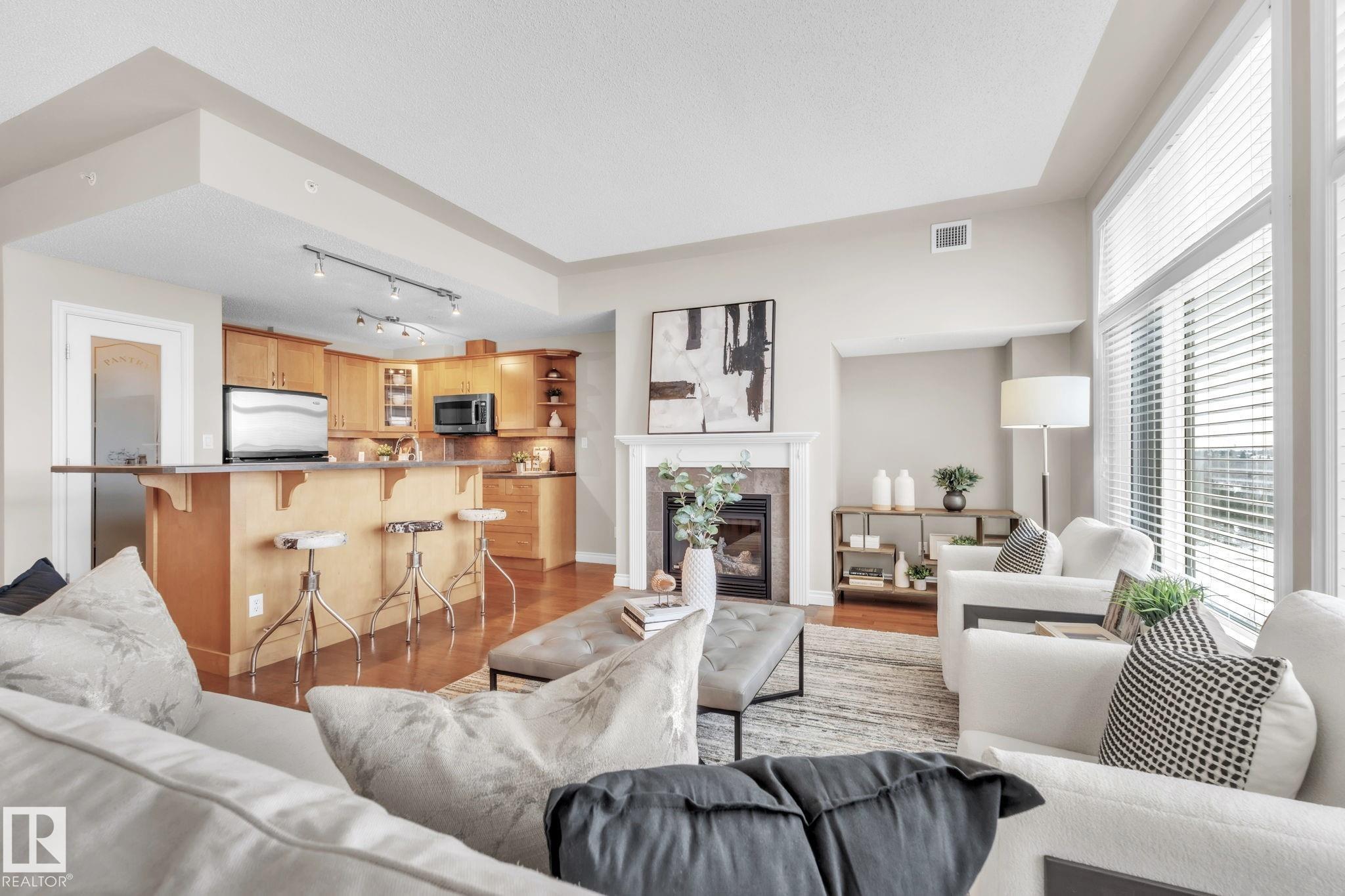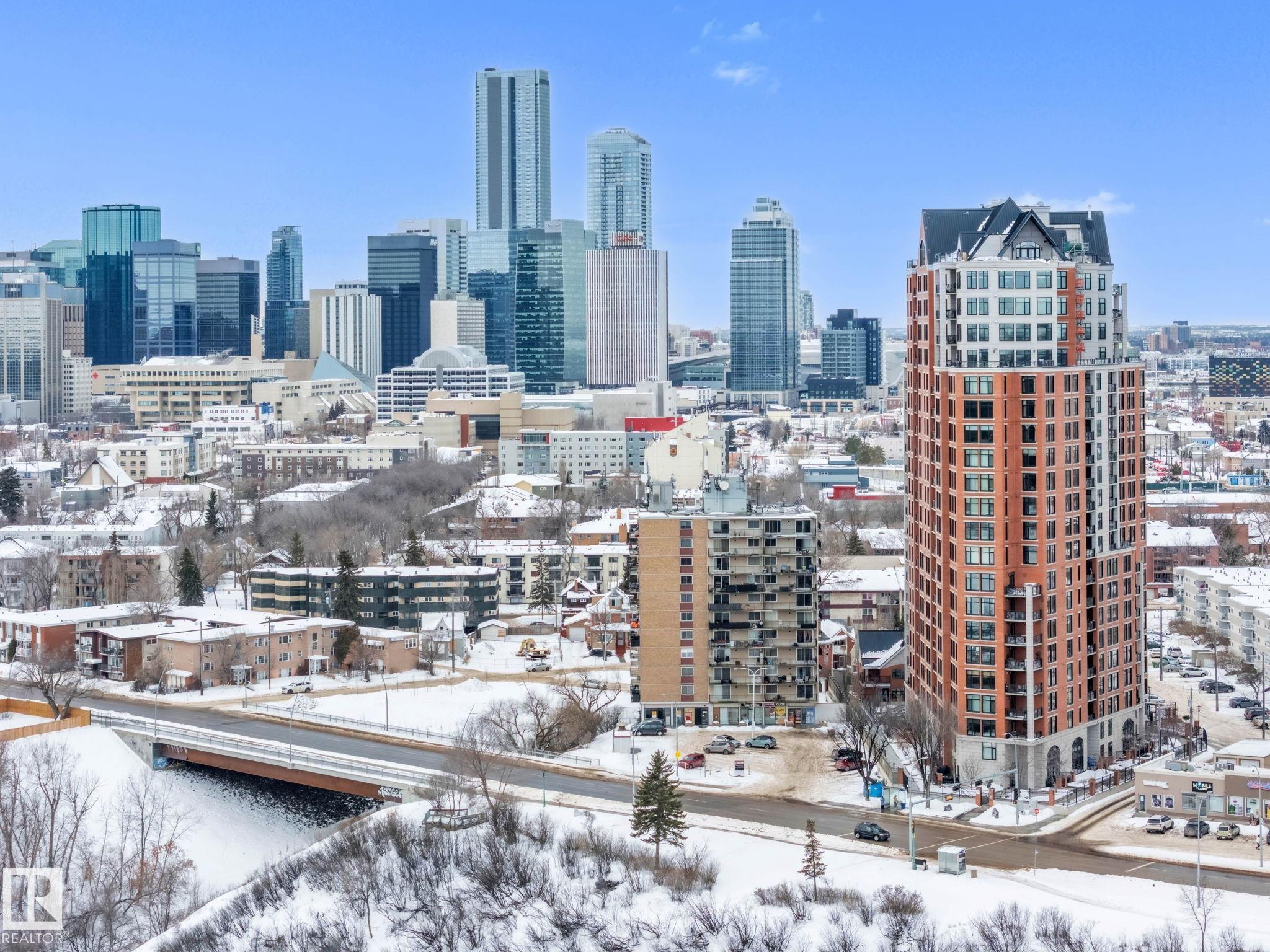 DOWNTOWN EDMONTON CONDO BOASTING SPECTACULAR RIVER VALLEY VIEWS & 2 PARKING STALLS! This 7th-floor, 1,164 sq. ft. condo features 1 bedroom + den, 2 full baths, and 2 side-by-side parking stalls (located on P2, 142 & 176), each with 2 large, lockable storage cages (252 & 253). Features include 9' ceilings, hardwood floors, NEW floor-to-ceiling energy-efficient TRIPLE PAIN WINDOWS, A/C, a gas fireplace, Hunter Douglas blinds, and a LARGE SOUTHEAST covered deck w/gas BBQ hookup that offers unrestricted views of the River Valley! Open kitchen with Maple cabinets and deluxe stainless-steel appliances. The master bedroom has patio doors, a 4-piece ensuite with a separate shower and a soaker tub, and a large walk-in closet. Double French doors lead to the den, which is ideal for an office or bedroom. Building amenities: an exercise room & a gated community. Condo Fees $877 mo. heat+water+electricity. Perfect location for professionals working Downtown, or retirees who enjoy dining, Rogers Place, and the Stadium.