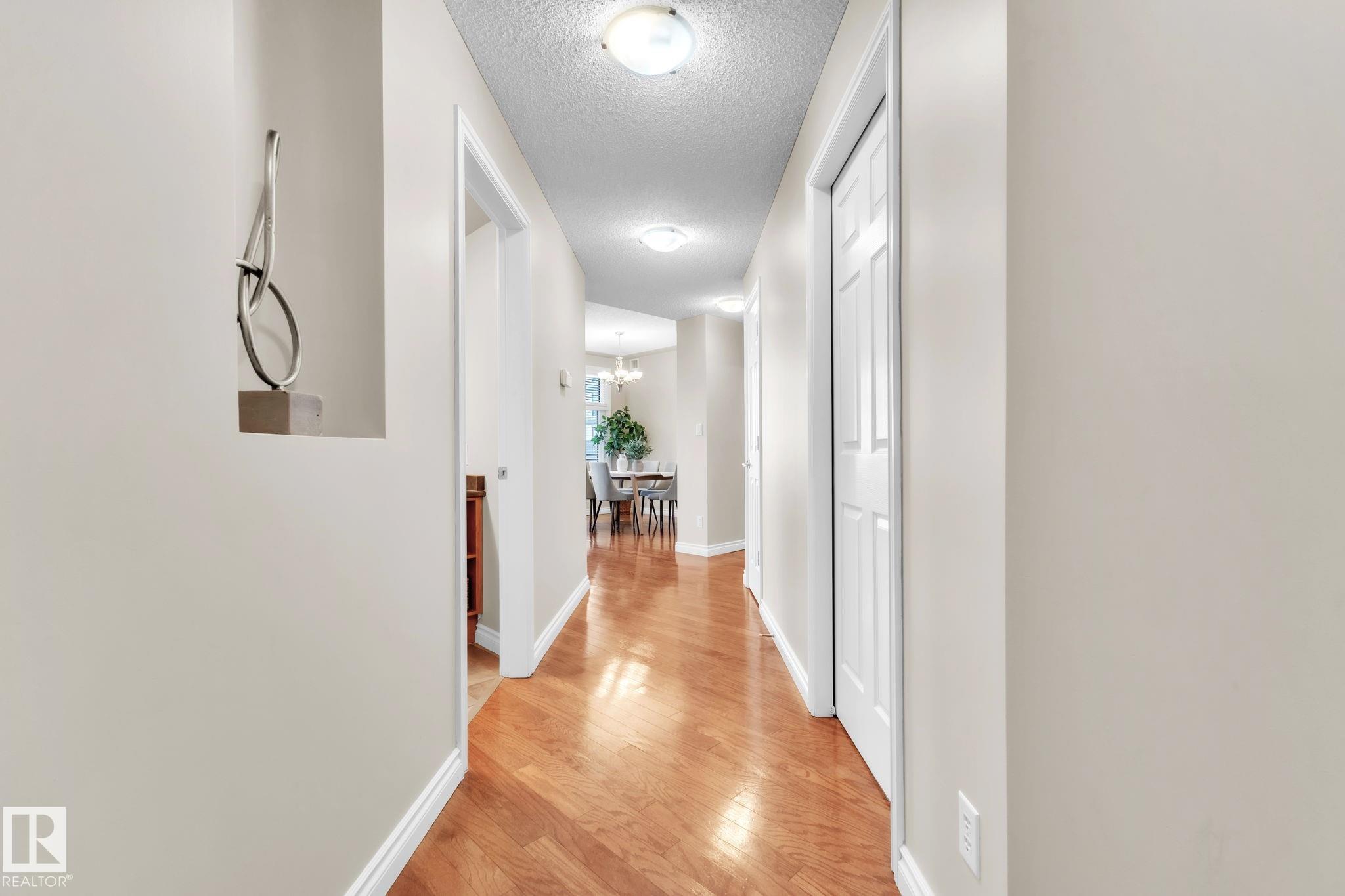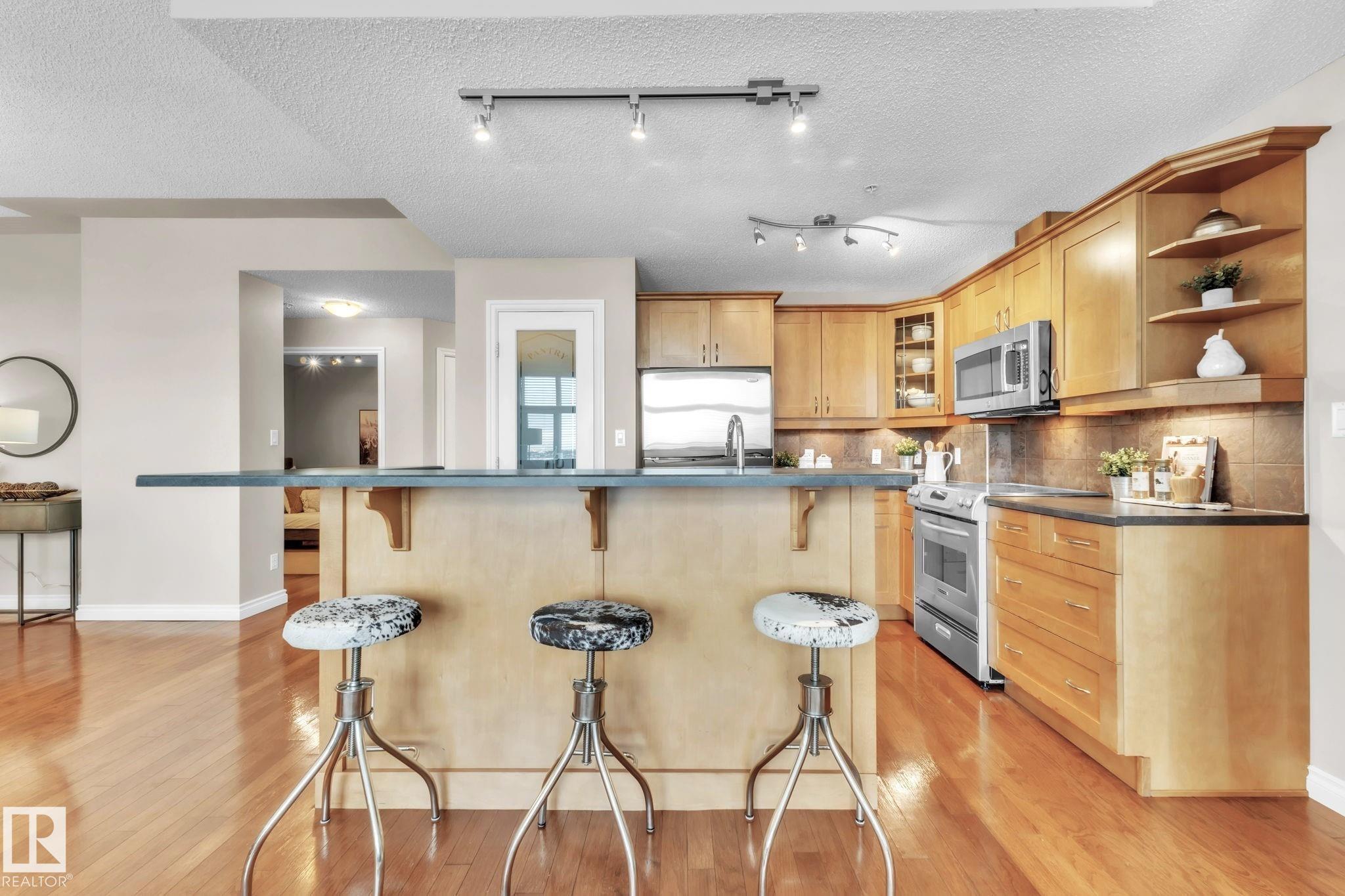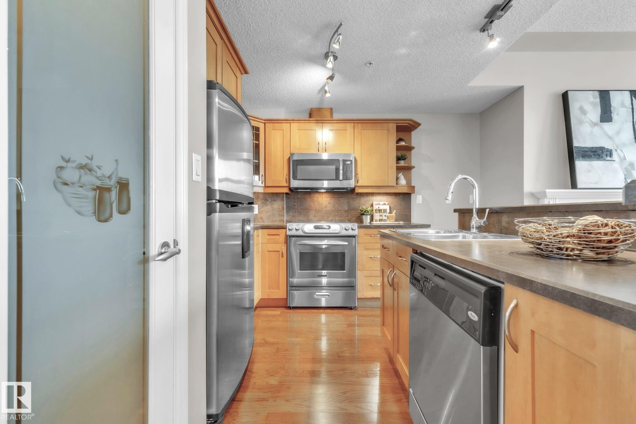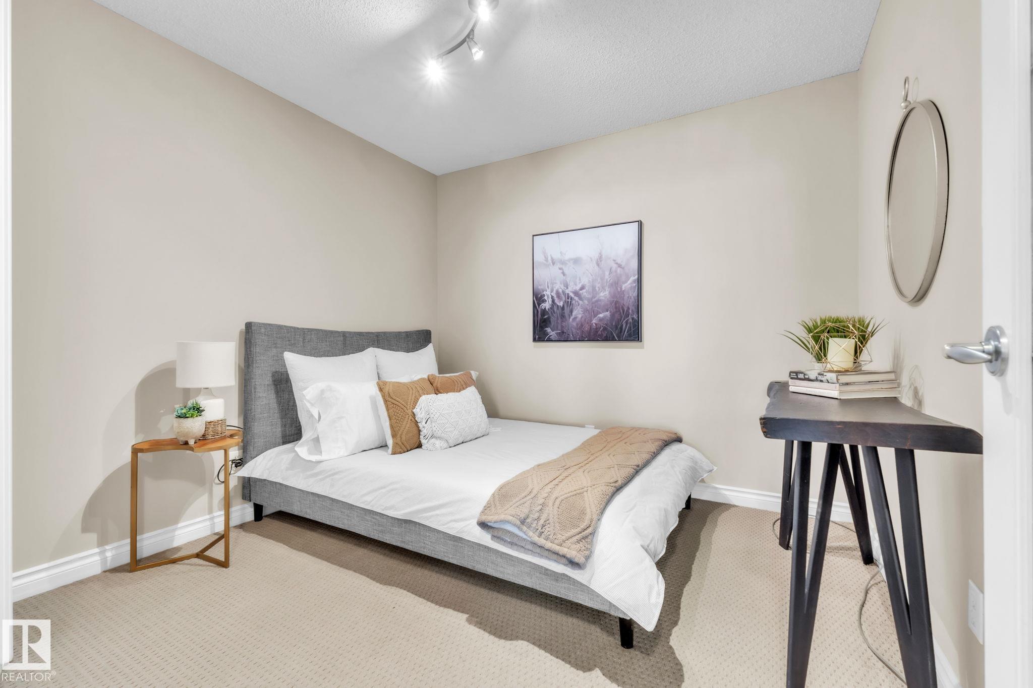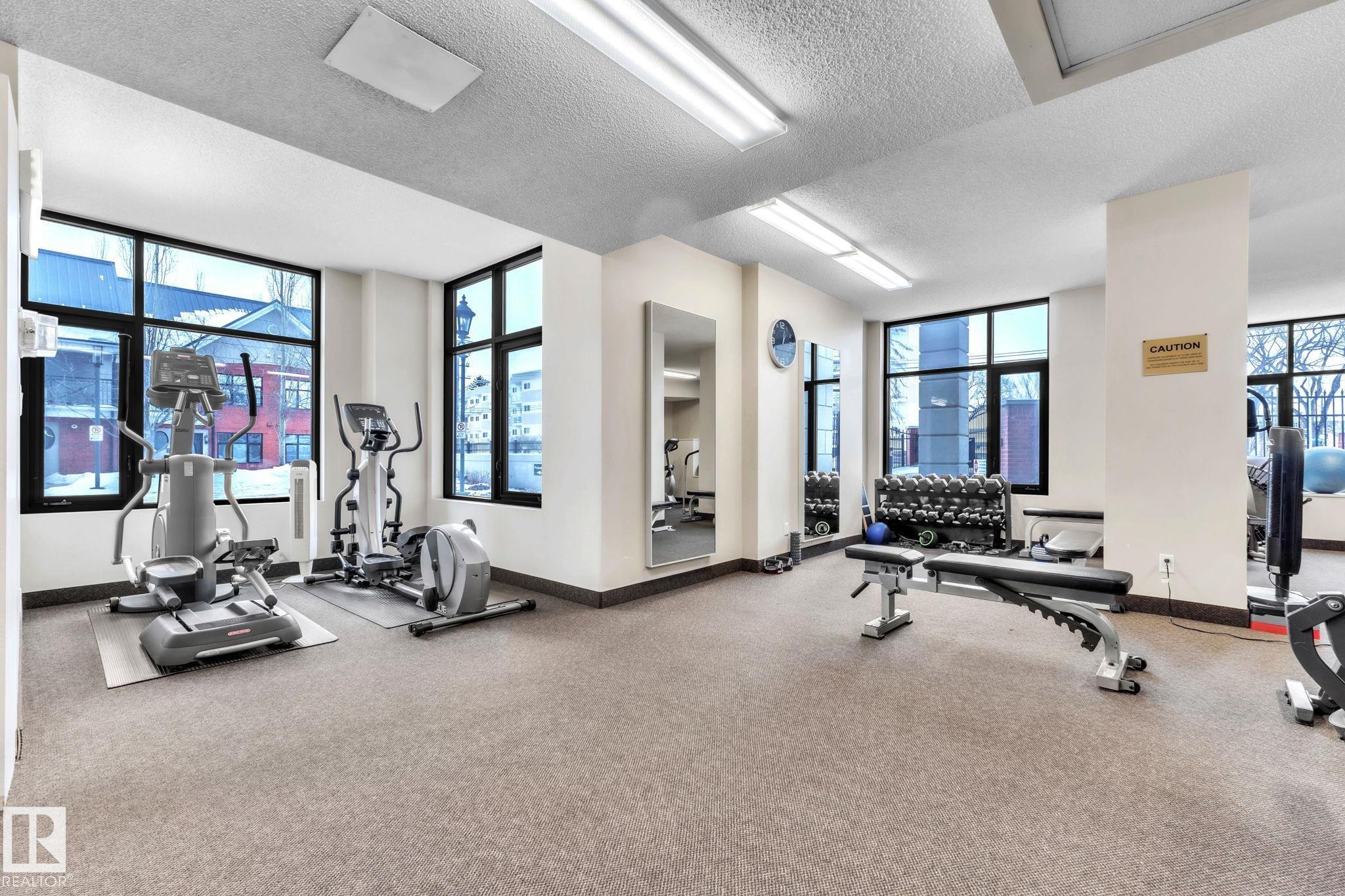 DOWNTOWN EDMONTON CONDO BOASTING SPECTACULAR RIVER VALLEY VIEWS & 2 PARKING STALLS! This 7th-floor, 1,164 sq. ft. condo features 1 bedroom + den, 2 full baths, and 2 side-by-side parking stalls (located on P2, 142 & 176), each with 2 large, lockable storage cages (252 & 253). Features include 9' ceilings, hardwood floors, NEW floor-to-ceiling energy-efficient TRIPLE PAIN WINDOWS, A/C, a gas fireplace, Hunter Douglas blinds, and a LARGE SOUTHEAST covered deck w/gas BBQ hookup that offers unrestricted views of the River Valley! Open kitchen with Maple cabinets and deluxe stainless-steel appliances. The master bedroom has patio doors, a 4-piece ensuite with a separate shower and a soaker tub, and a large walk-in closet. Double French doors lead to the den, which is ideal for an office or bedroom. Building amenities: an exercise room & a gated community. Condo Fees $877 mo. heat+water+electricity. Perfect location for professionals working Downtown, or retirees who enjoy dining, Rogers Place, and the Stadium.