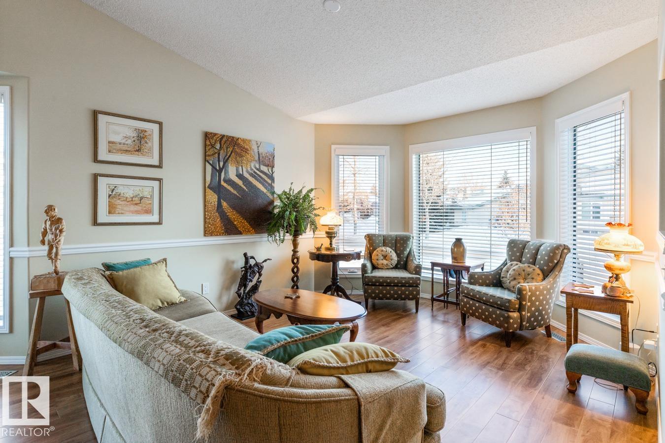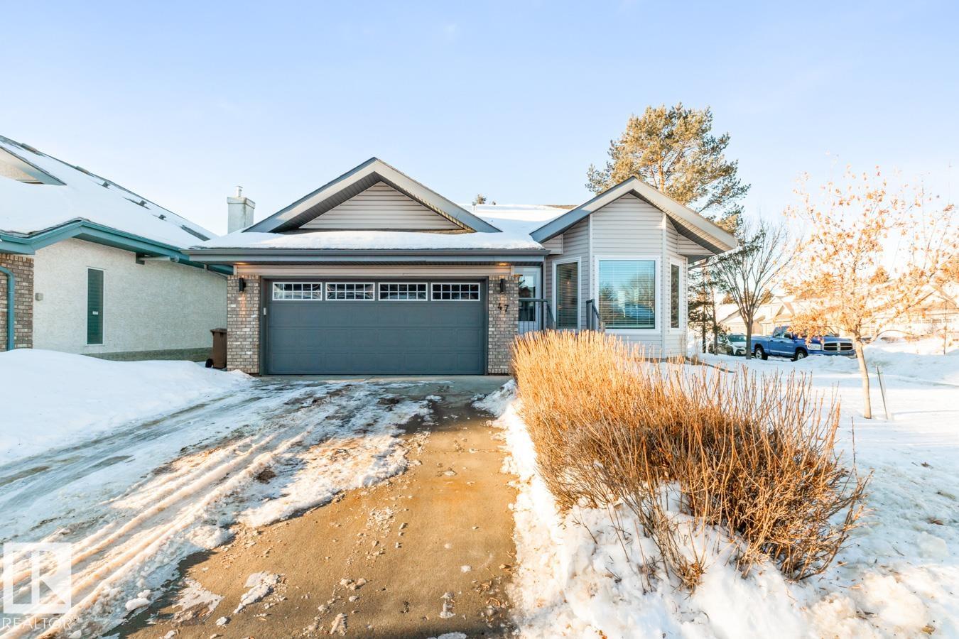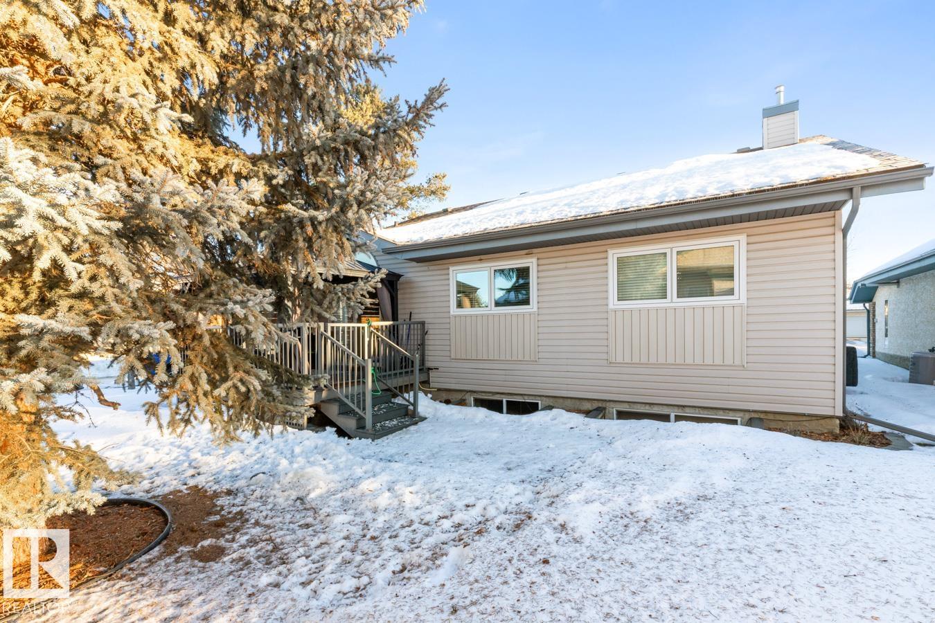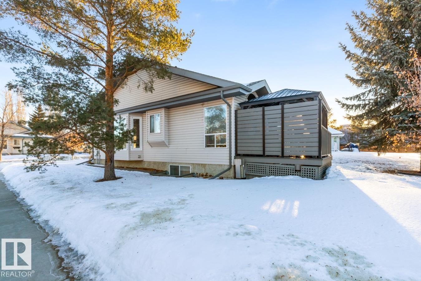 AMAZING FIND IN AKINSDALE - RENOVATED Bungalow! Kitchen features new Alberta-made Cabinetry (white), Quartz Counters, new flooring & plenty of storage. Main Floor incls two Bedrooms, VAULTED CEILINGS & is CARPET-FREE. Bathrooms on this level have new vanities & faucets. MAIN FLOOR LAUNDRY! Fully Finished Basement w/ GAS FIREPLACE, 3rd Bedroom & a large storage room or workshop. HEATED, DOUBLE ATTACHED GARAGE is equipped w/ 220v wiring (electric vehicle). Bonus: AIR CONDITIONING, Water Softener, New Lighting, recently Painted, New Blinds & more! Outdoors there is a spacious, composite Deck w/ Gazebo & gas hookup. Corner Lot lends itself to a bright & sunny space w/ extra windows. Walking distance to Trails, Parks, Groceries, Restaurants, Shops & Pharmacies. Pickleball Court nearby in the community! Quick access to Henday & Downtown Edmonton is an easy 20 minute commute. Quiet neighbourhood. Low monthly HOA fee covers snow removal & lawn care. NOT A CONDO! 18+ age restrictions. Pet Friendly!