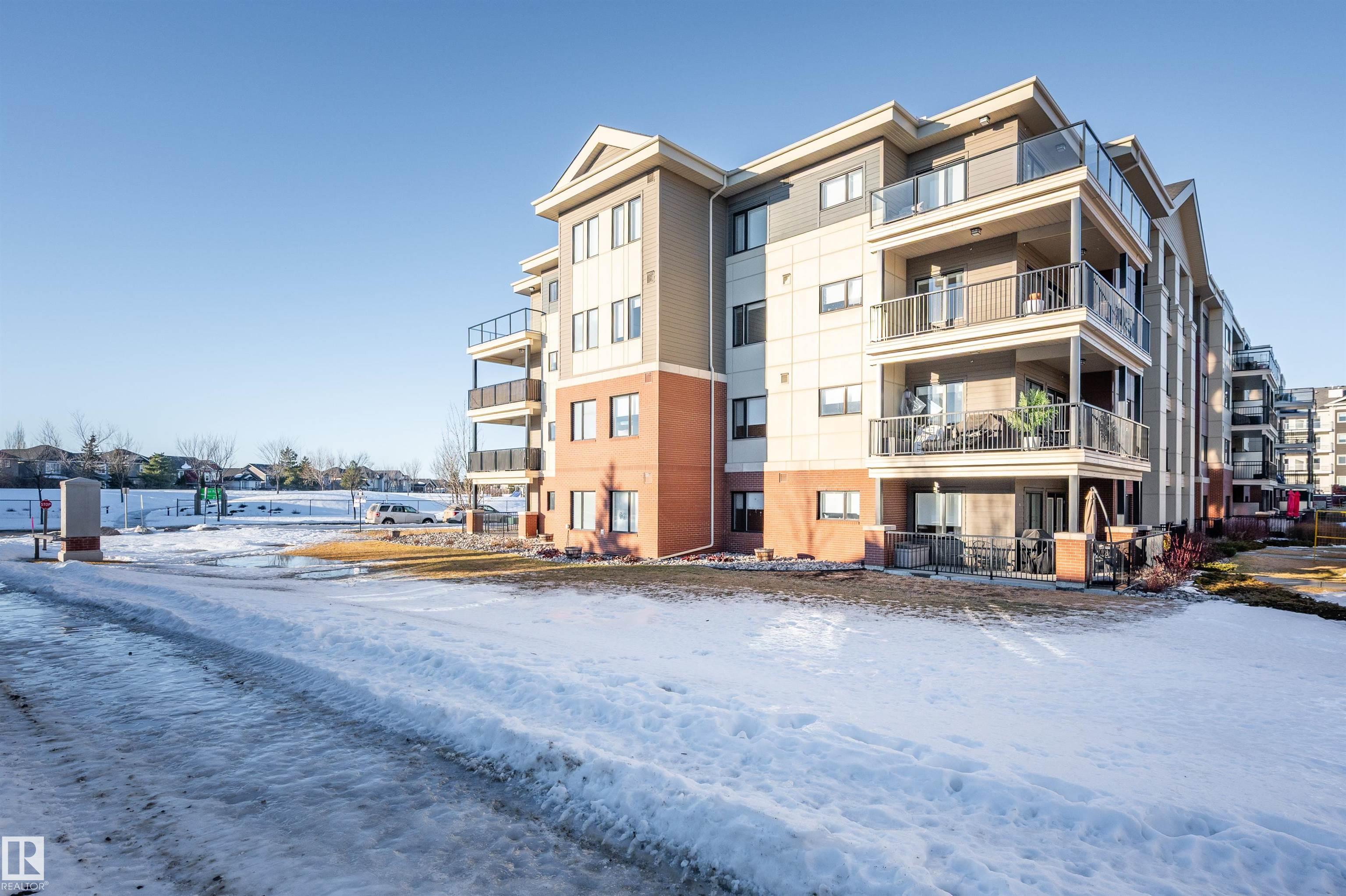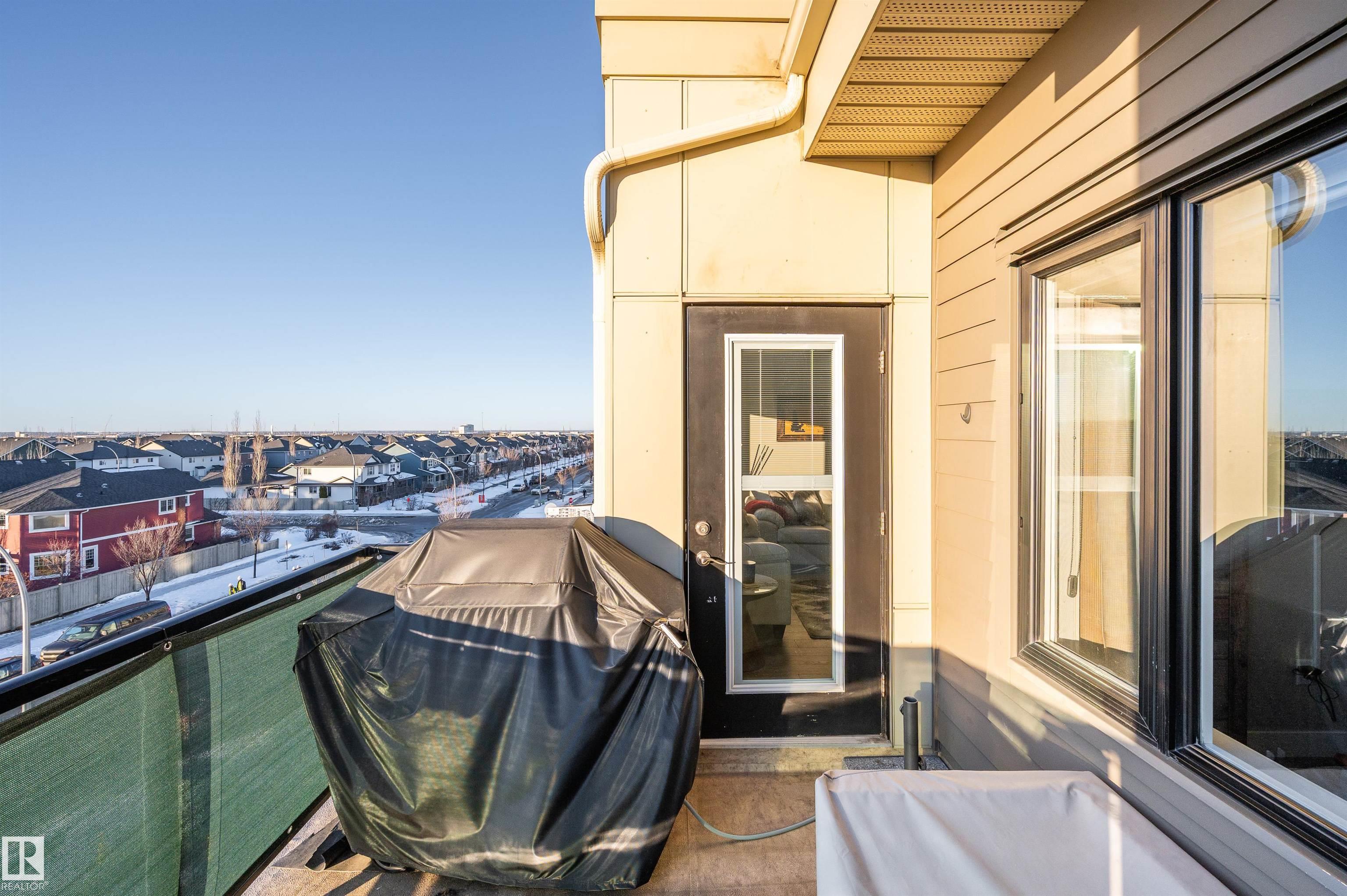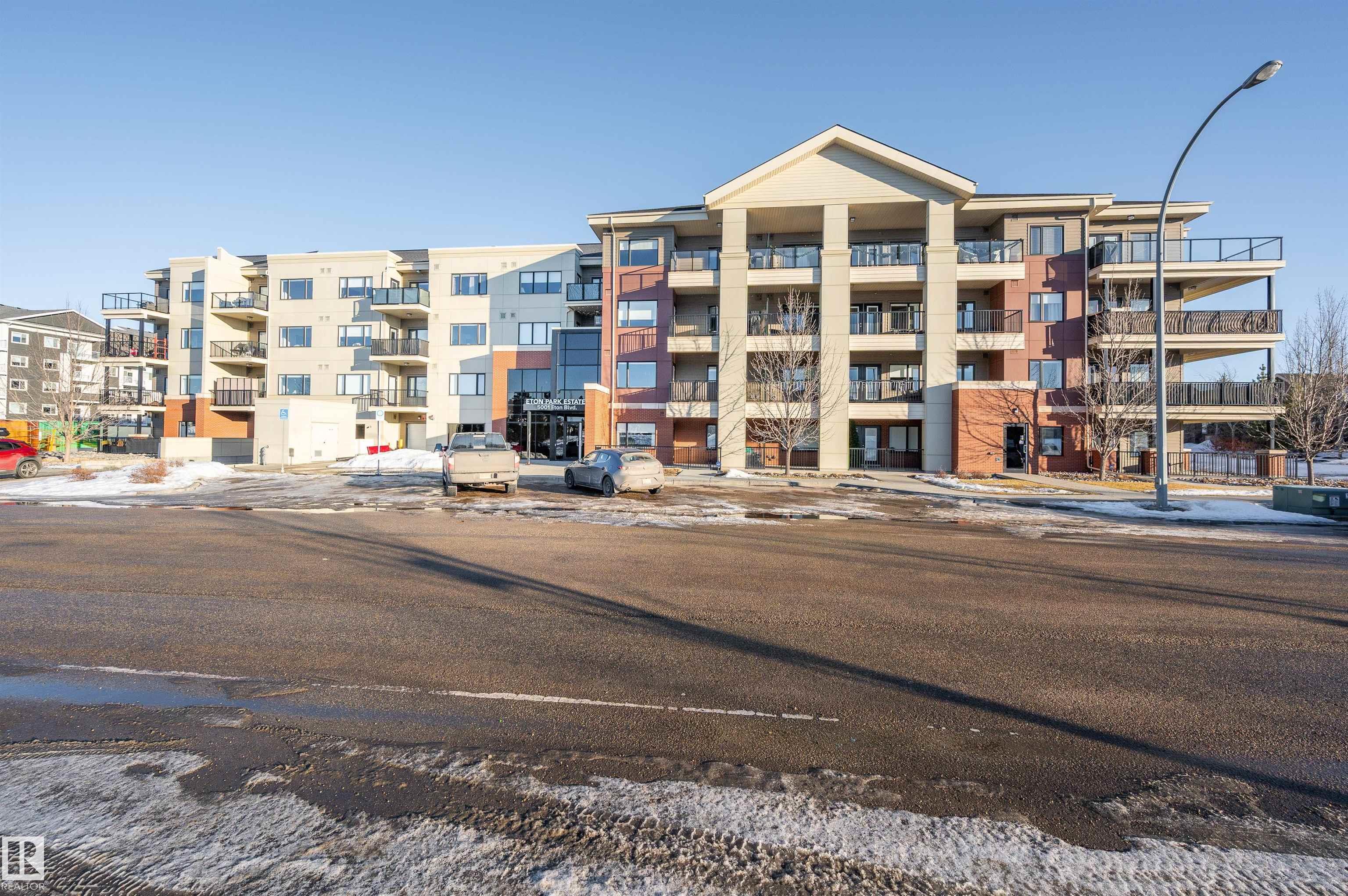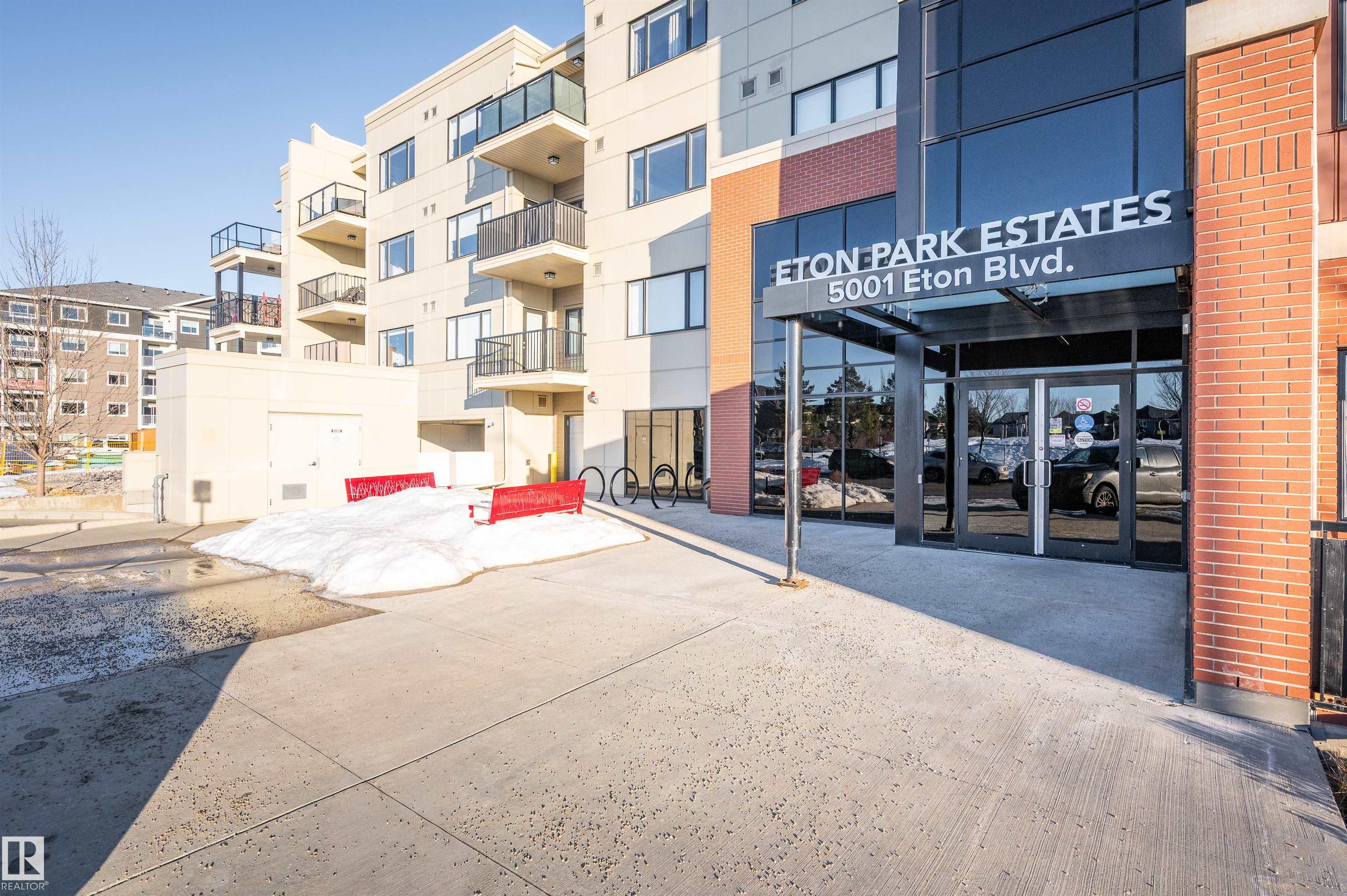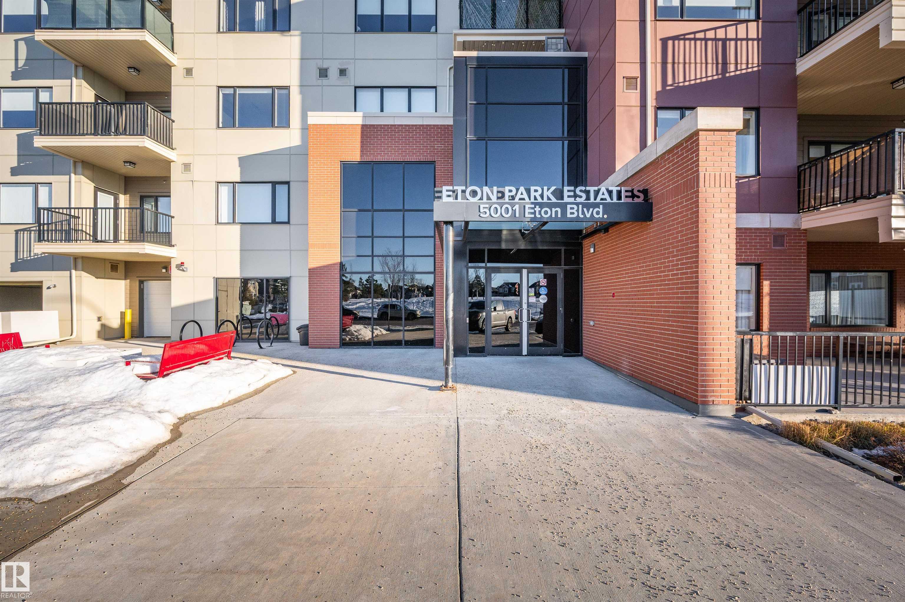 Welcome to this beautifully maintained top-floor condo offering comfort and convenience. Enjoy the covered patio overlooking Eton Park and green space?perfect for relaxing or entertaining. This air-conditioned unit features an open-concept layout with laminate flooring, one spacious bedroom, and a versatile den. The primary bedroom includes a 3-piece ensuite, while a 2-piece powder room houses in-suite front-load laundry, furnace, and A/C behind sliding doors. The modern kitchen offers granite countertops, stainless steel appliances, and an 8? peninsula island. The bright living room opens to a west-facing balcony with gas hookup. Building amenities include a fitness room and guest suite. One heated underground parking stall (#1) with storage cage (S47) is included. Condo fees cover all utilities except power and communications. Ideally located steps from walking trails, Emerald Hills Shopping Plaza, and the hospital?this is a must-see!