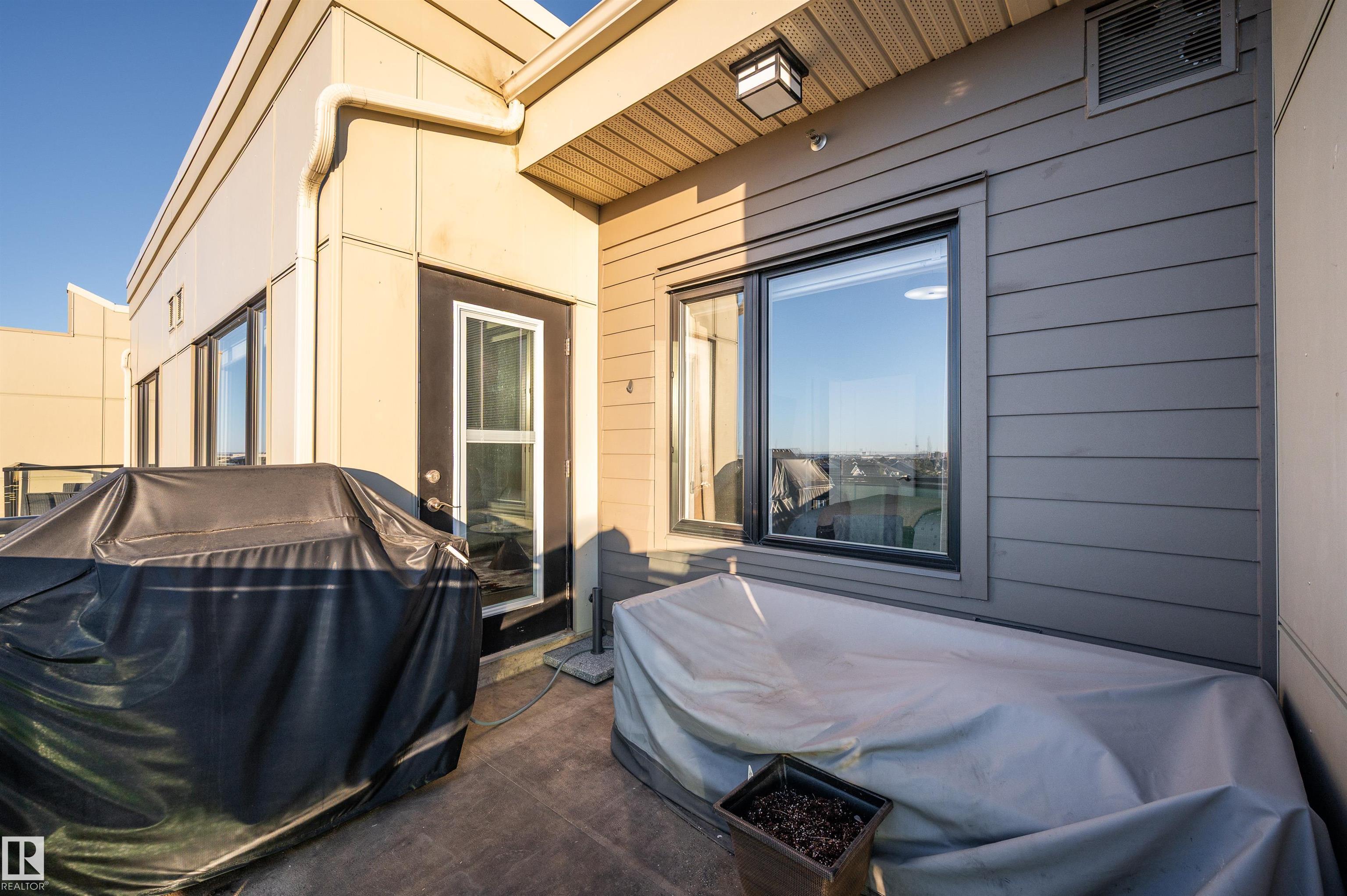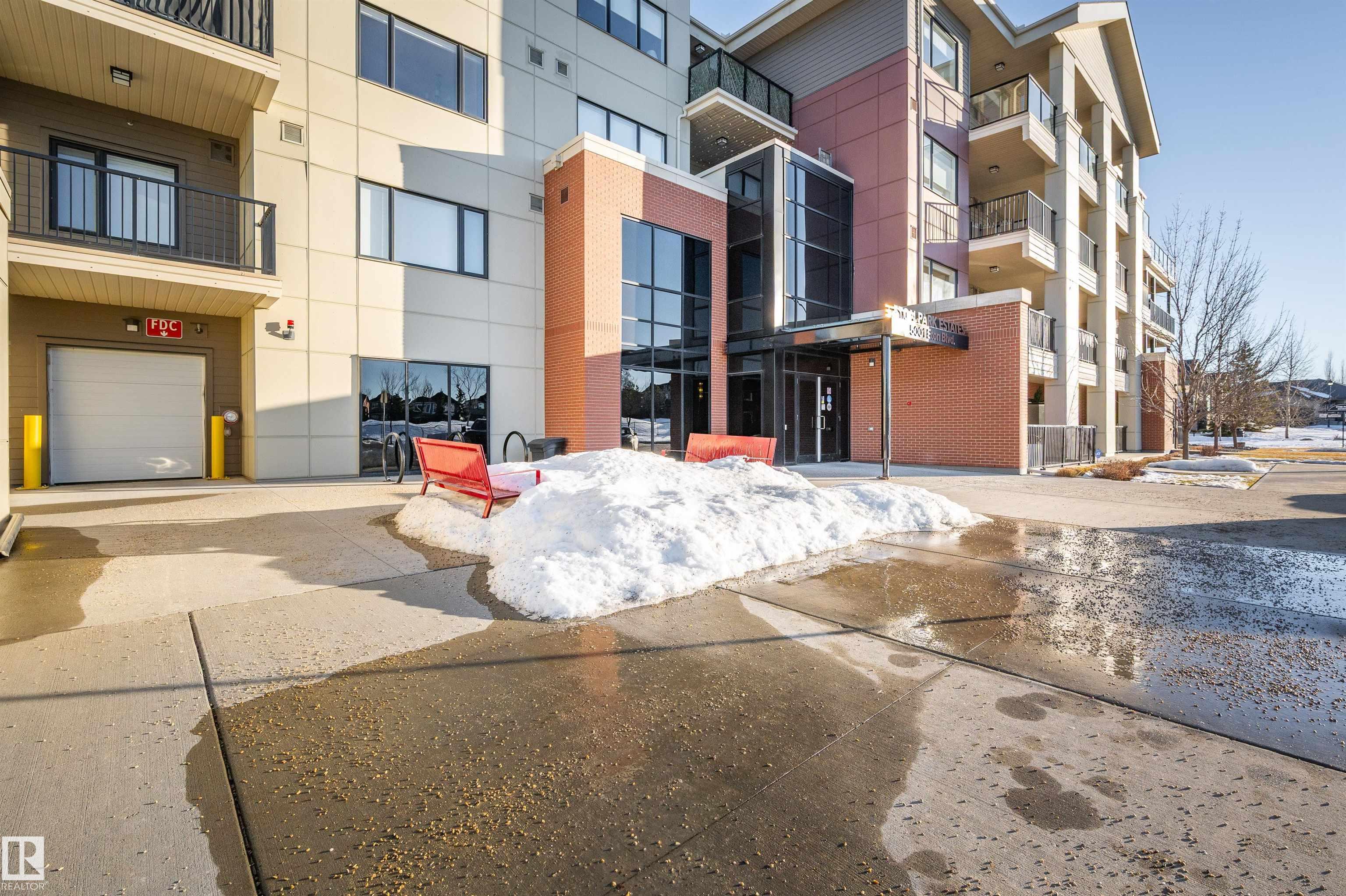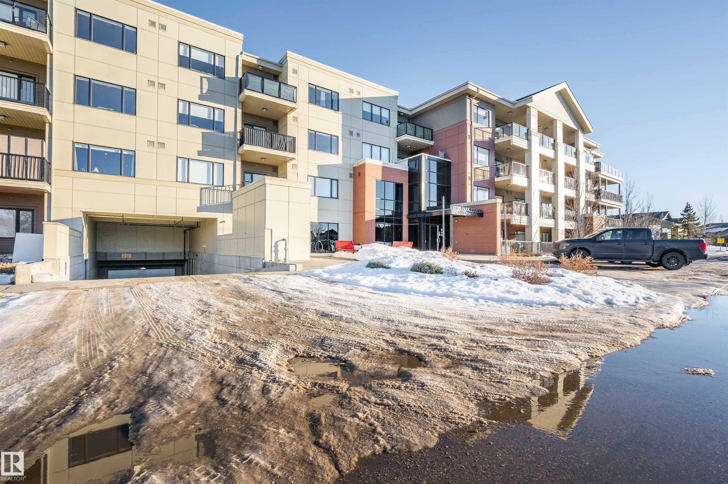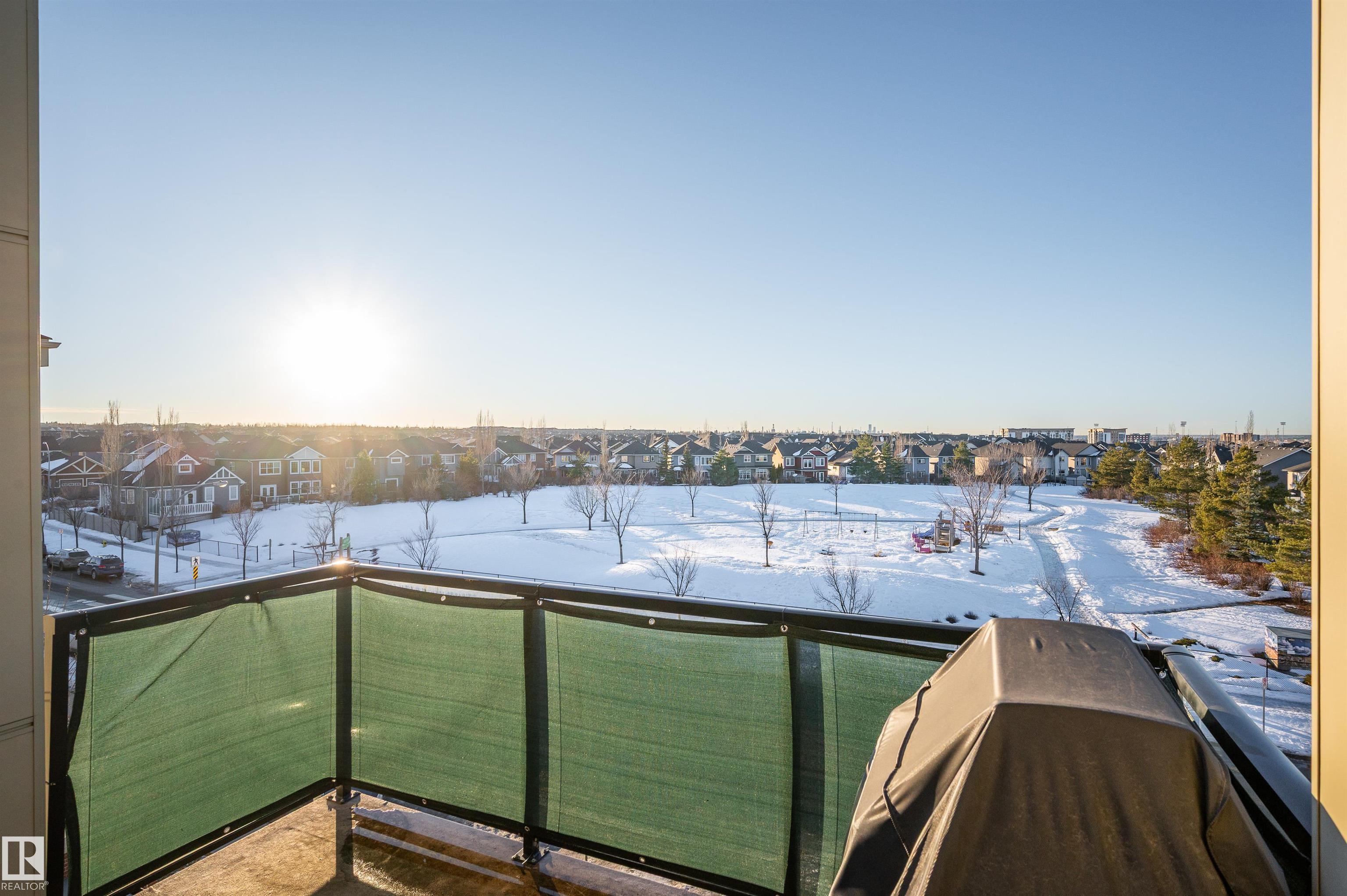 Welcome to this beautifully maintained top-floor condo offering comfort and convenience. Enjoy the covered patio overlooking Eton Park and green space?perfect for relaxing or entertaining. This air-conditioned unit features an open-concept layout with laminate flooring, one spacious bedroom, and a versatile den. The primary bedroom includes a 3-piece ensuite, while a 2-piece powder room houses in-suite front-load laundry, furnace, and A/C behind sliding doors. The modern kitchen offers granite countertops, stainless steel appliances, and an 8? peninsula island. The bright living room opens to a west-facing balcony with gas hookup. Building amenities include a fitness room and guest suite. One heated underground parking stall (#1) with storage cage (S47) is included. Condo fees cover all utilities except power and communications. Ideally located steps from walking trails, Emerald Hills Shopping Plaza, and the hospital?this is a must-see!