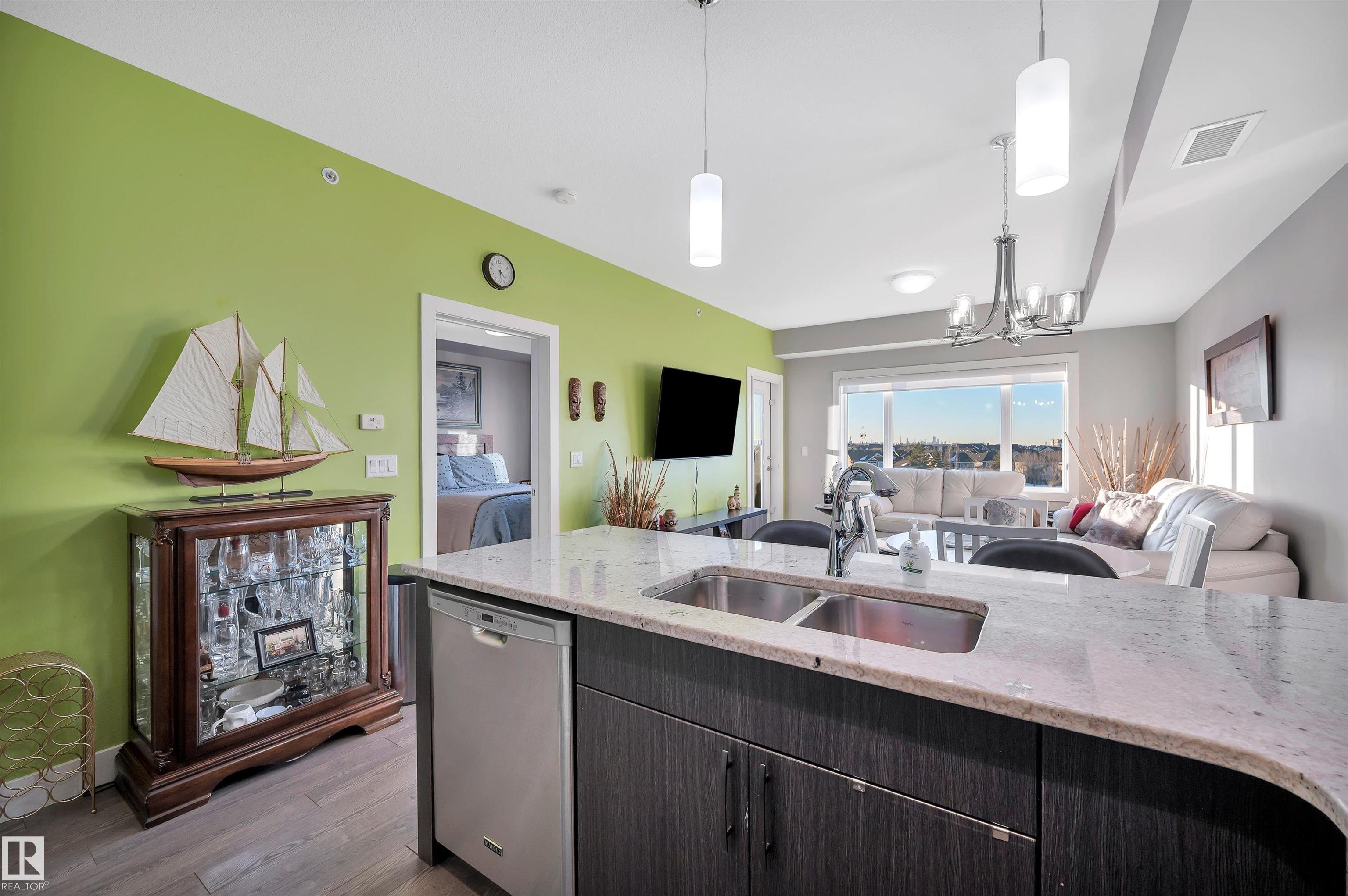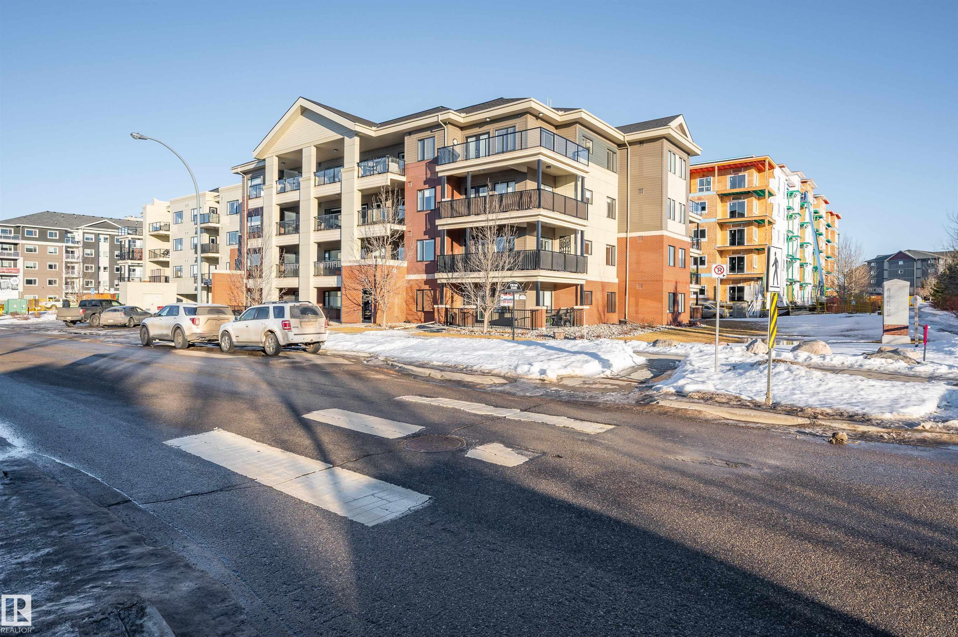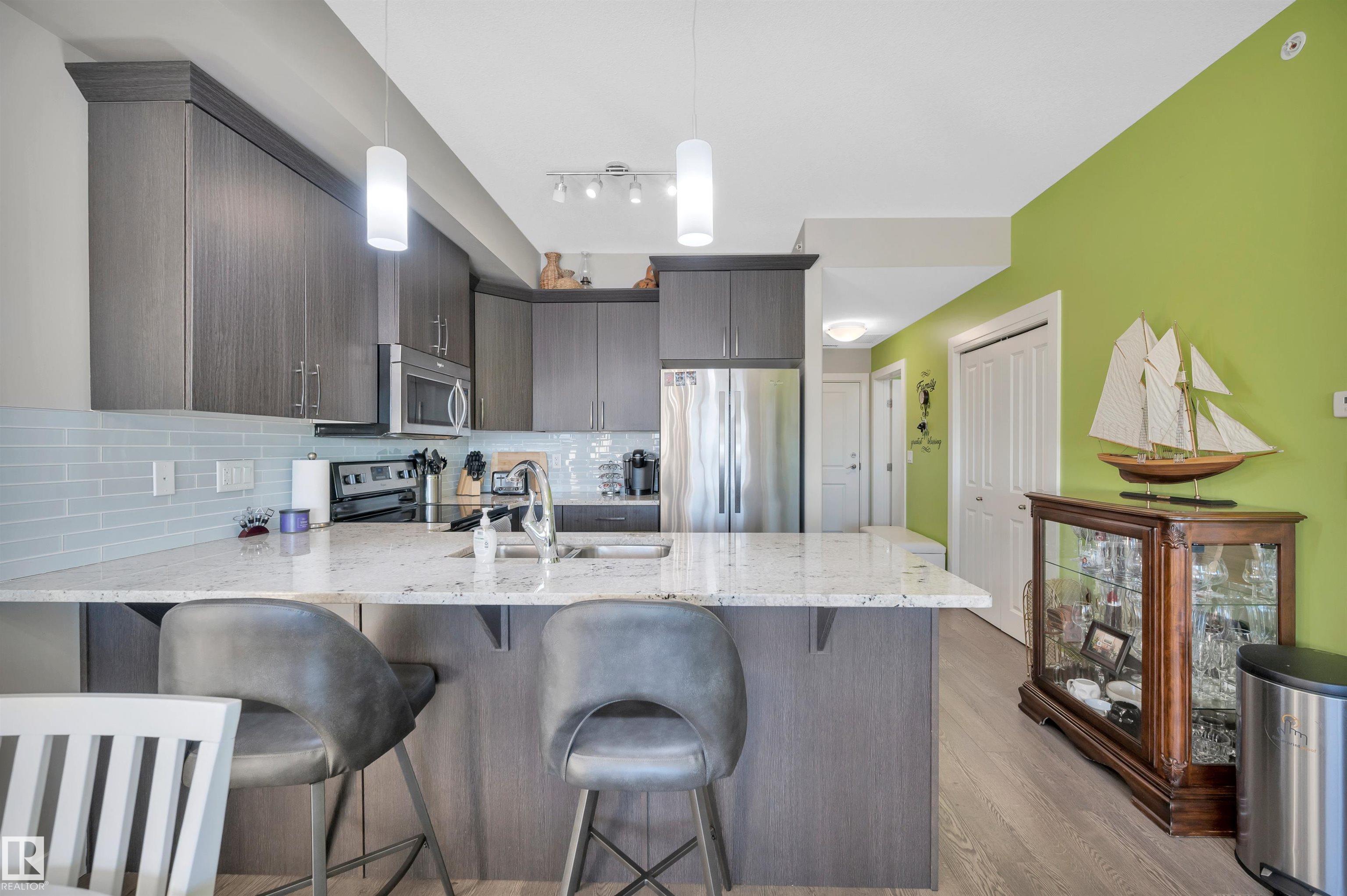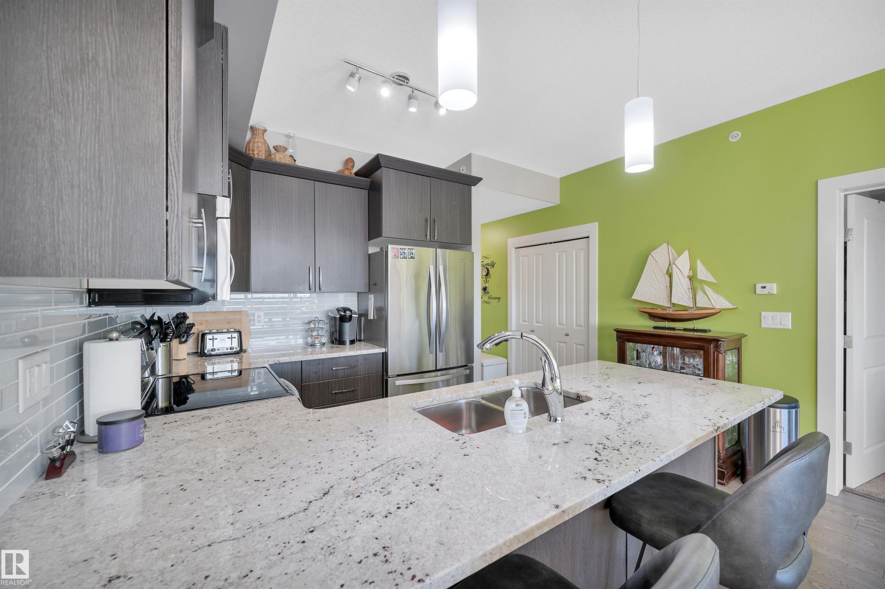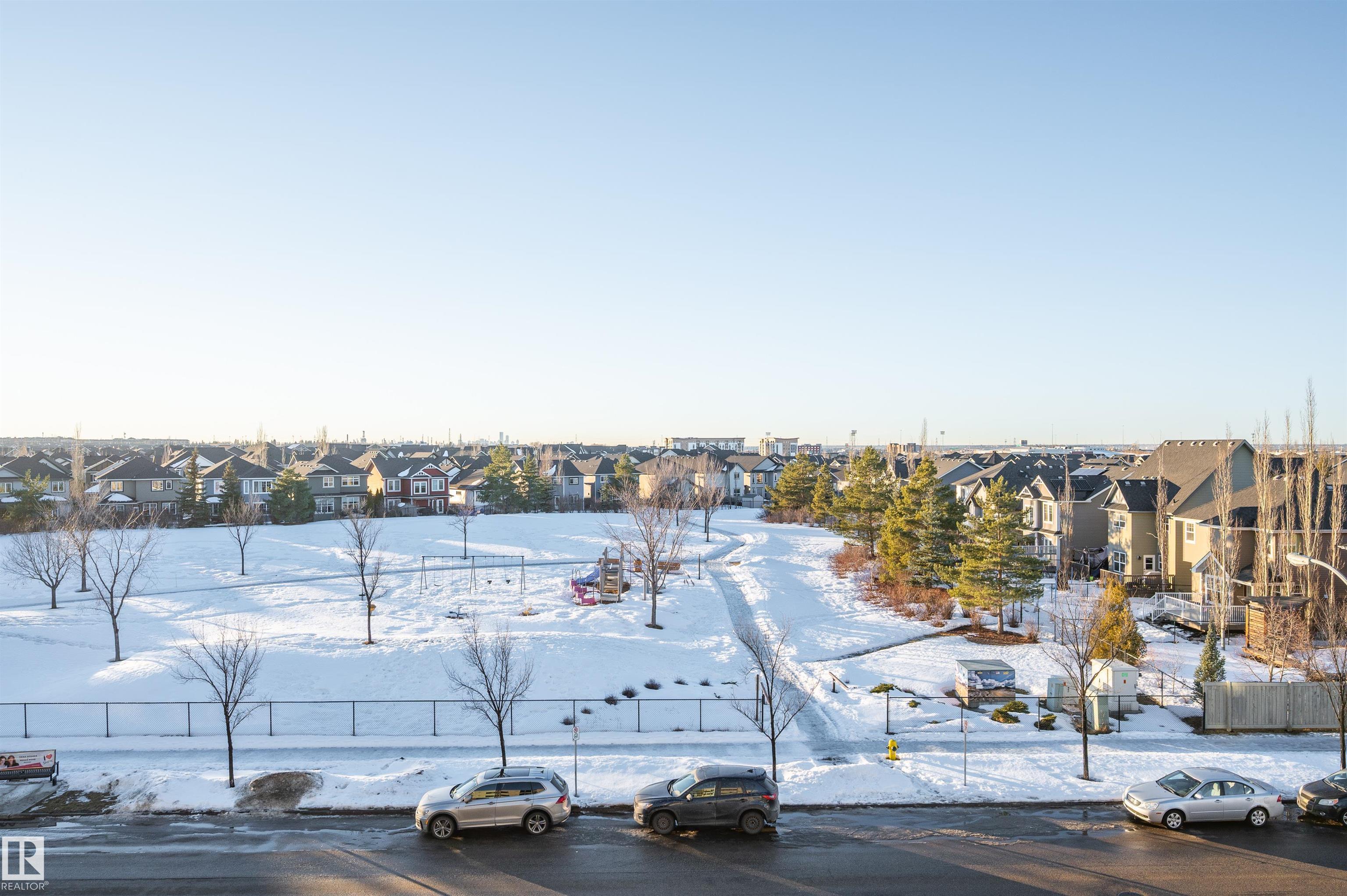 Welcome to this beautifully maintained top-floor condo offering comfort and convenience. Enjoy the covered patio overlooking Eton Park and green space?perfect for relaxing or entertaining. This air-conditioned unit features an open-concept layout with laminate flooring, one spacious bedroom, and a versatile den. The primary bedroom includes a 3-piece ensuite, while a 2-piece powder room houses in-suite front-load laundry, furnace, and A/C behind sliding doors. The modern kitchen offers granite countertops, stainless steel appliances, and an 8? peninsula island. The bright living room opens to a west-facing balcony with gas hookup. Building amenities include a fitness room and guest suite. One heated underground parking stall (#1) with storage cage (S47) is included. Condo fees cover all utilities except power and communications. Ideally located steps from walking trails, Emerald Hills Shopping Plaza, and the hospital?this is a must-see!