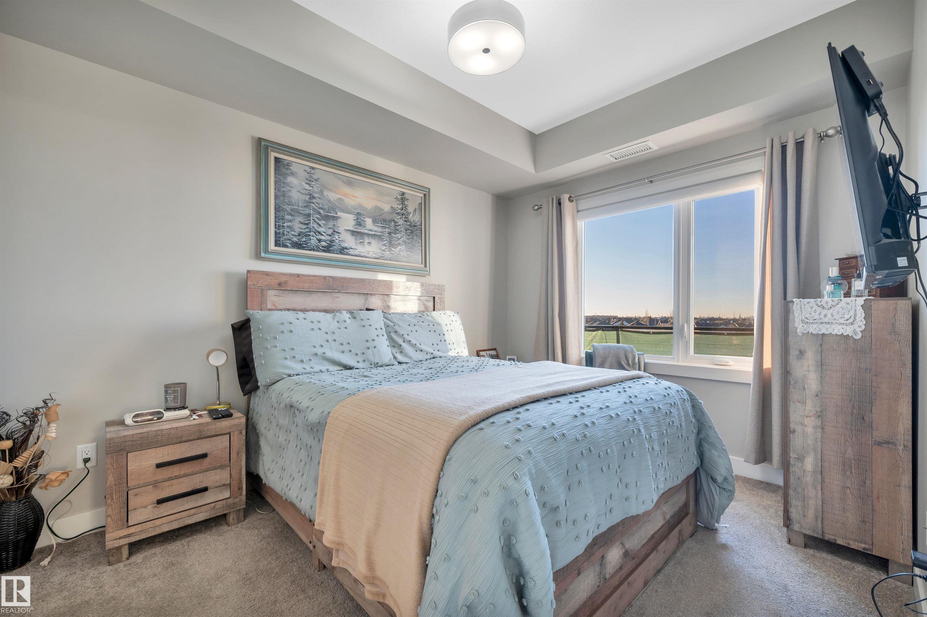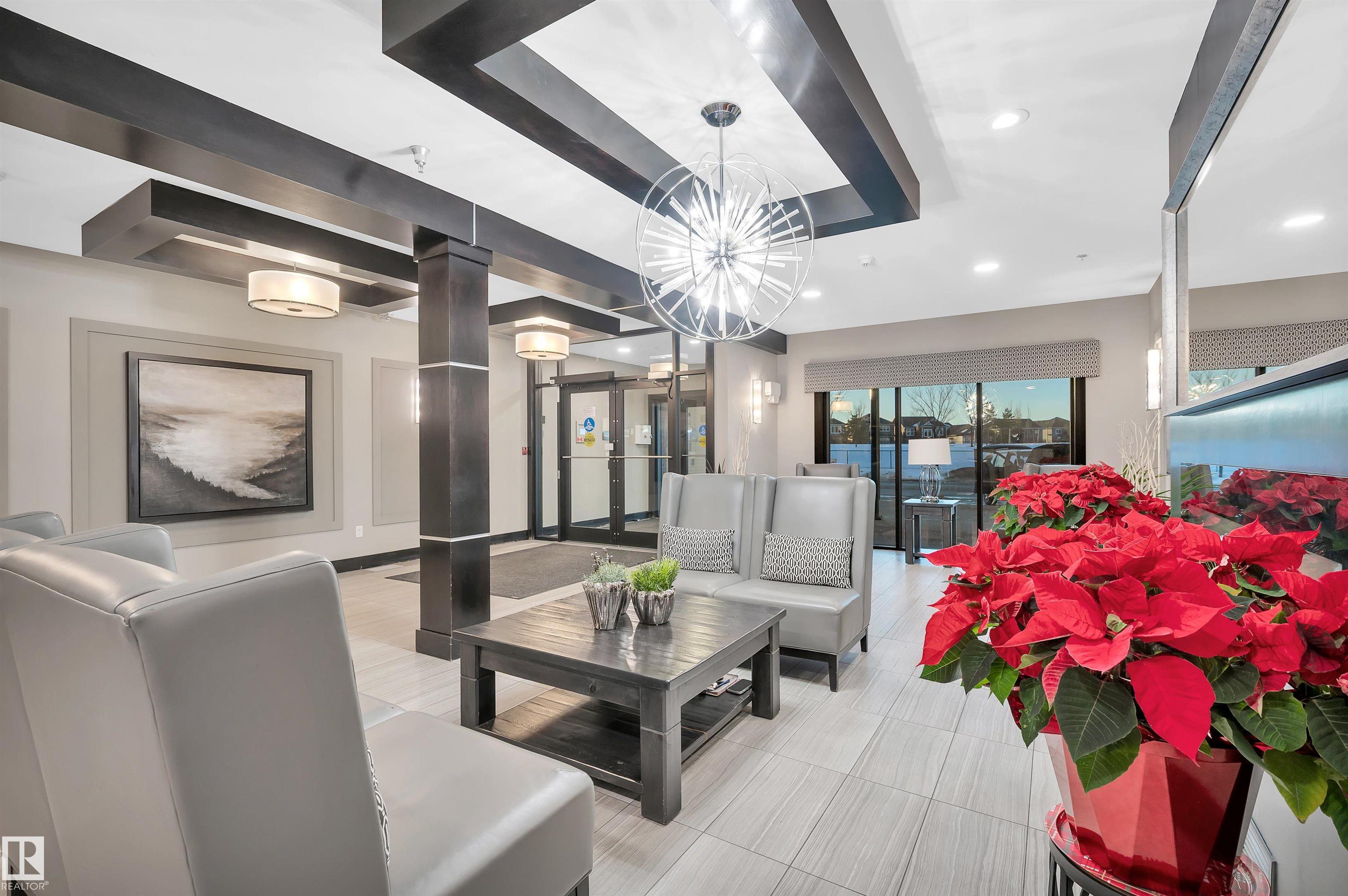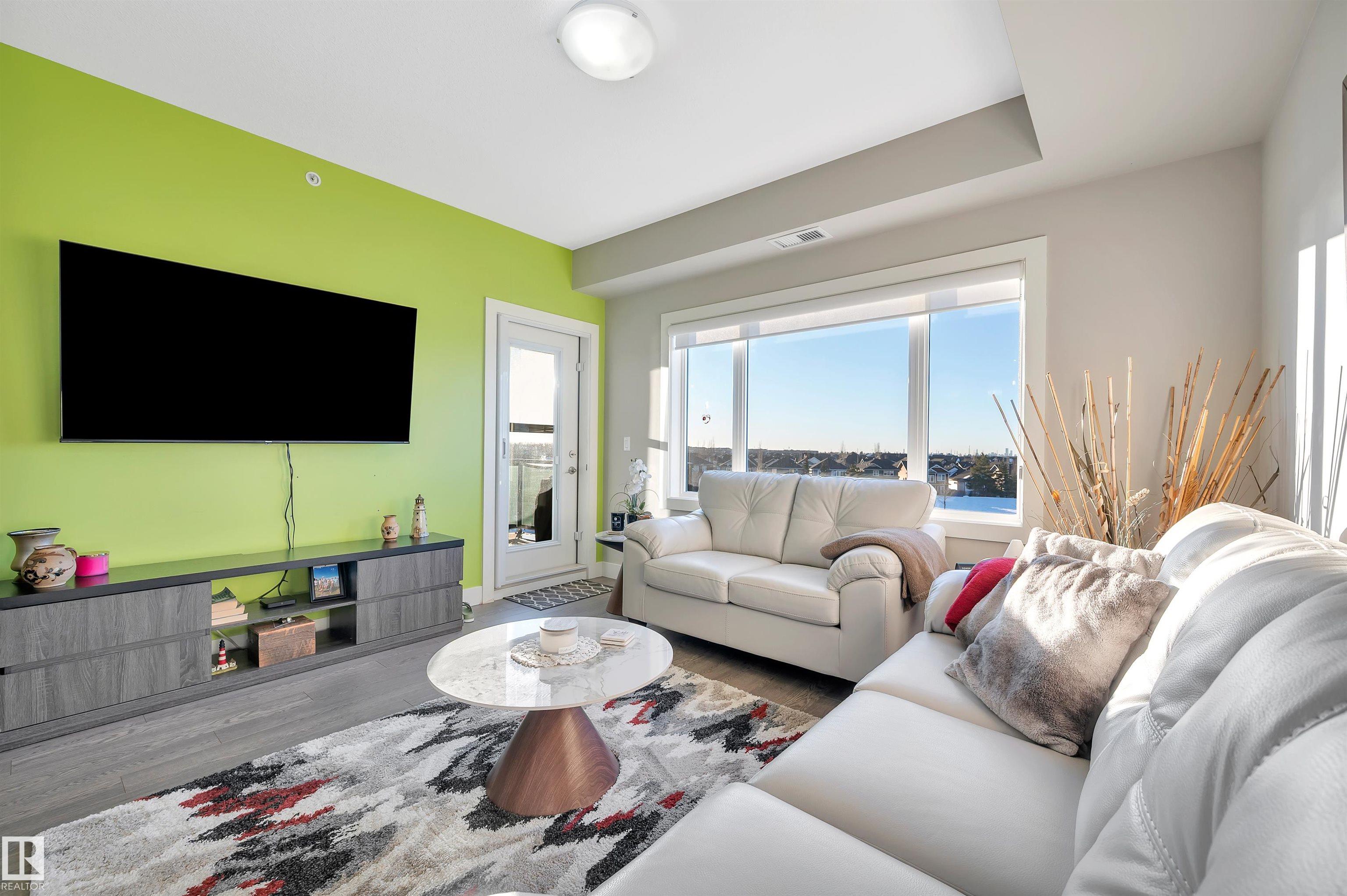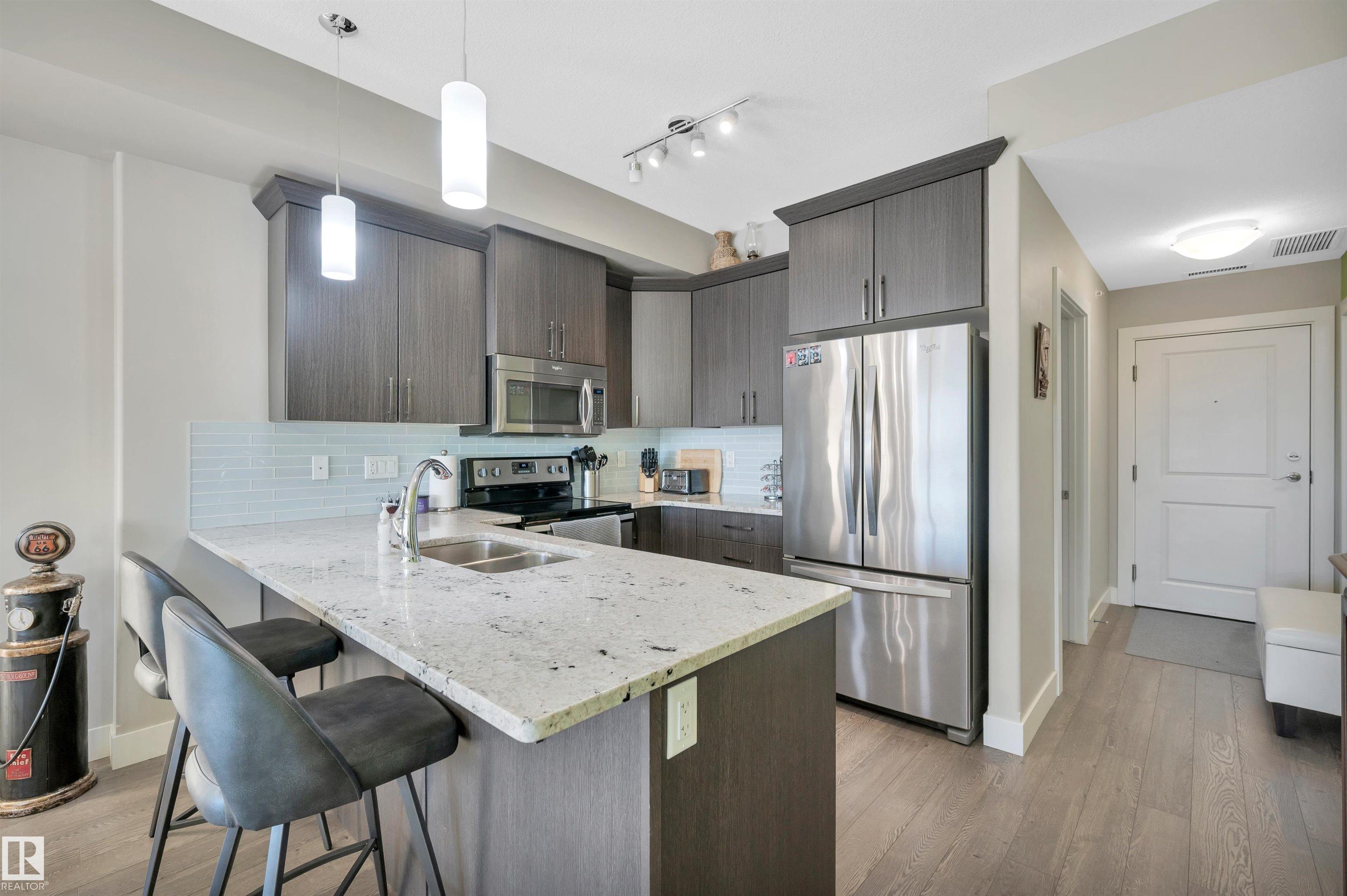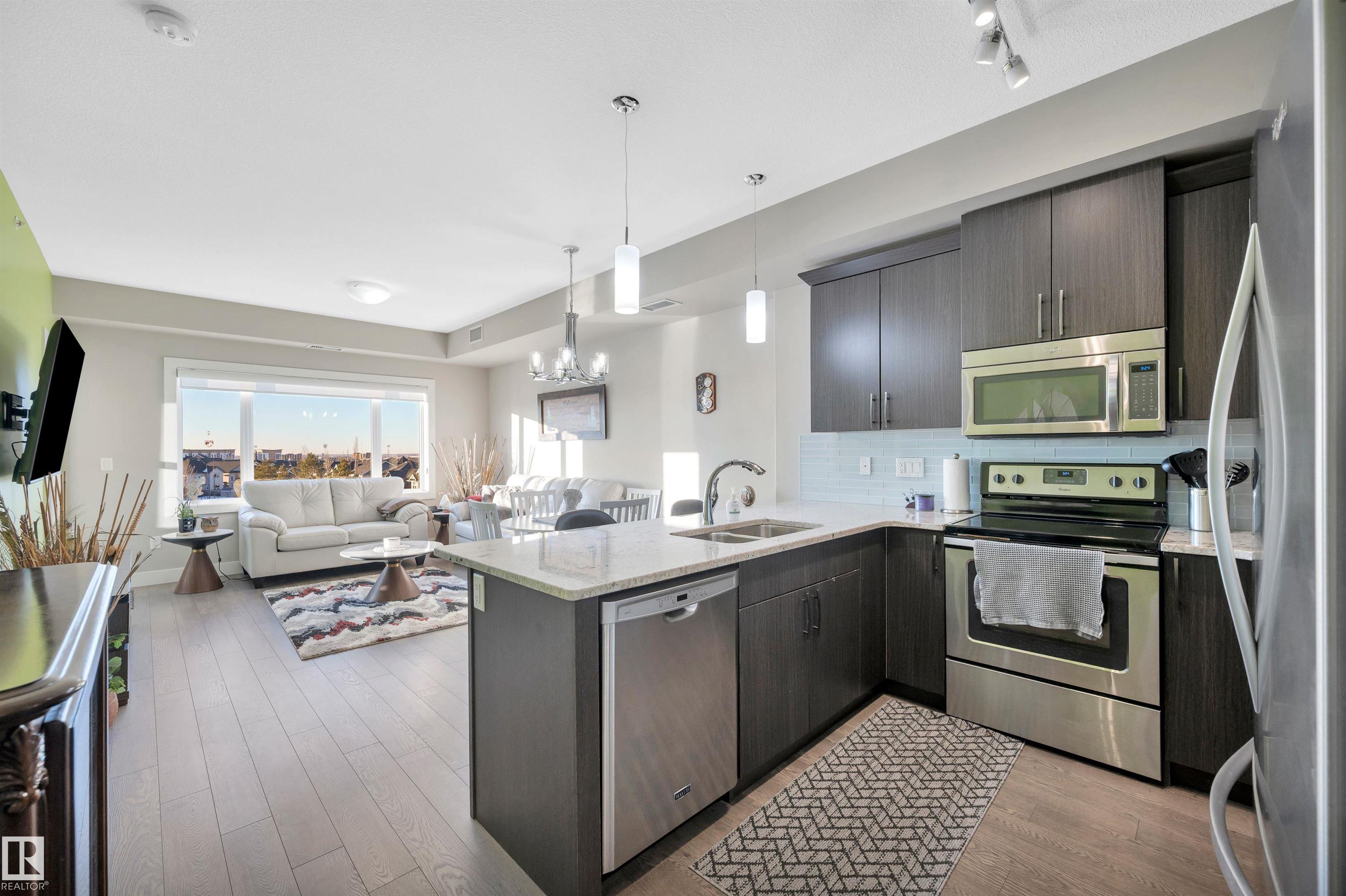 Welcome to this beautifully maintained top-floor condo offering comfort and convenience. Enjoy the covered patio overlooking Eton Park and green space?perfect for relaxing or entertaining. This air-conditioned unit features an open-concept layout with laminate flooring, one spacious bedroom, and a versatile den. The primary bedroom includes a 3-piece ensuite, while a 2-piece powder room houses in-suite front-load laundry, furnace, and A/C behind sliding doors. The modern kitchen offers granite countertops, stainless steel appliances, and an 8? peninsula island. The bright living room opens to a west-facing balcony with gas hookup. Building amenities include a fitness room and guest suite. One heated underground parking stall (#1) with storage cage (S47) is included. Condo fees cover all utilities except power and communications. Ideally located steps from walking trails, Emerald Hills Shopping Plaza, and the hospital?this is a must-see!