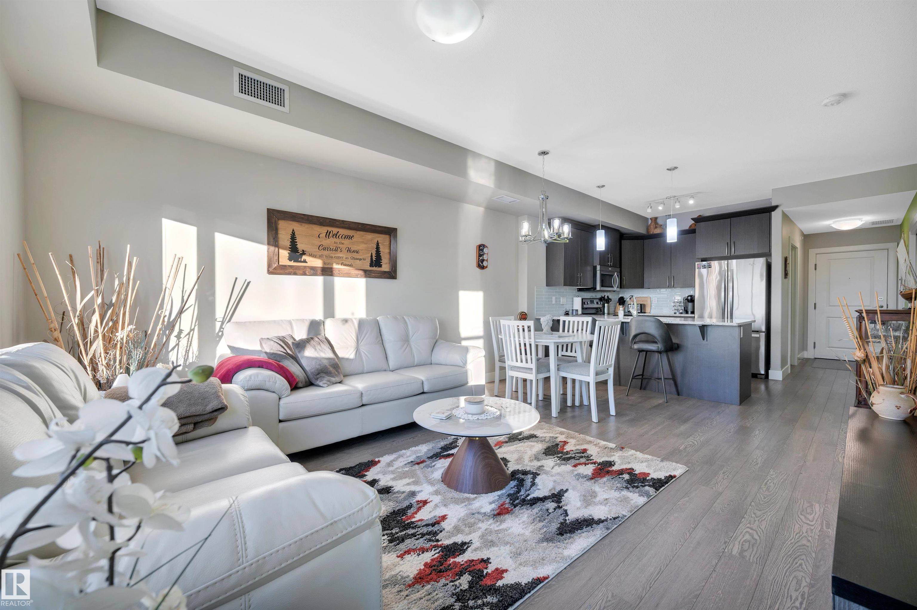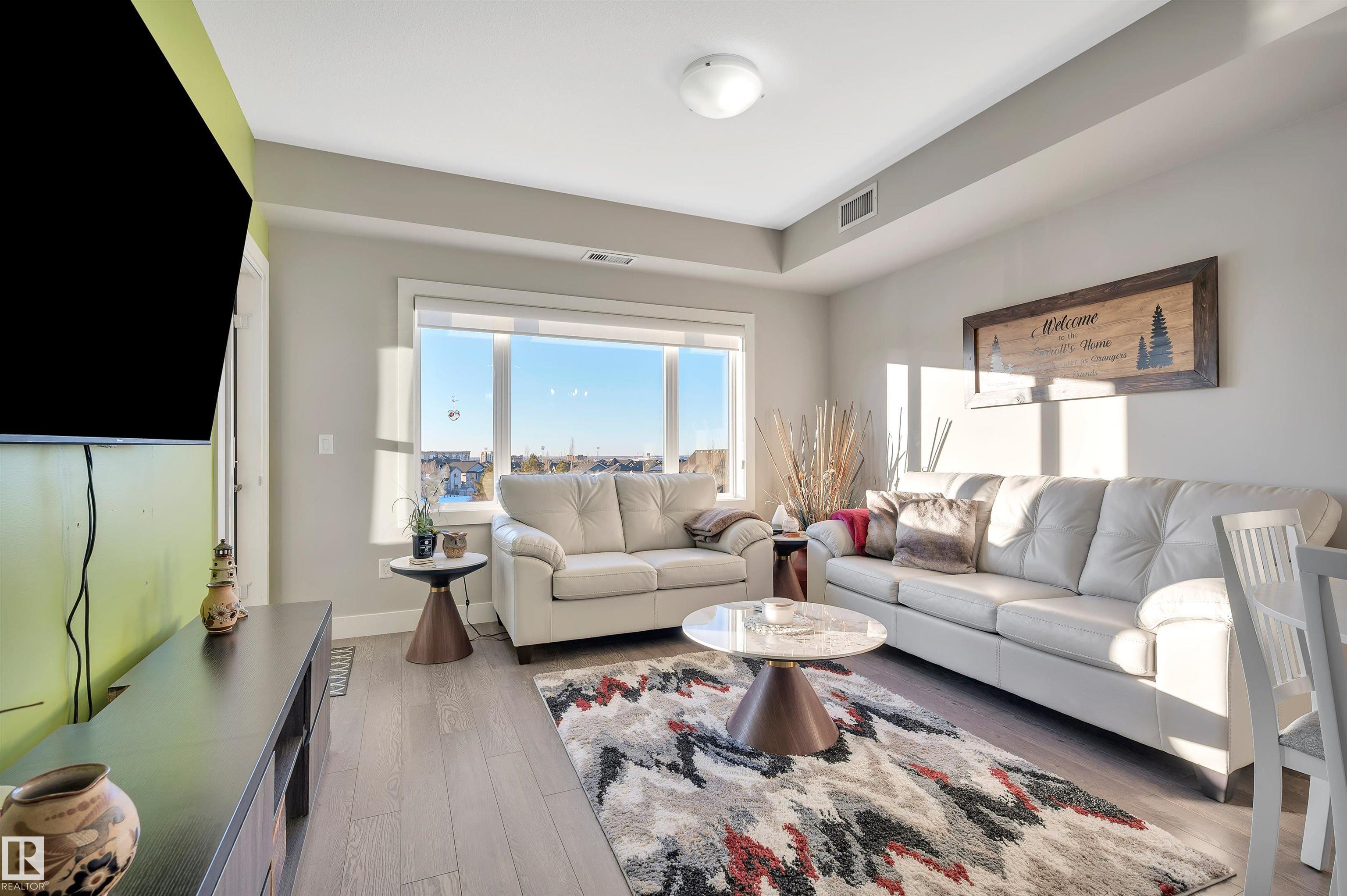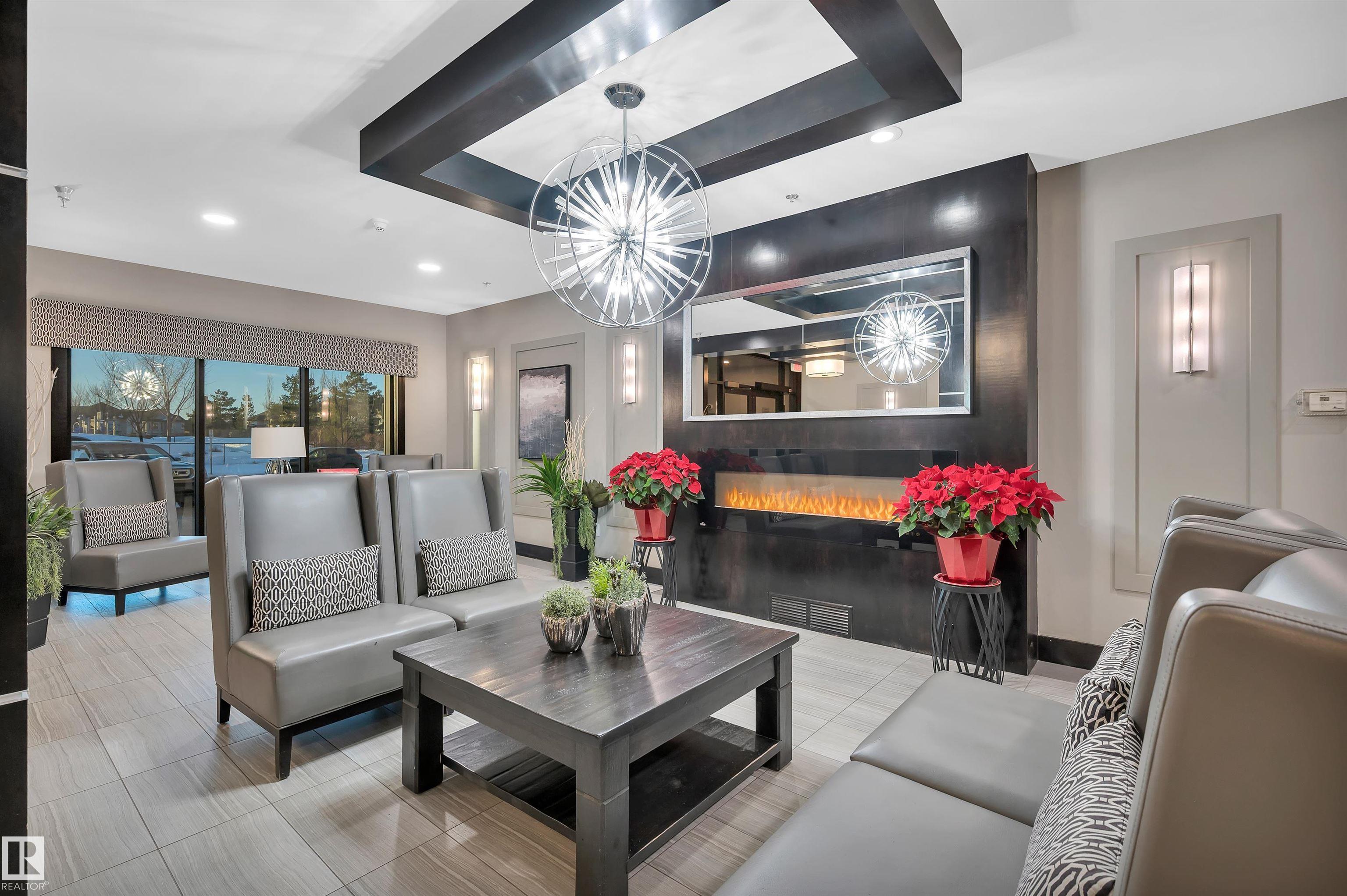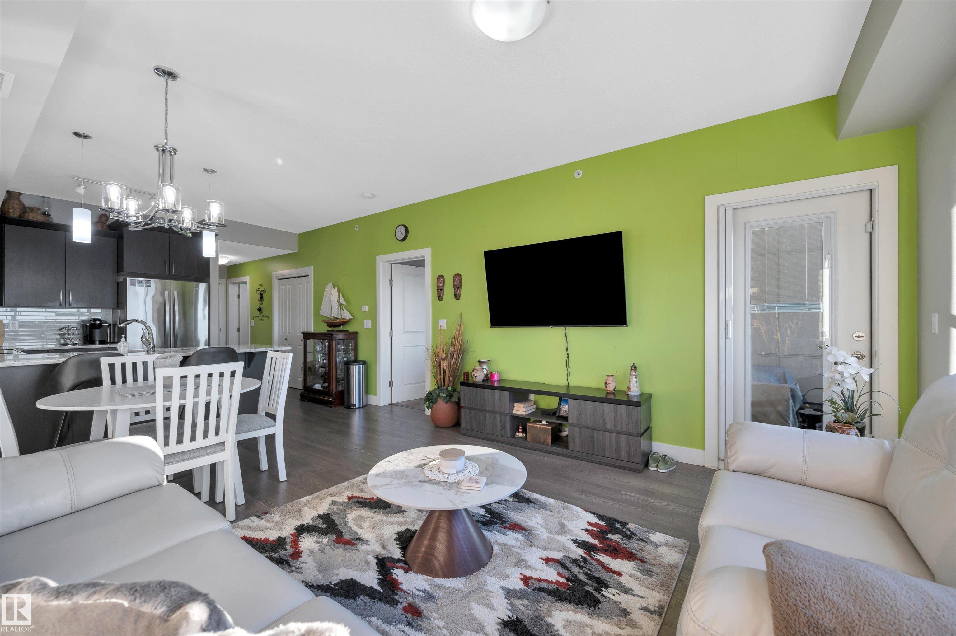 Welcome to this beautifully maintained top-floor condo offering comfort and convenience. Enjoy the covered patio overlooking Eton Park and green space?perfect for relaxing or entertaining. This air-conditioned unit features an open-concept layout with laminate flooring, one spacious bedroom, and a versatile den. The primary bedroom includes a 3-piece ensuite, while a 2-piece powder room houses in-suite front-load laundry, furnace, and A/C behind sliding doors. The modern kitchen offers granite countertops, stainless steel appliances, and an 8? peninsula island. The bright living room opens to a west-facing balcony with gas hookup. Building amenities include a fitness room and guest suite. One heated underground parking stall (#1) with storage cage (S47) is included. Condo fees cover all utilities except power and communications. Ideally located steps from walking trails, Emerald Hills Shopping Plaza, and the hospital?this is a must-see!