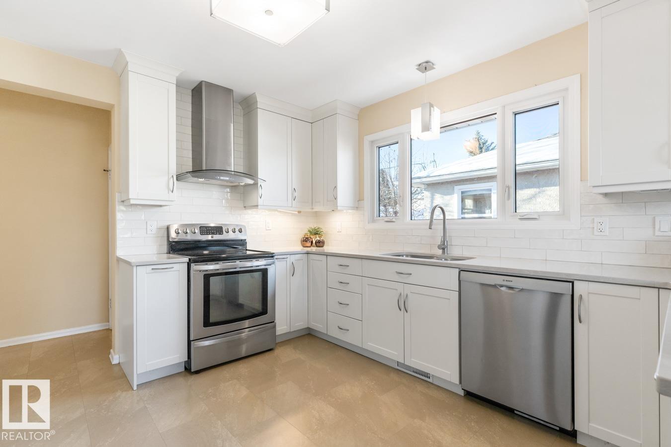 STUNNING STRATHEARN DRIVE! RENOVATED Kitchen w/ white Cabinetry, Quartz Counters, STAINLESS STEEL APPLIANCES & ample storage. Main Floor features beautiful Hardwood Flooring & is CARPET-FREE! Lots of character found throughout - Curved Walls, Coved Ceilings & a Laundry Chute. Partly Finished Basement includes Separate Entrance, Rec Room, 2 additional Bedrooms & storage room or workshop. Updates over the years: Windows, Roof, Furnace, Electrical Panel & Garage. LARGE DETACHED GARAGE can fit 3 vehicles (23'3" x 27'4", 636 sq ft). Lovely landscaping w/ Poppies, Lilacs, Roses, Raspberries & Perennials. Urban Location. Quiet Neighborhood. LRT, Trails, Parks, Folk Fest, Ski Club, Tobogganing, Muttart & Cafes are all close by. Schools are nearby including Faculty St. Jean. Active Community League & Skating Rink in the area. Quick commute to Downtown & University of Alberta by car, bike or transit. Same Owner for 43 yrs has lovingly cared for the home. Pride of ownership evident!