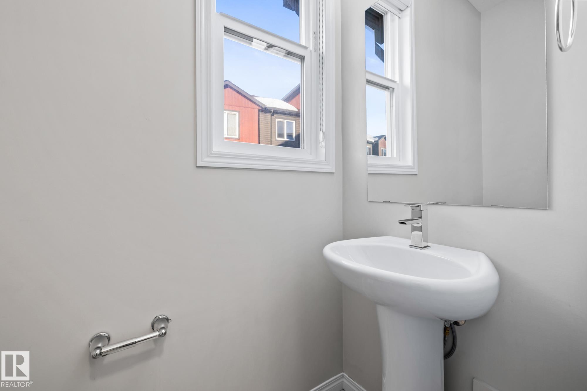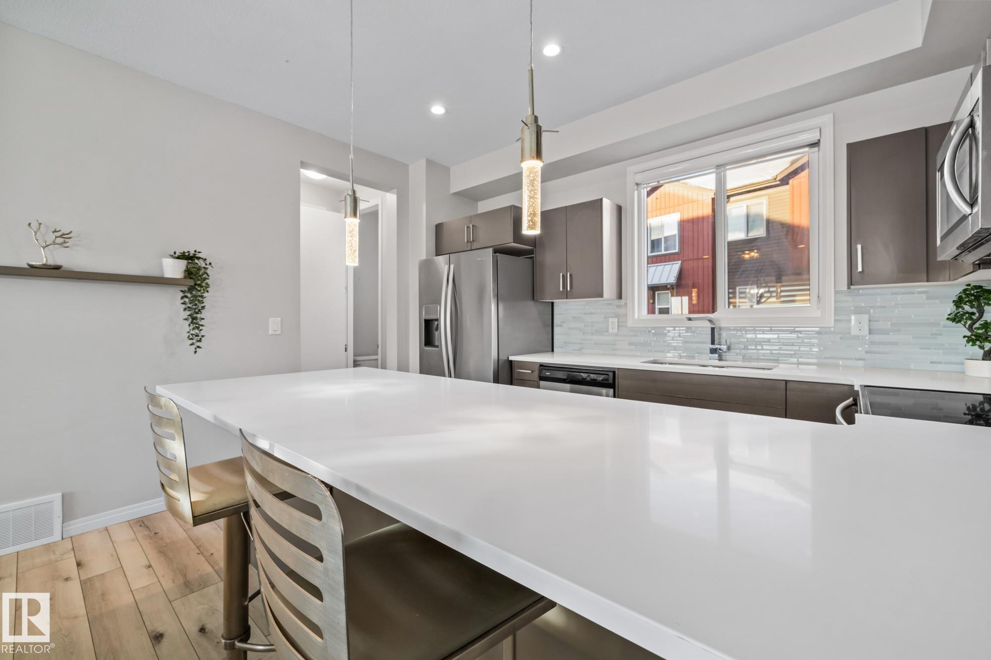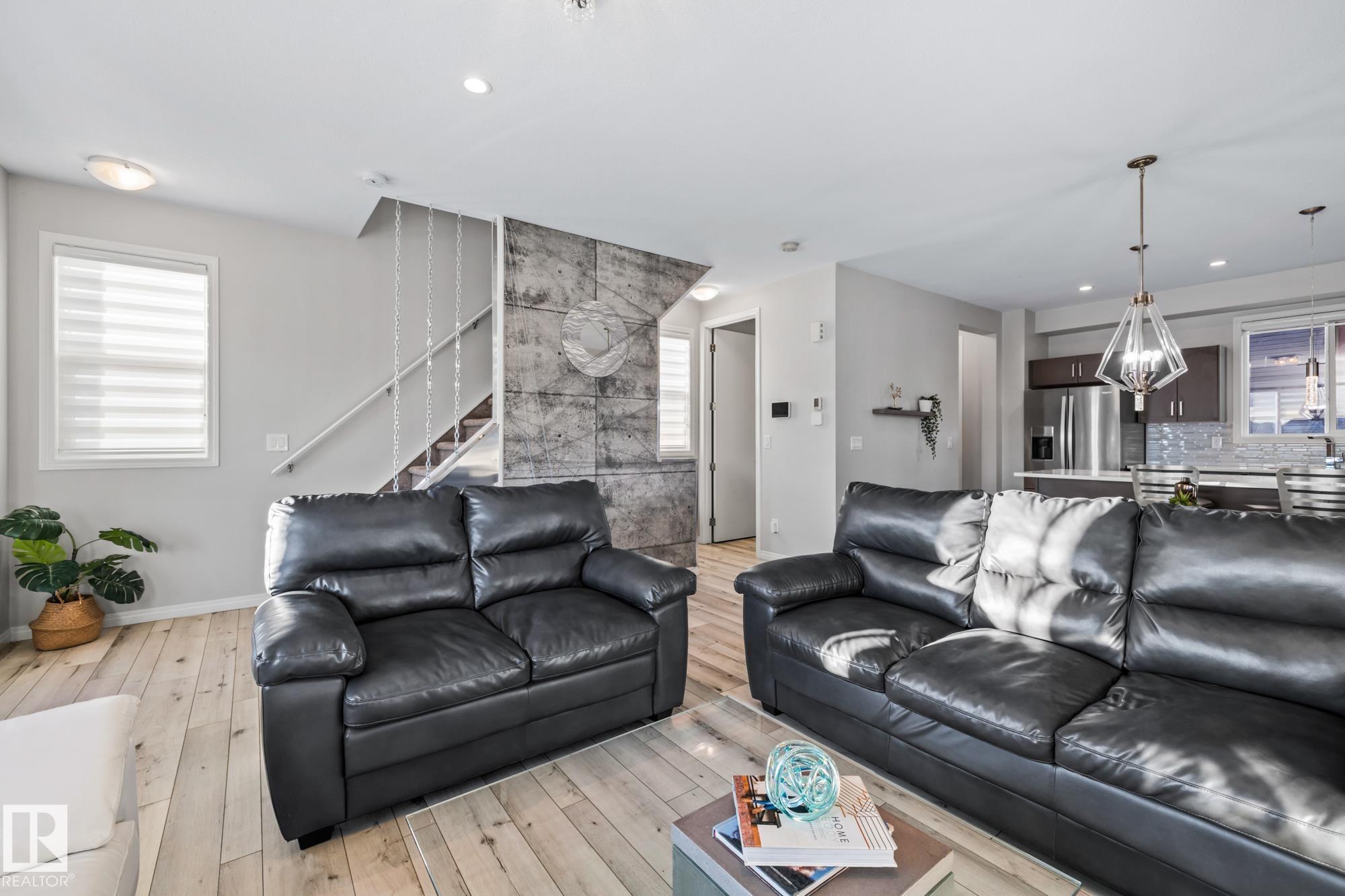 Discover modern industrial living in this stunning 1,544 sq. ft. end-unit townhouse in the beautiful Schonsee neighbourhood. This bright, sun-drenched home features an open-concept layout with 9' ceilings and a thoughtfully upgraded feature wall. The functional floor plan offers three spacious bedrooms plus a versatile den, including a primary retreat with a 3-pc ensuite. Enjoy the convenience of main floor laundry, a large pantry, and a 2-pc powder room. Step outside onto your private east-facing balcony to take in serene pond views. Utilize the double attached garage and nearby visitor parking. Perfectly positioned for ease of living, you are minutes away from major commuter routes, premium shopping, and essential commercial amenities. This 3-storey gem perfectly balances style, comfort, and a prime location.