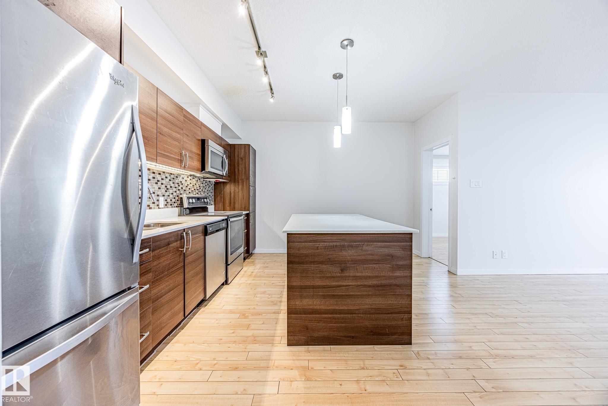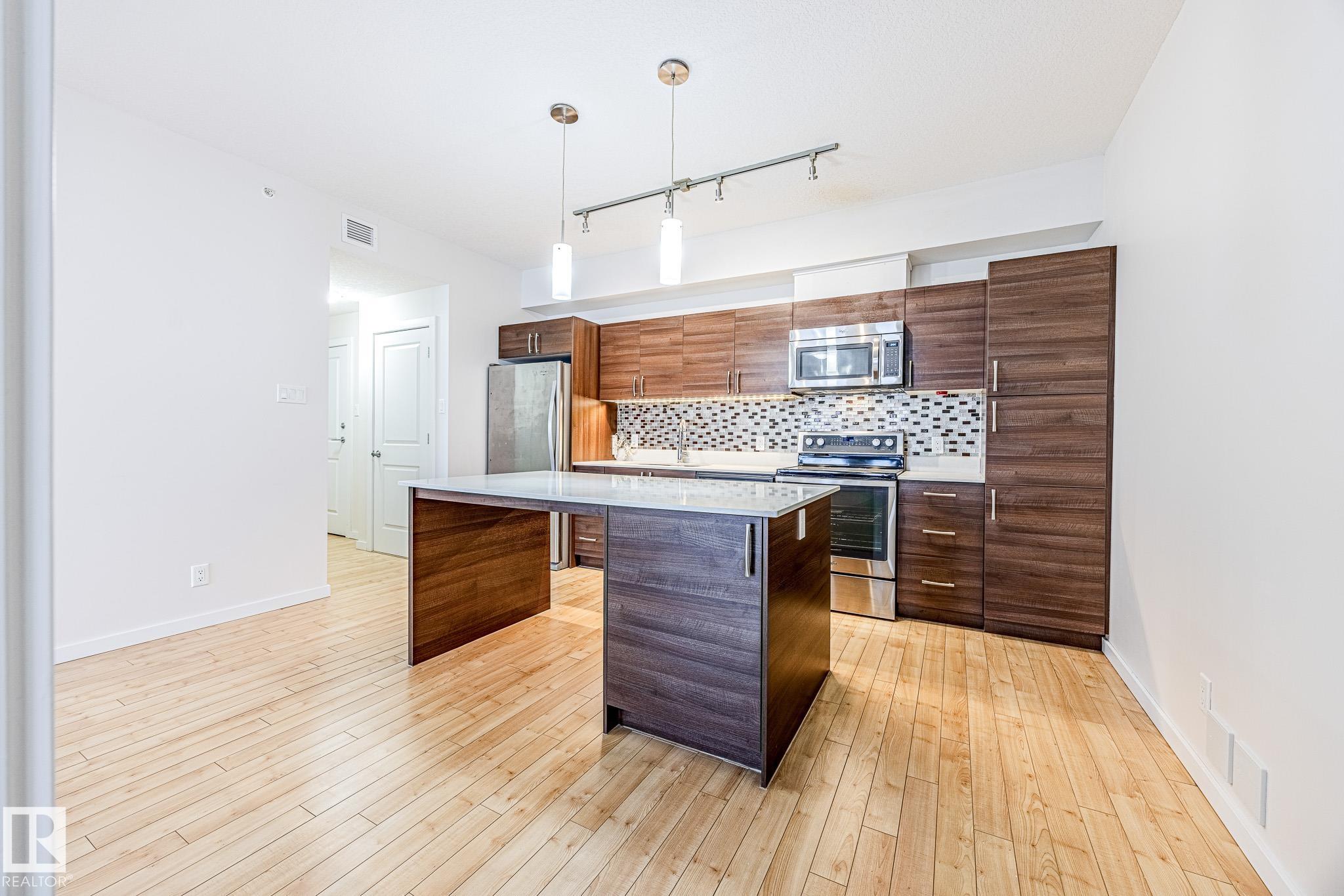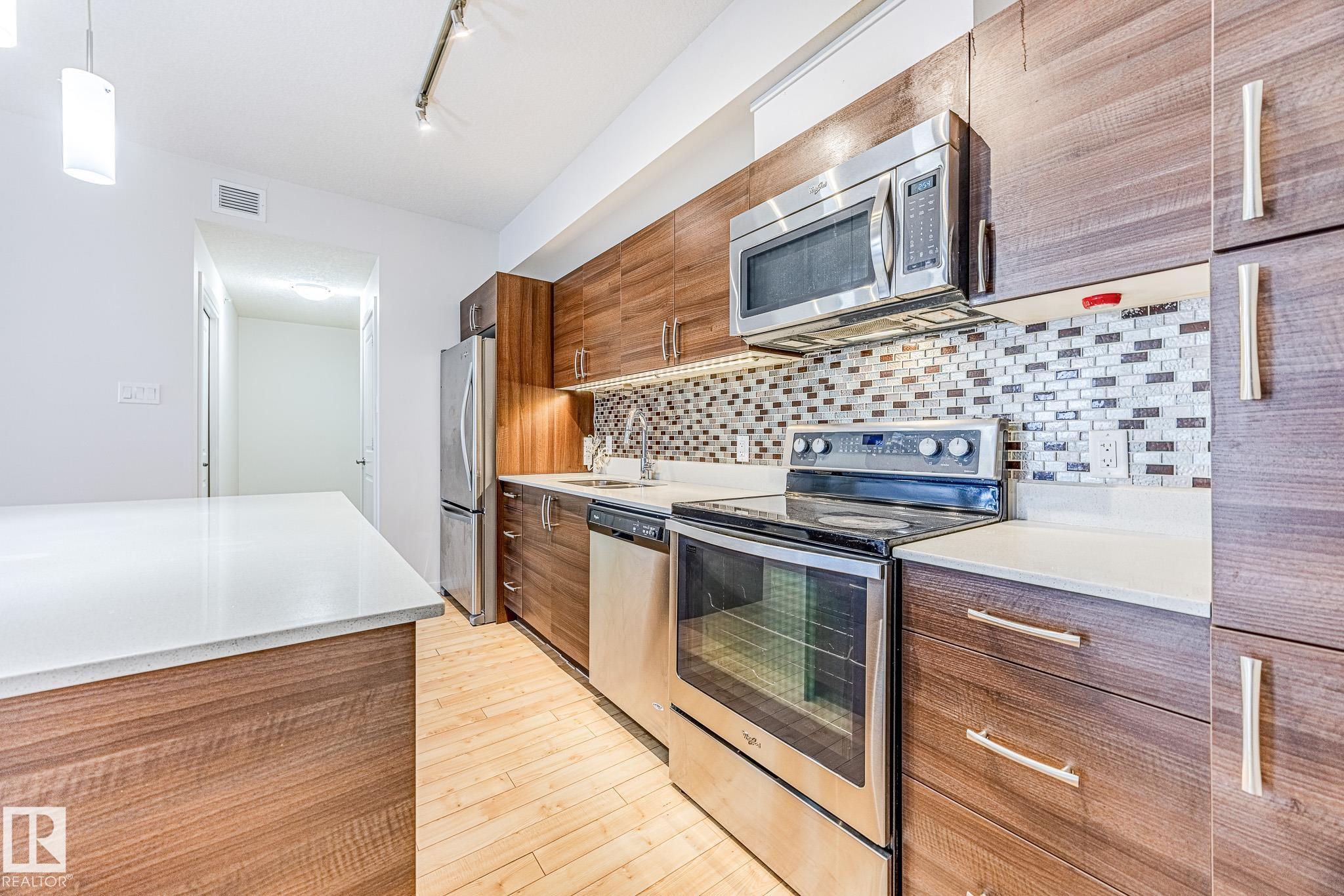 Looking for a well-maintained home in a solid condo complex? This is it! This bright top-floor 2 bedroom, 2 bath home offers upgraded laminate flooring, a stunning quartz island with eating bar, and beautiful south-facing views. Freshly painted and modern, the open-concept layout features a well-designed kitchen with ample storage, quartz countertops, stainless steel appliances, and a large island with seating for four. The space flows seamlessly into the great room, flooded with natural light from sunny south-exposure windows?perfect for dining, entertaining, or simply relaxing. The spacious primary bedroom includes a dual-sided walk-in closet and private ensuite, while the second bedroom and main bath are thoughtfully positioned on the opposite side for added privacy. Enjoy the convenience of in-suite laundry, a large patio ideal for gardening, and a secure underground parking stall. Steps to transit, shopping, and the Henday. Welcome home! Visit the REALTOR®?s website for more details.