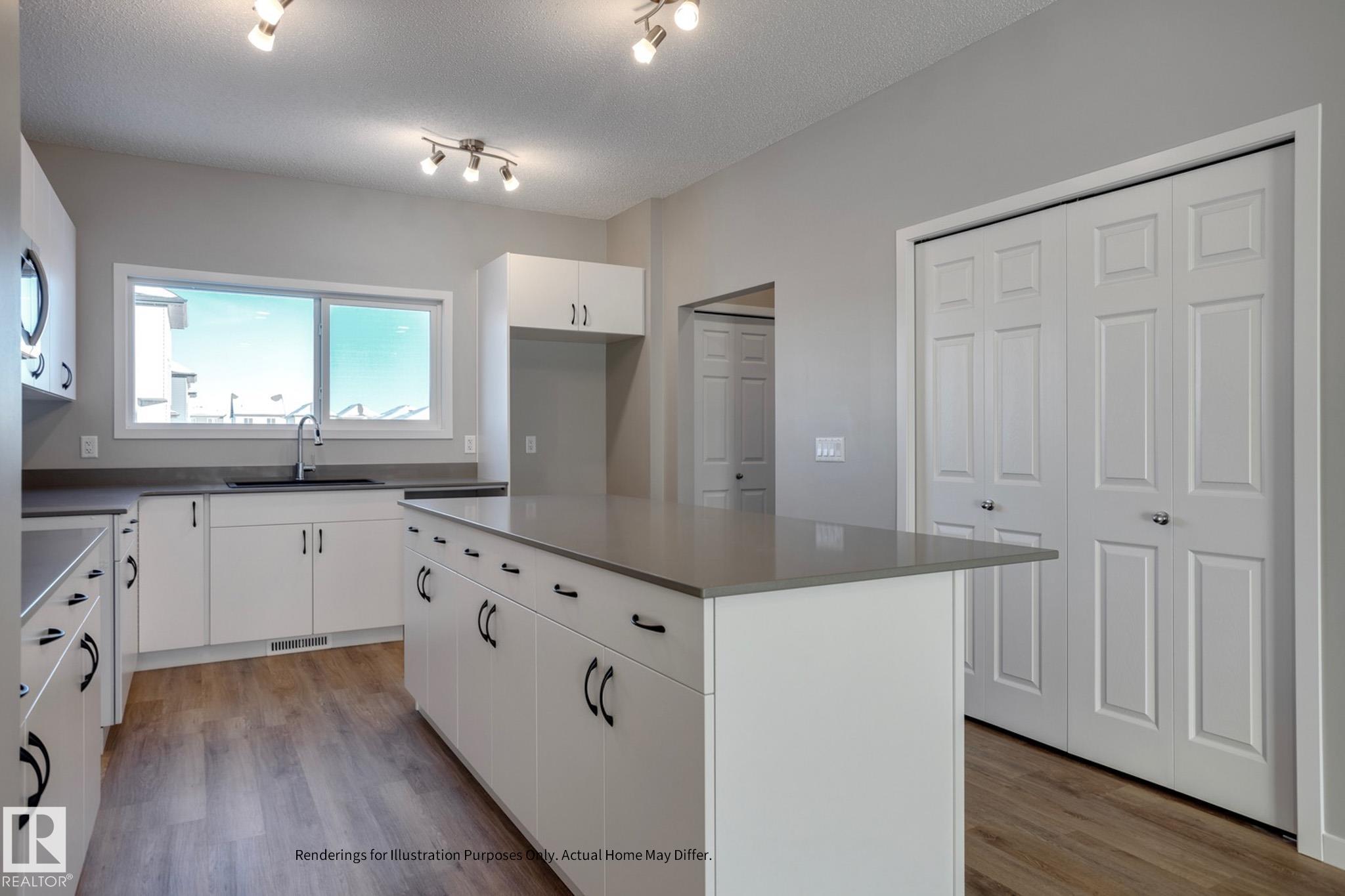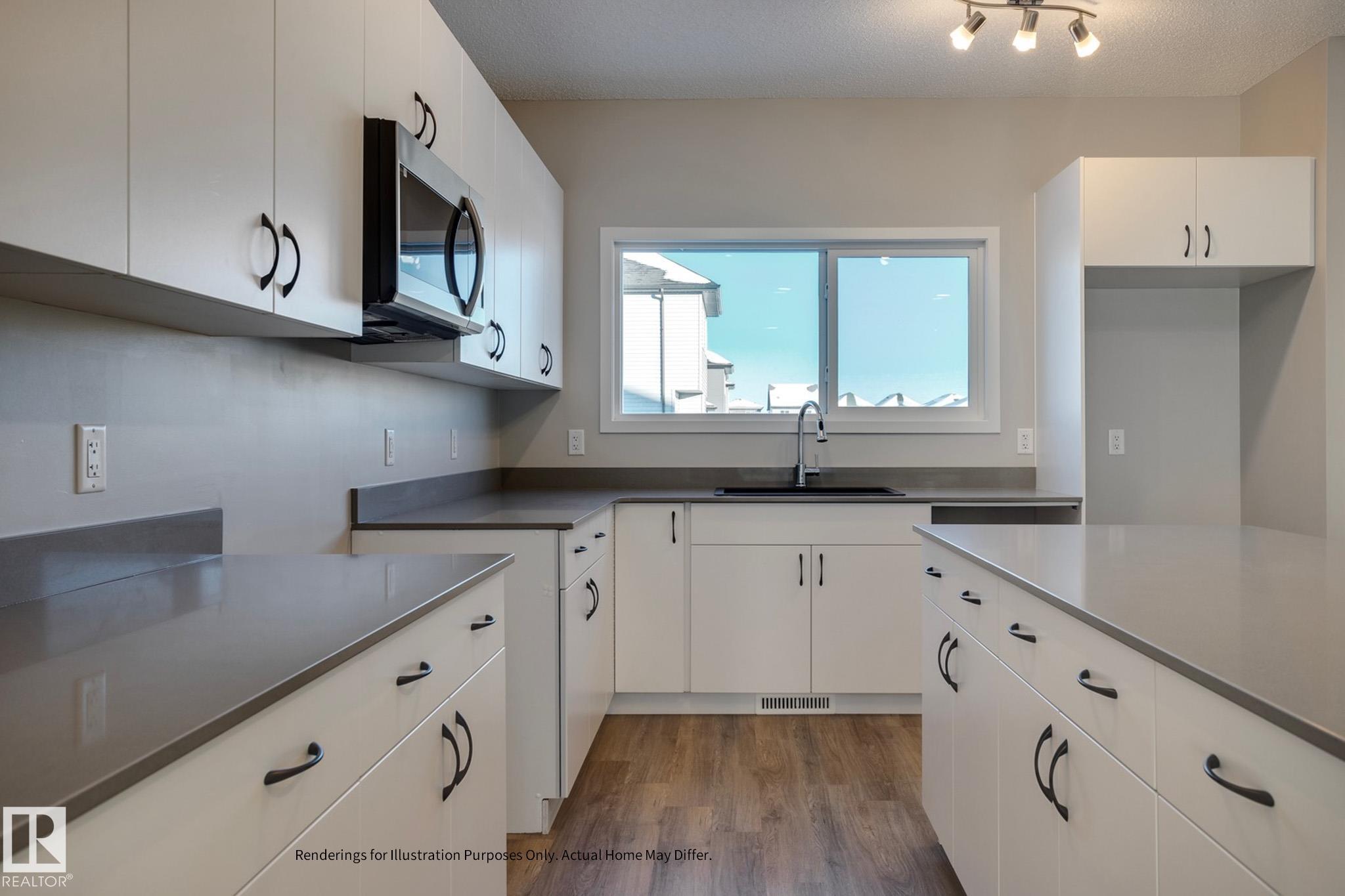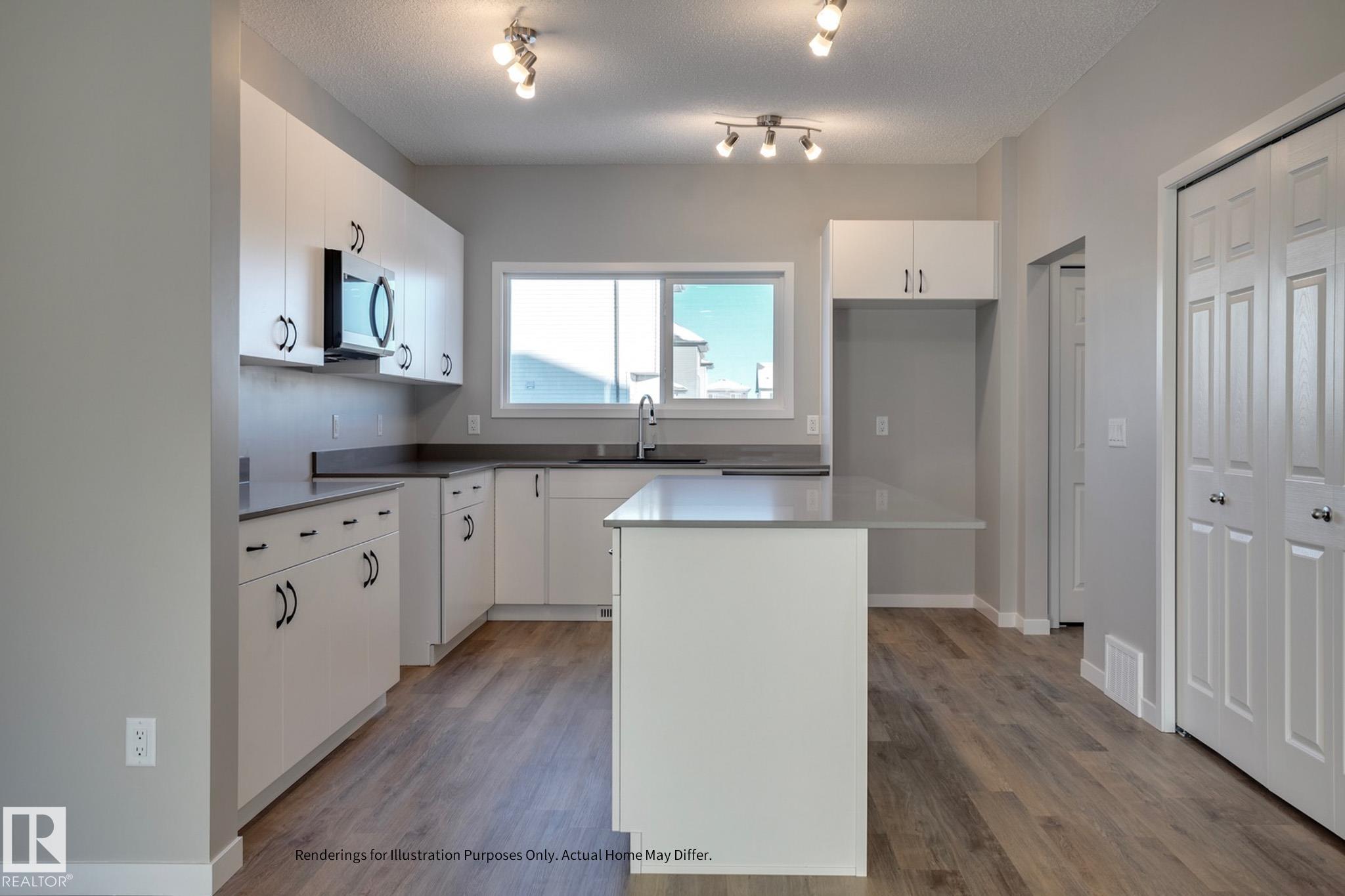 Built by Sterling Homes, this bright laned home in McConachie offers modern comfort near schools, parks, and amenities. Triple-pane windows and 9? ceilings fill the open main floor with light. The kitchen features quartz countertops, island seating, upgraded cabinetry, tile backsplash, soft-close drawers, and a spacious pantry, while a rear dining nook and half bath add function. Upstairs, the primary suite features a walk-in closet and a 3-piece en-suite, as well as two bedrooms, a full bath, laundry facilities, and a loft. Complete with vinyl plank flooring, side entrance, parking pad, and basement rough-ins.