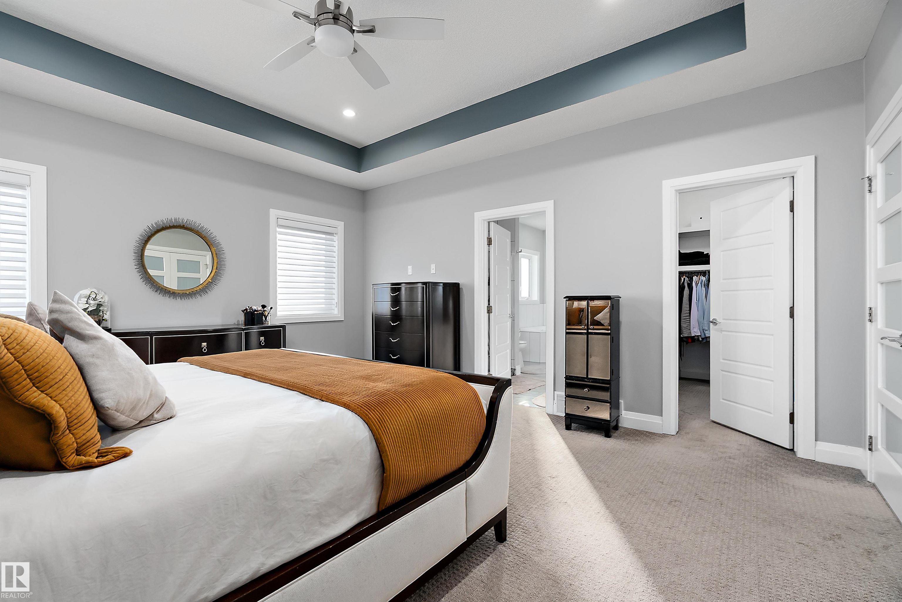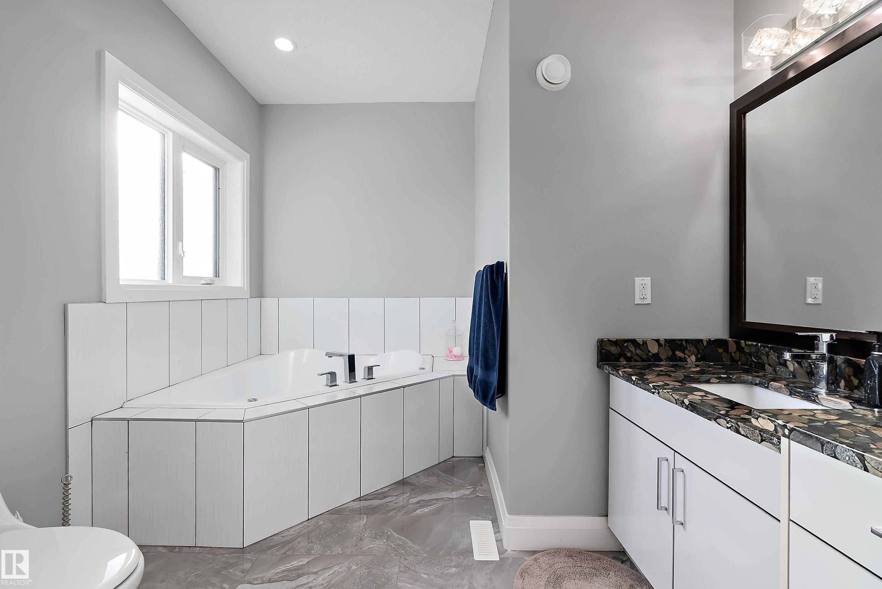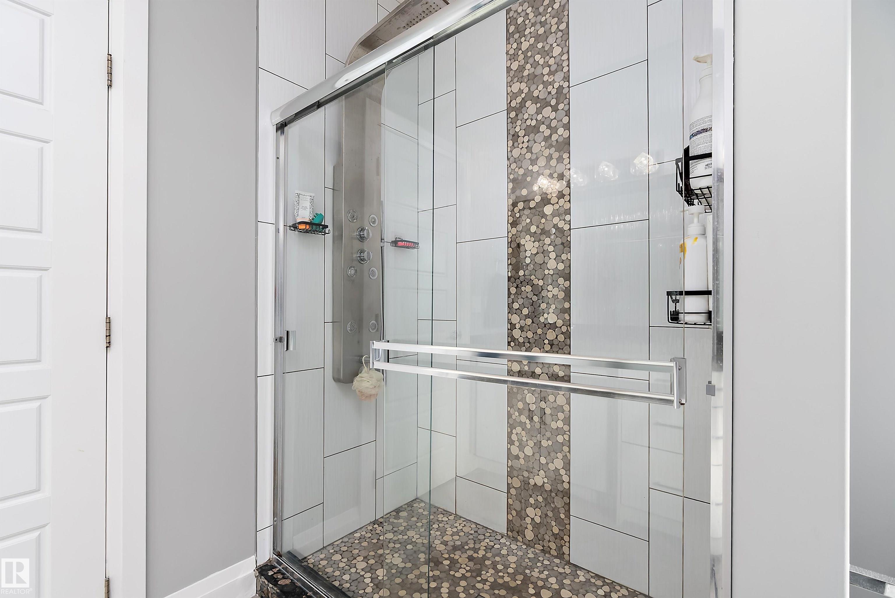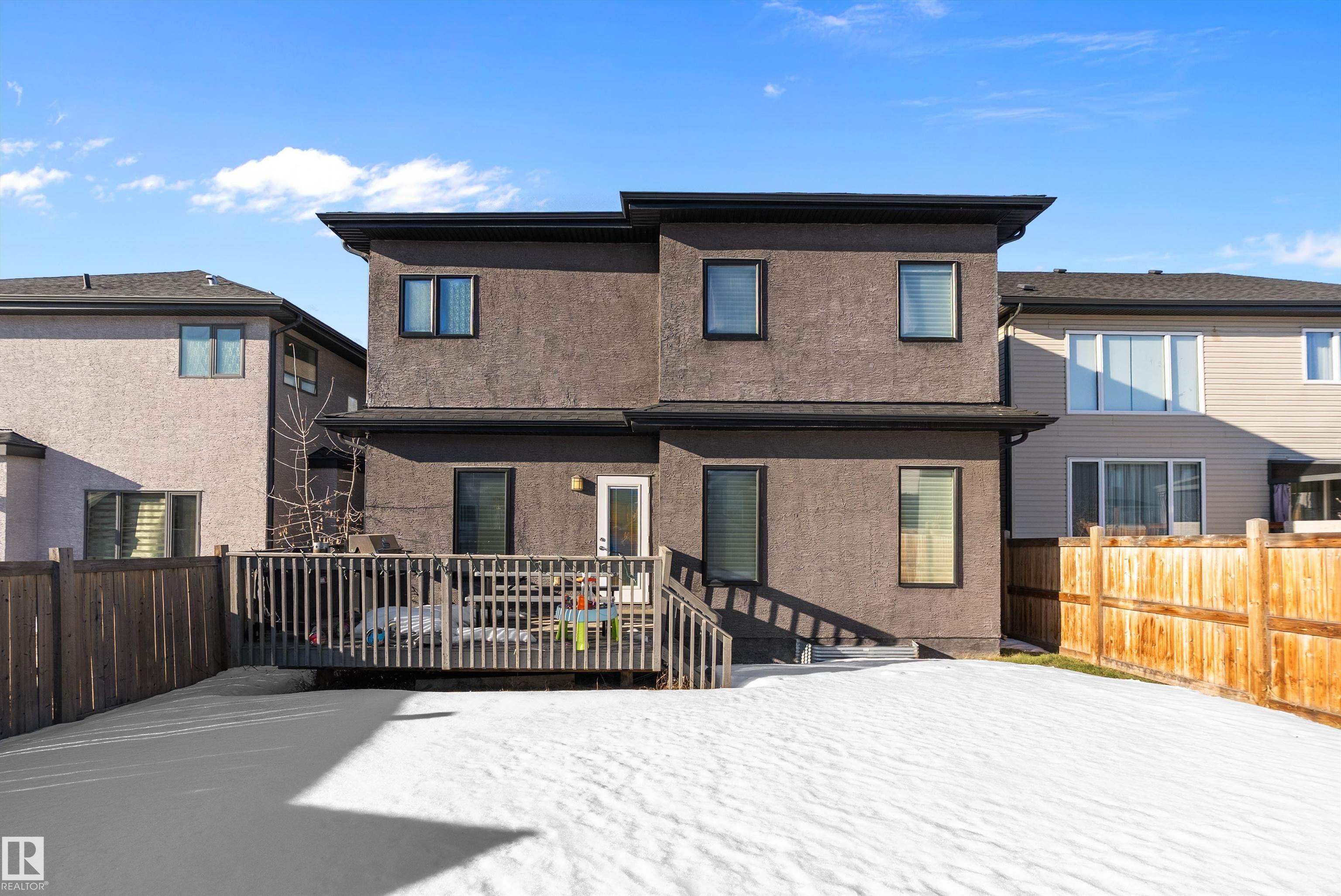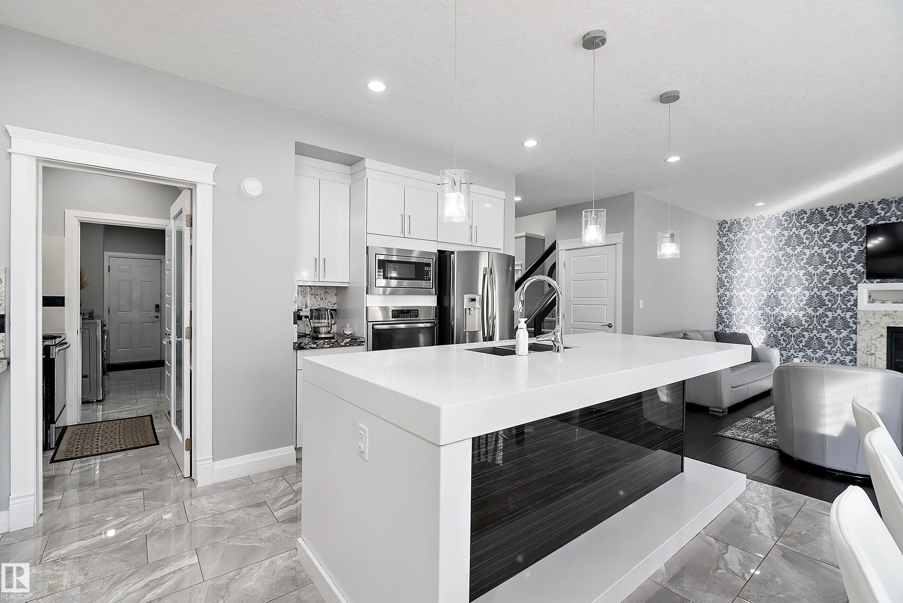 Located in the highly desired community of Oxford. This stunning, 2711 sqft modern home offers great curb appeal and grand entry. High ceilings and stylish light fixtures create a bright, welcoming atmosphere throughout. The kitchen features white cabinetry, sleek island, dining space, pantry and a separate spice kitchen, perfect for everyday cooking and entertaining. A separate entrance adds extra flexibility. The main floor includes a bedroom and full bathroom, ideal for guests or extended family, along with a laundry room complete with sink and storage. Upstairs offers a bonus room with a large balcony and 3 bedrooms, two with private ensuites. The primary bedroom includes double sinks, a soaker tub, and a walk-in closet. An additional 4-piece bathroom completes the upper level. Enjoy air conditioning, a double oversized heated garage that fits 3 vehicles, plus a large backyard and deck. Located close to the Anthony Henday, schools, shopping, parks, public transportation and all other major amenities.