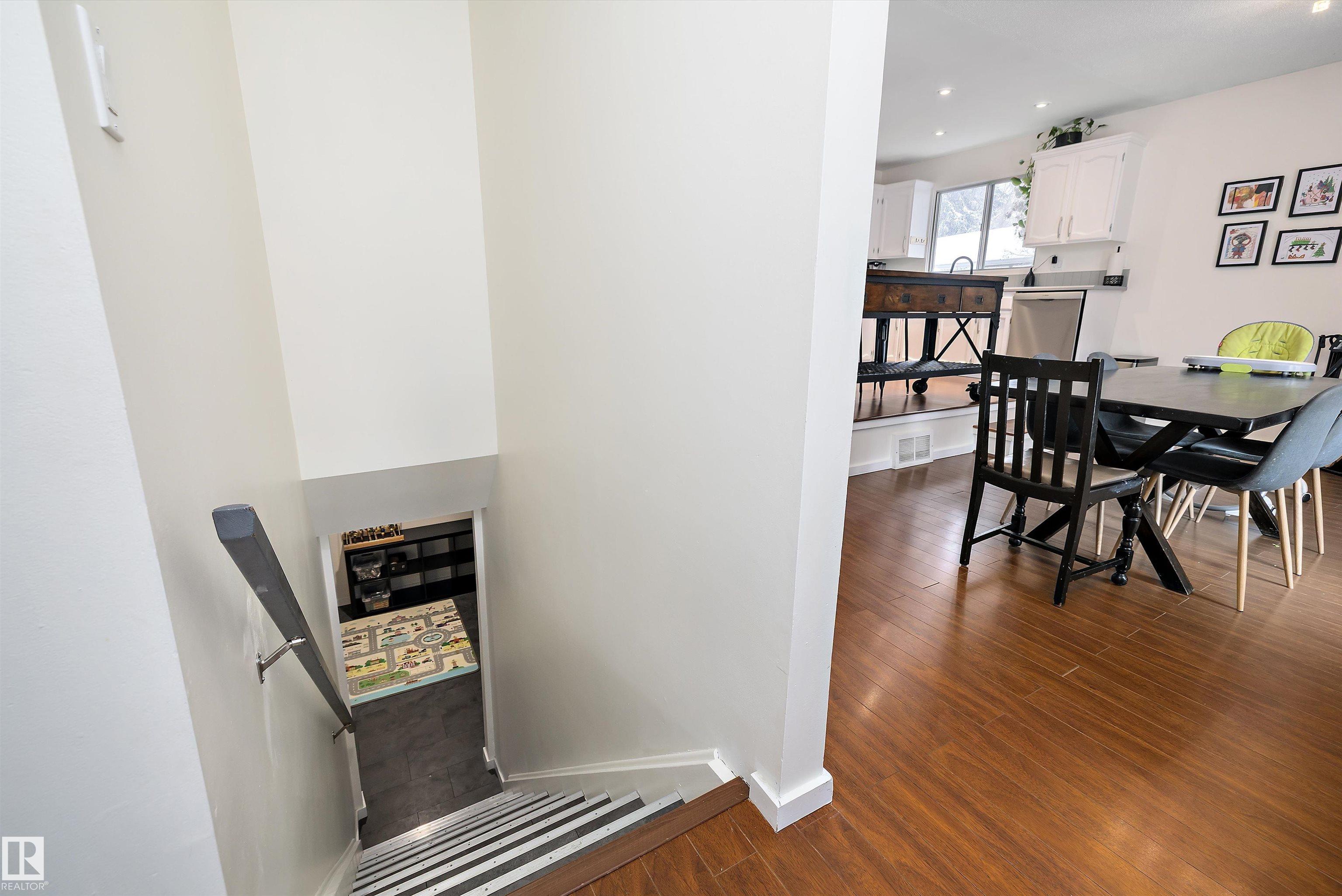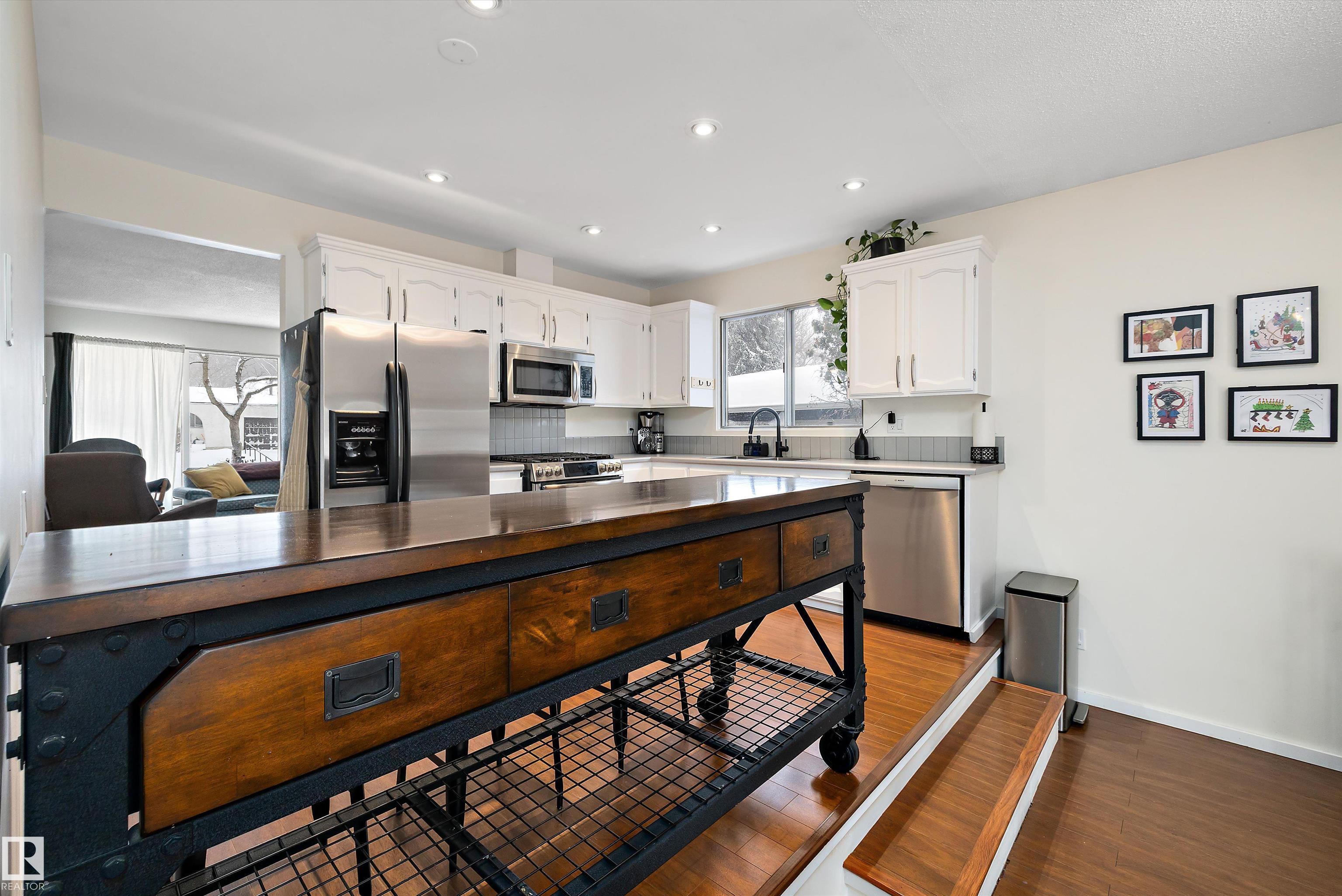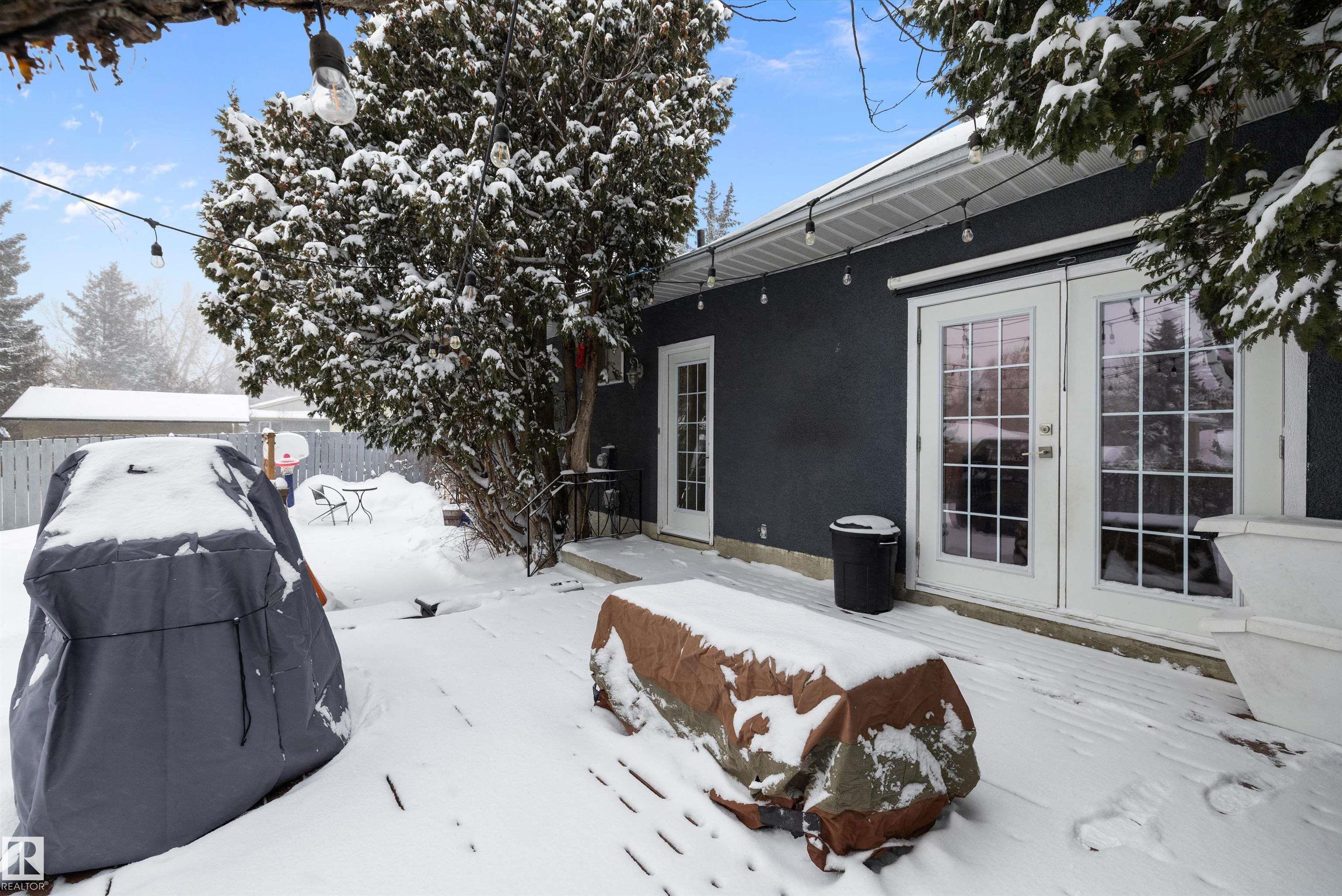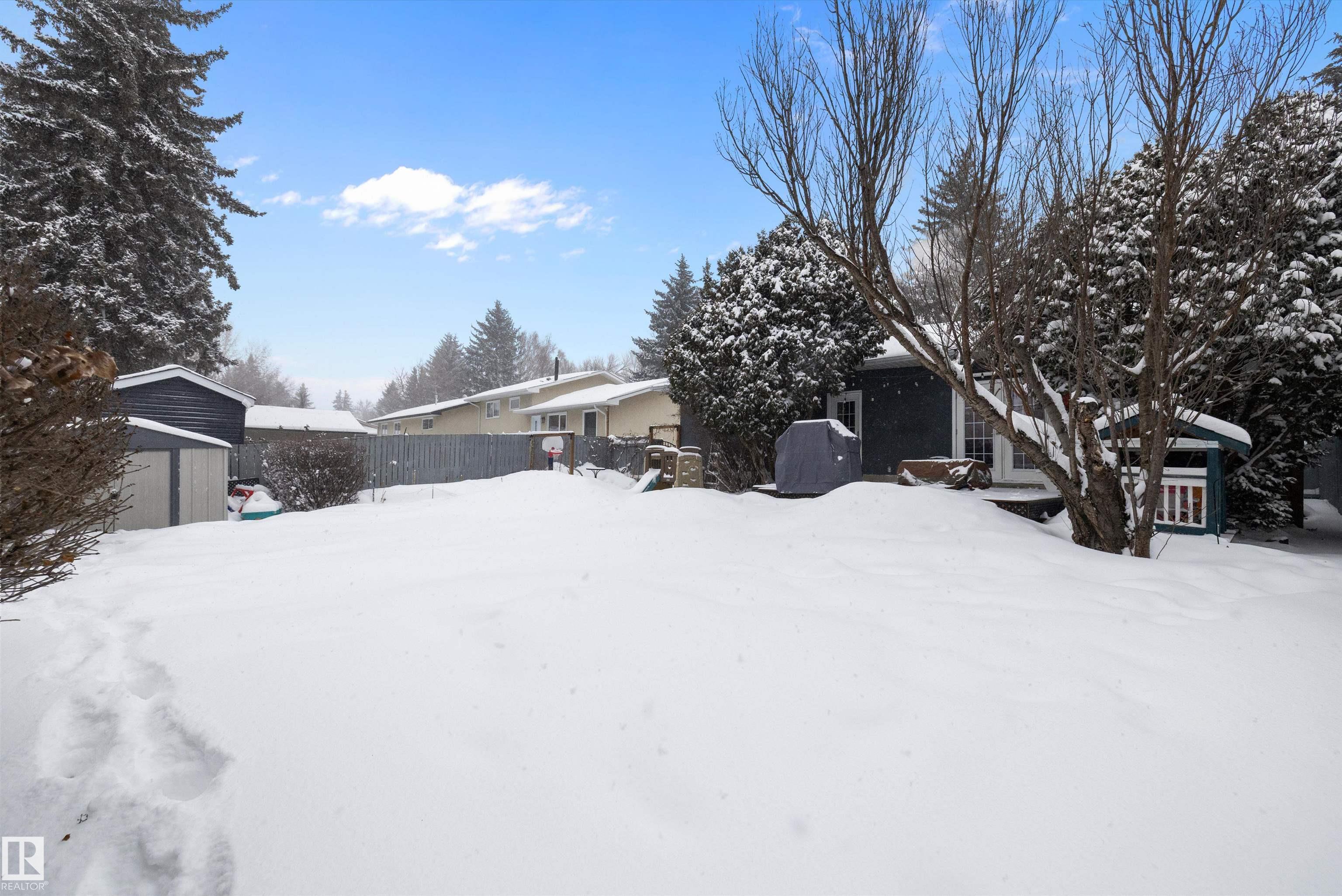 Beautifully renovated home on a tree-lined street in desirable Braeside, steps to the river valley, trails, schools, parks, shopping, festivals and the St. Albert Farmers? Market. Outstanding curb appeal with mature landscaping welcomes you into a bright, spacious living room filled with natural light. The updated kitchen features white cabinetry, gas stove, upgraded appliances and fixtures, and a movable island?perfect for everyday living and entertaining. Sunken dining room offers a cozy fireplace, patio doors and space for large gatherings. The main floor includes a 4-piece bath, two bedrooms and a primary suite with 2-piece ensuite. Fully finished basement features a family/media room, additional bedroom, 2-piece bath, laundry and ample storage. Recent upgrades include new shingles and hot water tank. Enjoy a private backyard oasis with mature trees, perennials, garden space, grapes, raspberries and a large patio. Move-in ready in one of St. Albert?s most sought-after neighbourhoods!