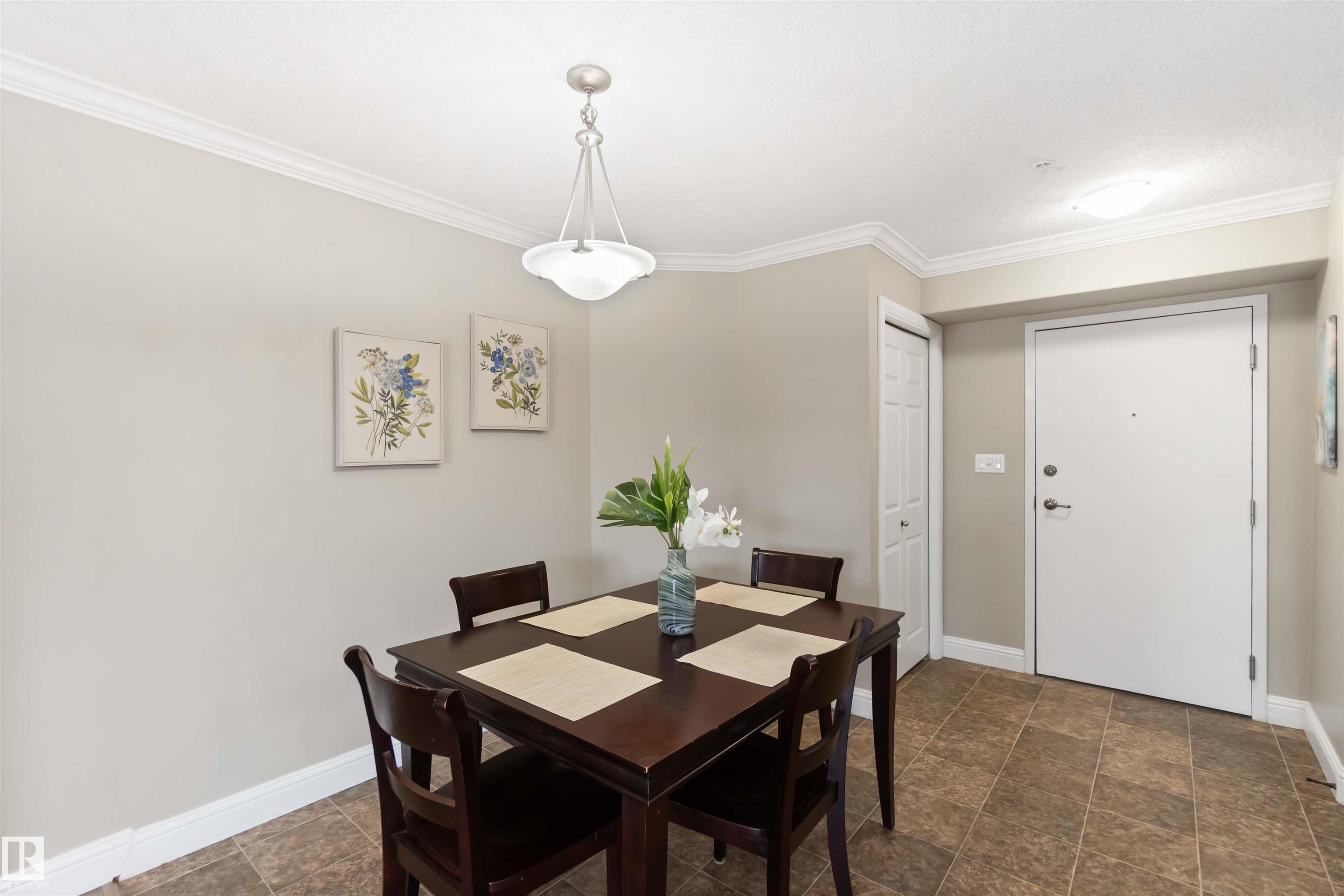This 2-bedroom, 2-bathroom condo has low condo fees! Offers incredible value! Featuring a functional open-concept layout with crown mouldings, 9-foot ceilings, and a low-maintenance deck, this home blends style and practicality. The spacious kitchen boasts rich maple cabinetry, black appliances, a breakfast bar, and a dedicated dining area. The living room flooring was upgraded to laminate, while the bedrooms feature cozy wool carpets. The primary suite comfortably fits a king bed and includes a walk-in closet plus a luxurious 5-piece ensuite. A second bedroom and full bath add versatility for family, guests, or a home office. With southwest-facing exposure for plenty of natural light, in-suite laundry, heated underground parking, and a storage cage?all in a pet-friendly, professionally managed building near every amenity?this one is a standout.