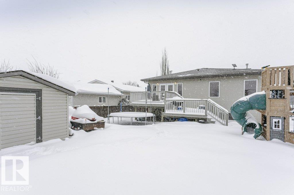 WELCOME HOME TO 4408 MILLER DRIVE?ONE OF ONOWAY?S MOST DESIRABLE LOCATIONS! This beautifully maintained 2002 bi-level offers over 2,600 sq ft of developed living space, 5 bedrooms, 3 bathrooms & a 20x24 heated attached garage. Freshly painted throughout, the home feels bright, clean & move-in ready. The main floor features vaulted ceilings, a spacious living room with laminate flooring & a gas fireplace, plus a welcoming kitchen with a raised eating bar, pantry & stainless steel appliances. The dining area opens to a deck overlooking the large, fenced yard?perfect for entertaining. The king-sized primary retreat includes a walk-in closet & 4-pc ensuite with jetted tub. Two additional bedrooms & a full bath complete the main level. The fully finished basement is warm & inviting with in-floor heating, a wood-burning fireplace, expansive family room, two more bedrooms, laundry & a 3-pc bath. Added comforts include central A/C & a 2-tier deck. A fantastic family home in an outstanding location!