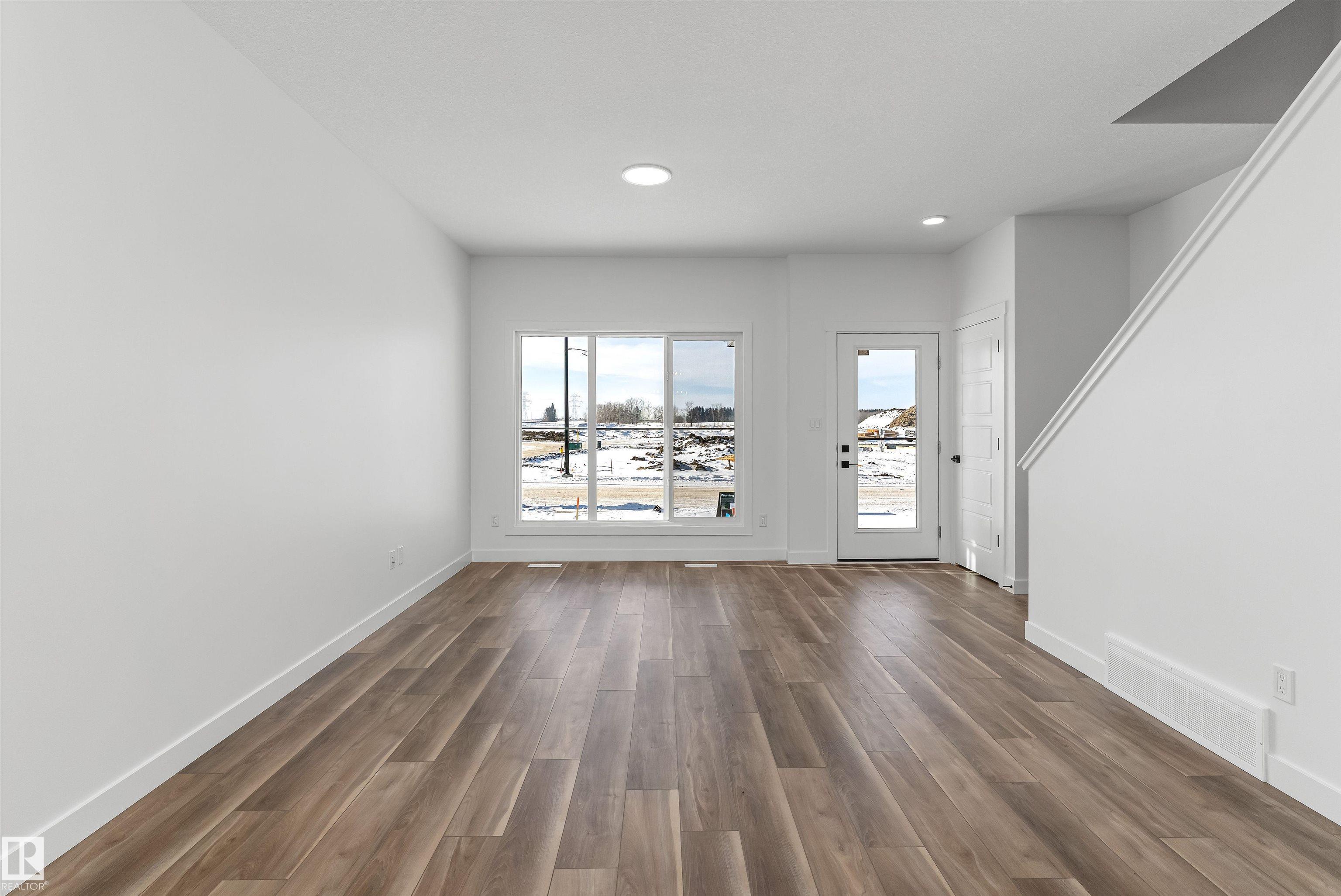 Built by Sterling Homes, this bright, laned home in Aster offers a practical layout for comfortable living. Triple-pane windows and 9? ceilings make the main floor feel open, starting with a sunlit front living room. The rear kitchen overlooks the yard and features quartz countertops, a Silgranit sink, upgraded cabinetry, a peninsula with seating, a built-in microwave, and a pantry. The dining area is surrounded by backyard views, with a tucked-away half bath and rear entry nearby. Upstairs includes a primary suite with a walk-in closet and ensuite, two bedrooms, a full bath, and laundry. Complete with luxury vinyl plank flooring, parking pad, side entrance, and basement rough-ins.