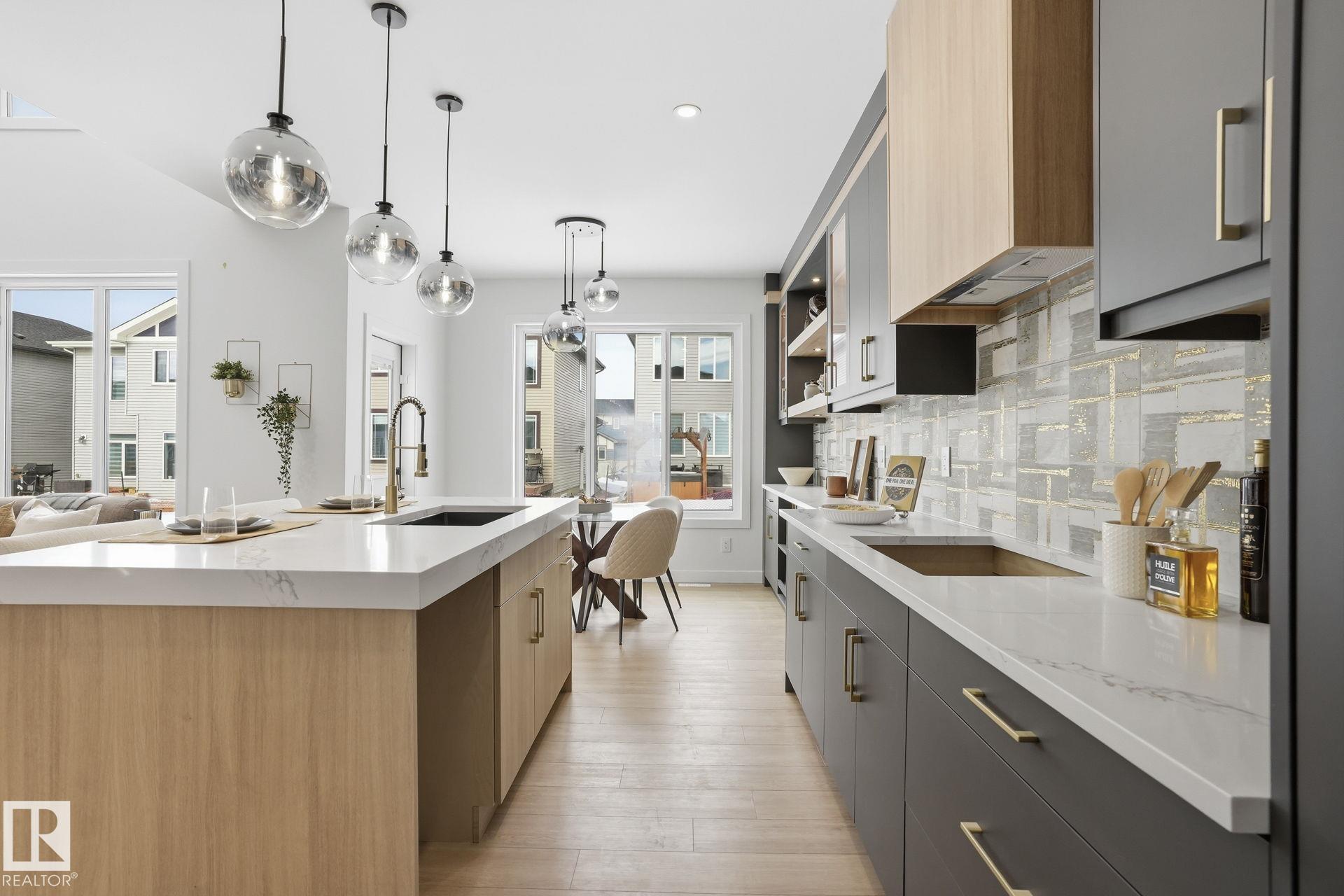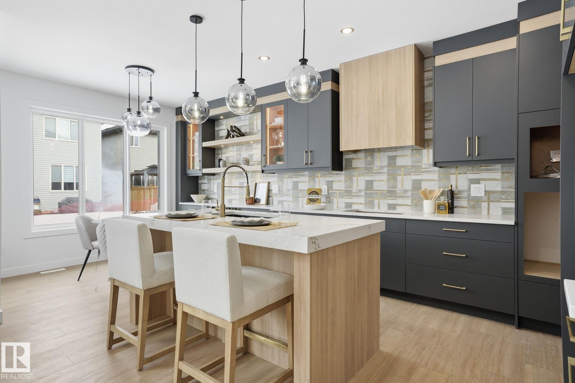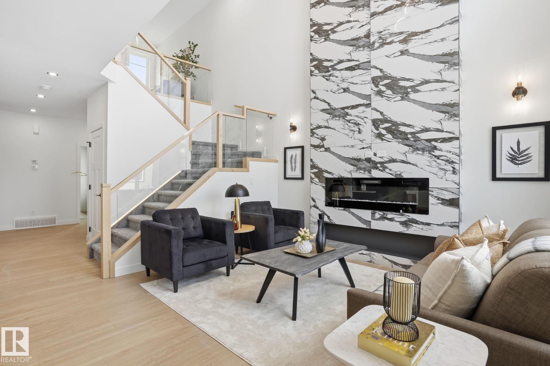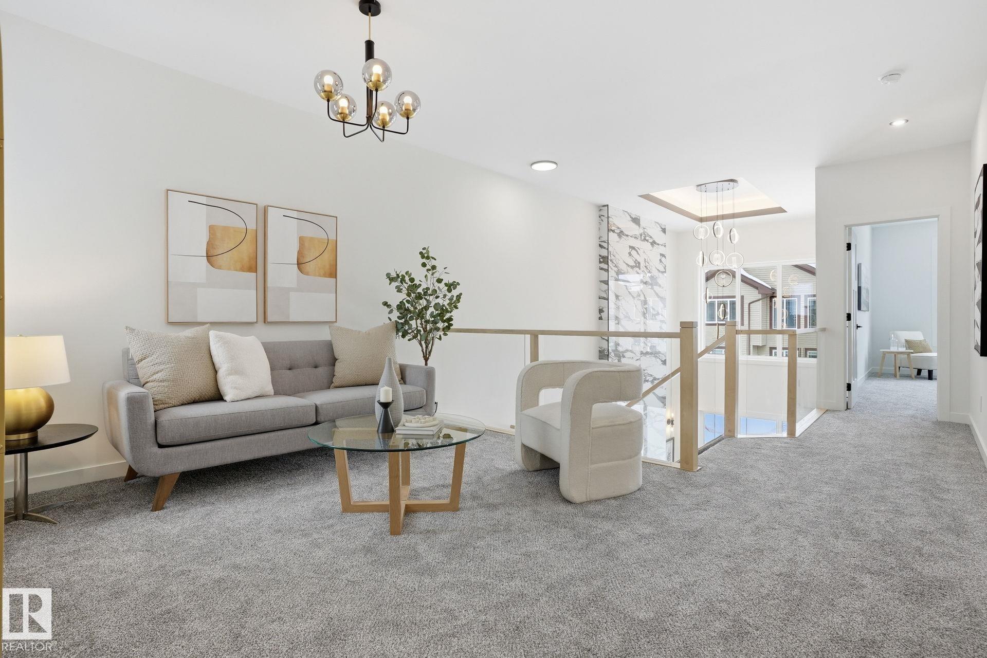 Experience refined living in this quick-possession luxury home in Beaumont, featuring a double attached garage and a separate side entrance. The main floor is thoughtfully designed with a office space, elegant 3-pc bath, and spacious mudroom, leading into a breathtaking open-concept living space. A chef-inspired gourmet kitchen is complemented by a dedicated spice kitchen - perfect hosting the whole family - while the great room impresses with a striking tiled fireplace and dramatic open-to-above ceilings that flood the home with light. Upstairs, discover a beautifully planned retreat with a bonus space, 4pc bath and convenient laundry with sink and quartz countertop. Three bedrooms include a lavish primary suite showcasing a spa-inspired 5-pc ensuite with double sinks, a seated makeup vanity, freestanding tub, and a custom walk-in closet designed for elevated everyday living. $5,000 appliance credit included to select your choice of appliances!