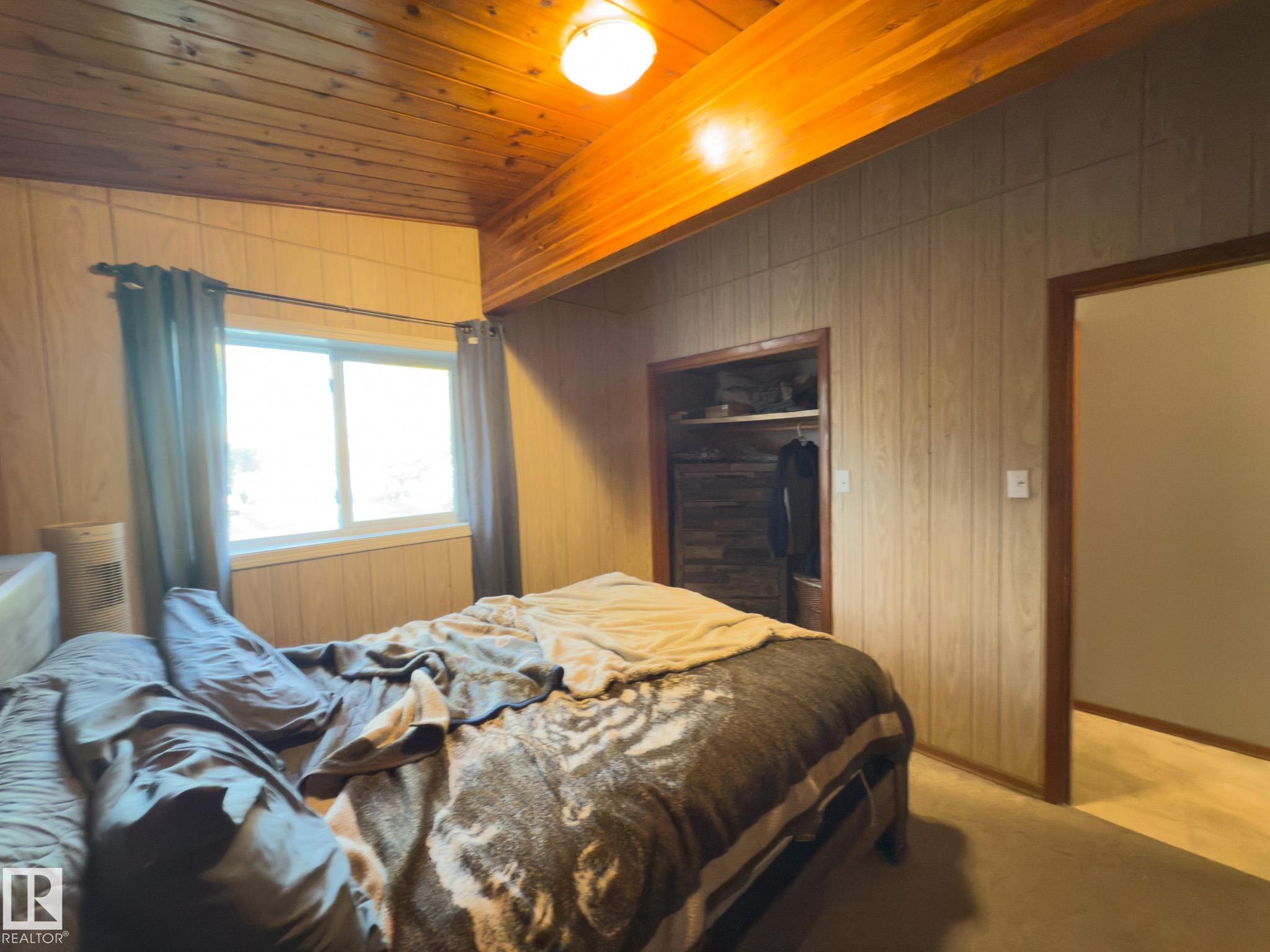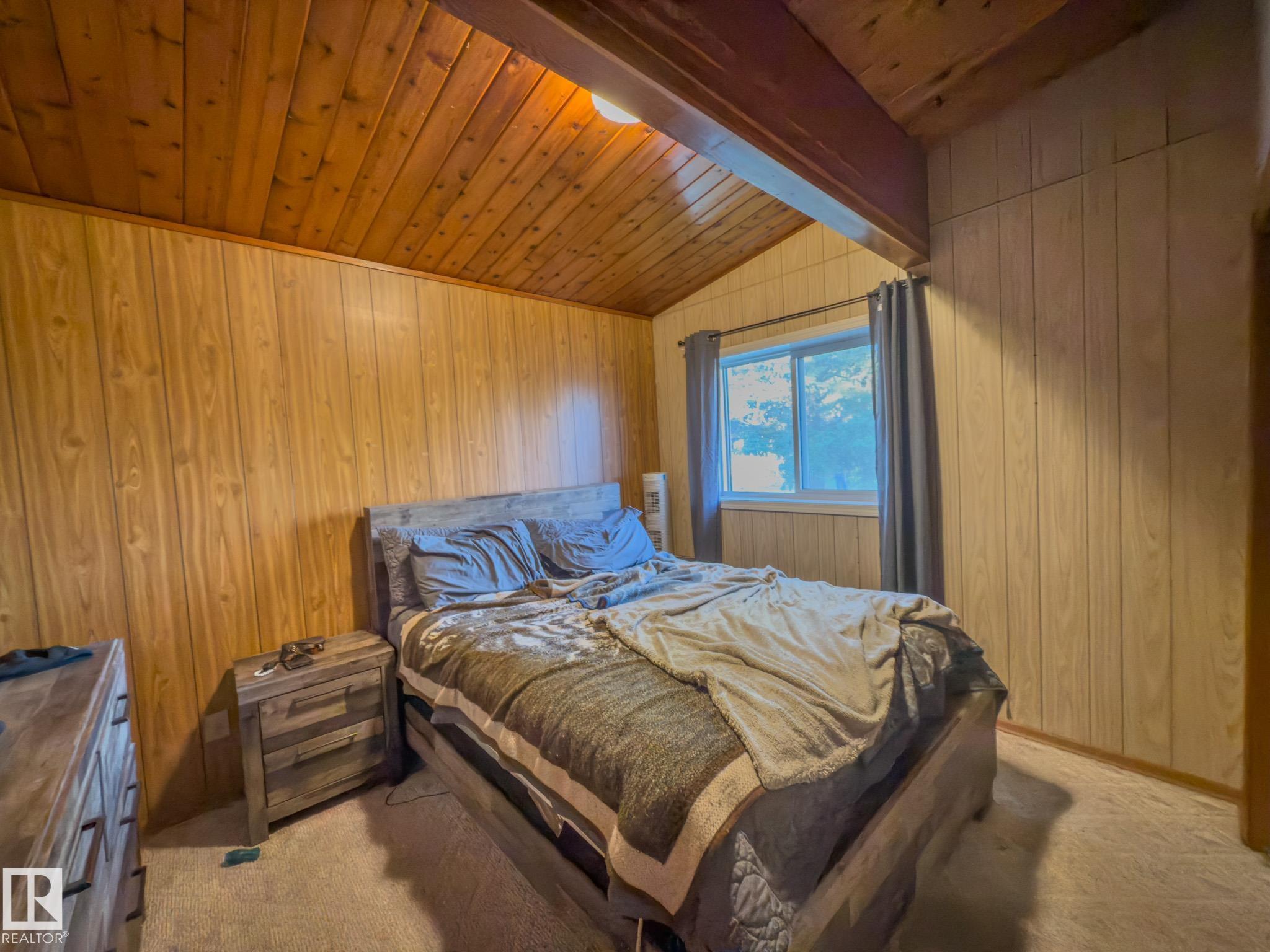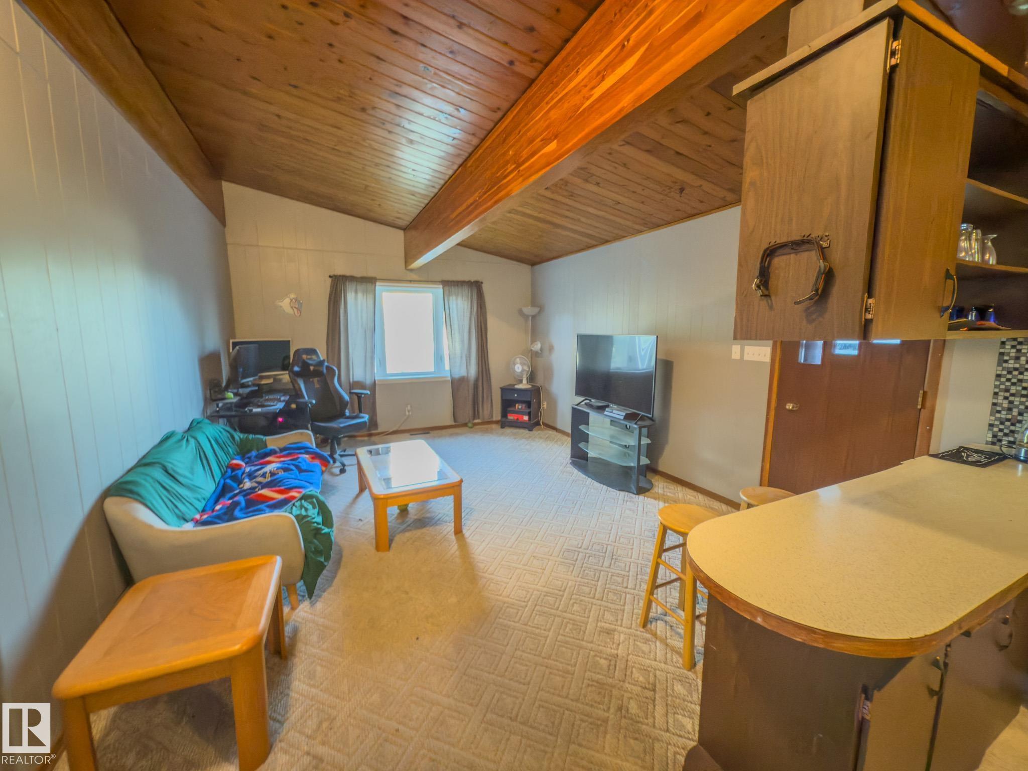 Welcome to this unique home built in 1972, full of character and potential. Featuring vaulted ceilings with exposed beams, this property offers warmth and charm the moment you step inside. The main floor includes a bright living area, functional kitchen, convenient main-floor laundry, 2 comfortable bedrooms and a 4-piece bathroom, Downstairs, you?ll find 2 additional bedrooms, a half bath, and plenty of space for Rec room or a family room. Outside, the home offers a double detached garage, a carport, and ample parking for vehicles or recreational toys. With solid bones and timeless design elements, this property is perfect for anyone looking to add their personal touch and create their dream home