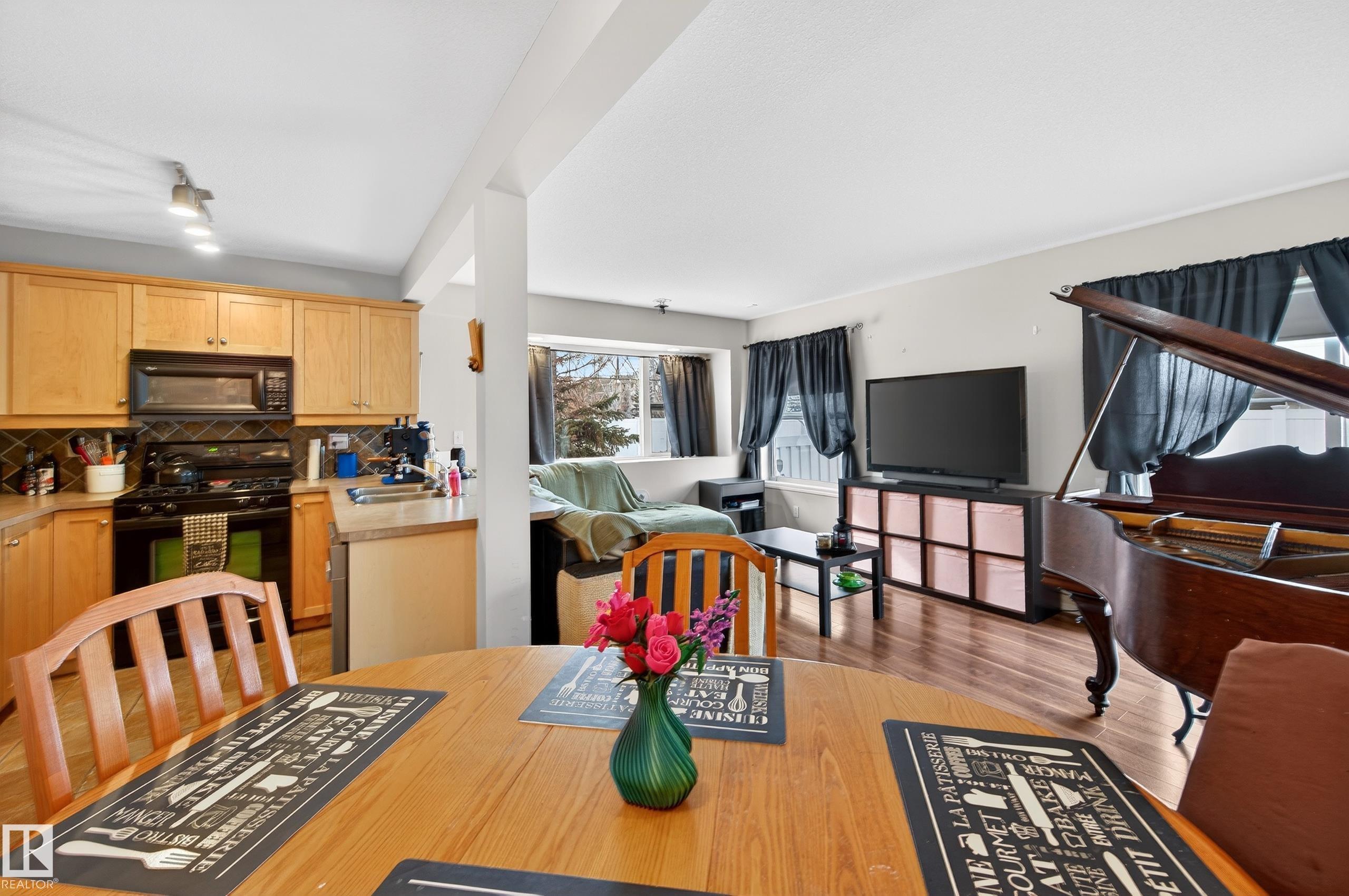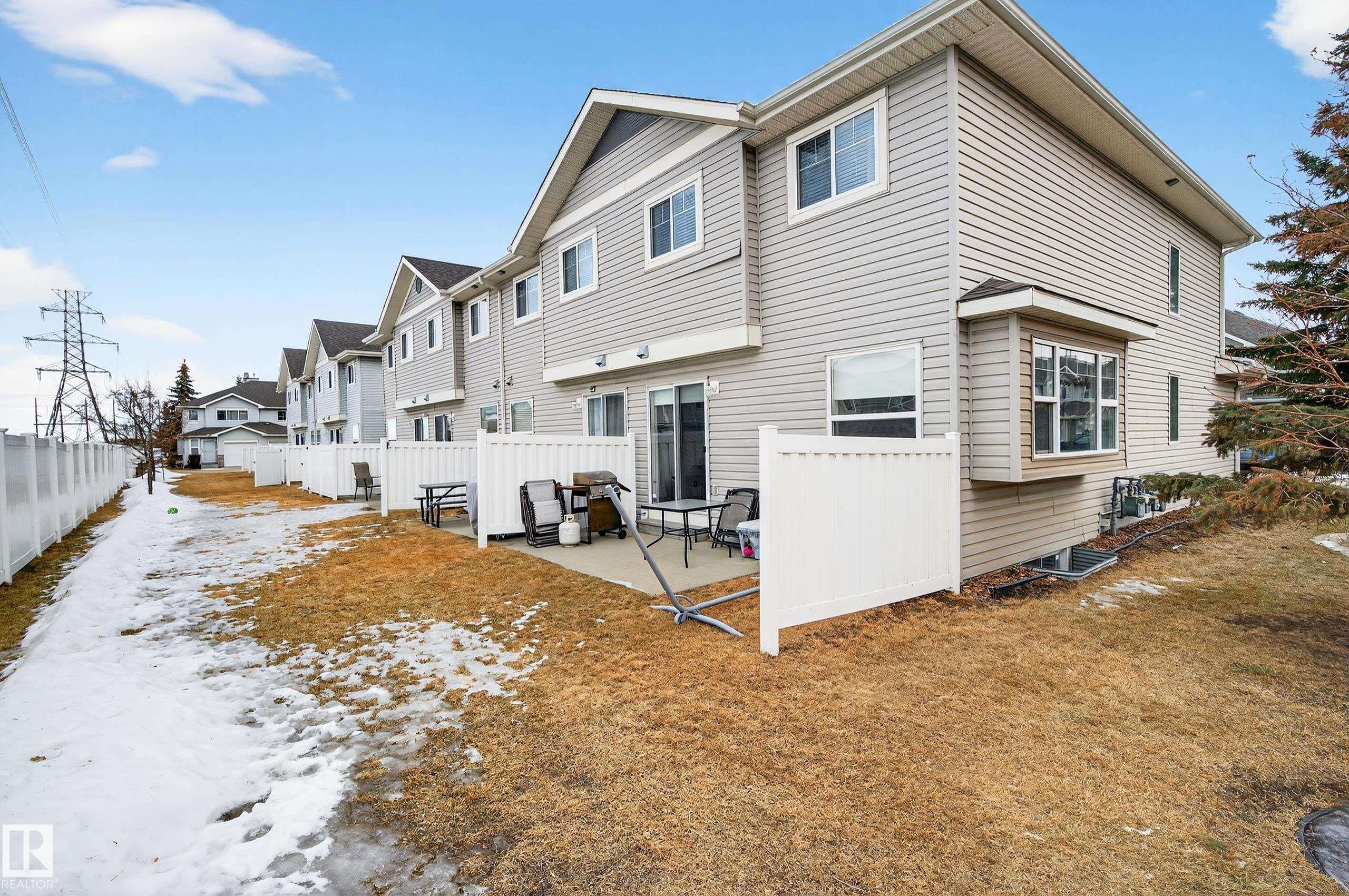 Welcome to Stonebridge! This 3 bdrm, 1.5 bath with single attached garage end unit townhouse condo, is ready for you to move in. This spacious 1200 sq ft townhouse has ample cabinets and black appliances, including a gas stove in kitchen and an eating bar, as well as a dining room. From the living room you can access the back patio through sliding glass doors. The flooring is ceramic tile and laminate flooring throughout, no carpets. There is also a 2 pce bath on main floor. The upper level has 3 bedrooms, all a good size with a walk-in closet in the primary bdrm and also has a 4 pce bathroom to complete the upper level. All levels are wired for speakers. Some areas have also been painted, including the baseboards. The basement is unspoiled and has a bathroom rough-in connection for future development potential. The garage pad is extended so that you can park 2 vehicles in the front of the garage. Close to everything - Anthony Henday, South Edmonton Common, Ellersllie and more. Great Complex!