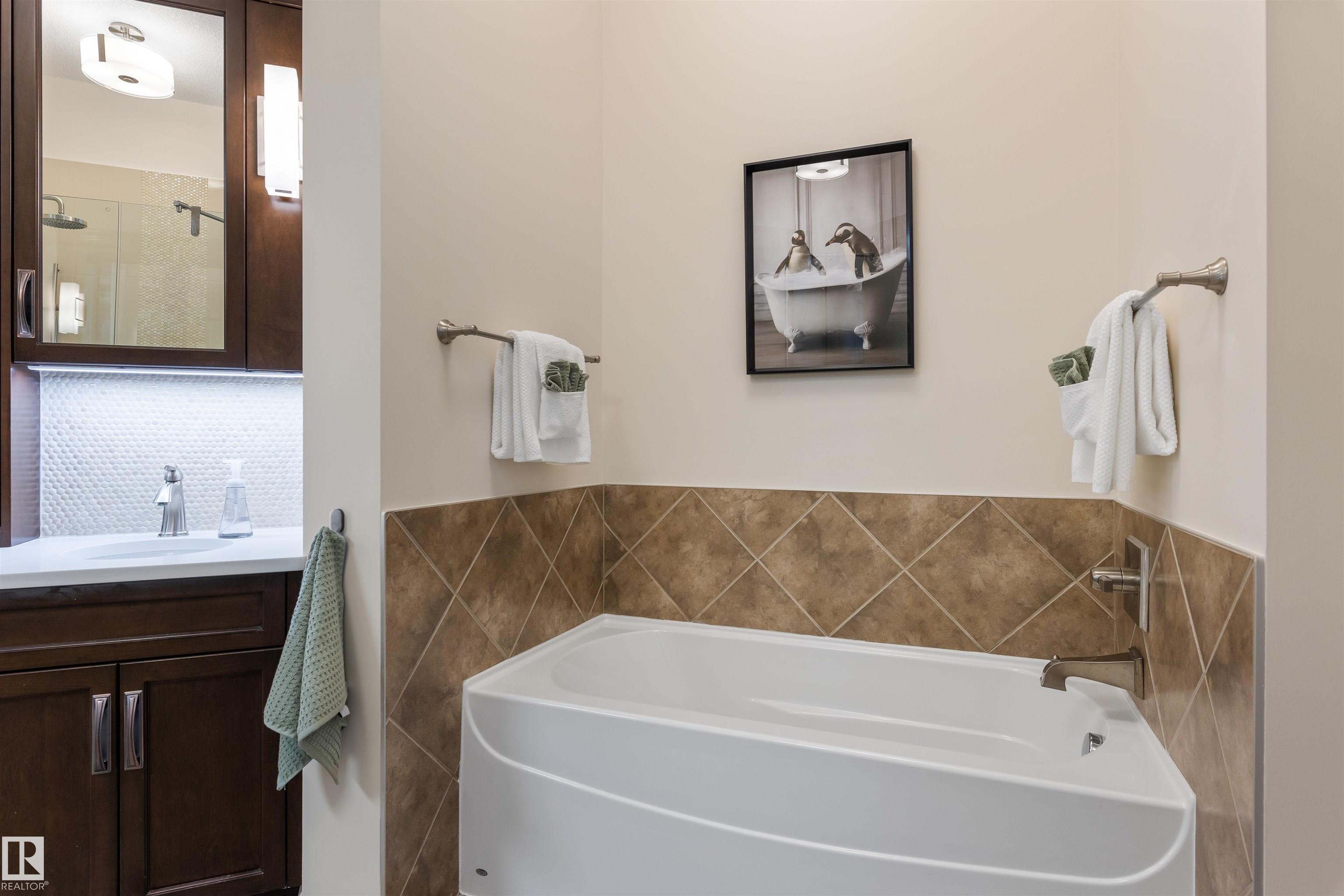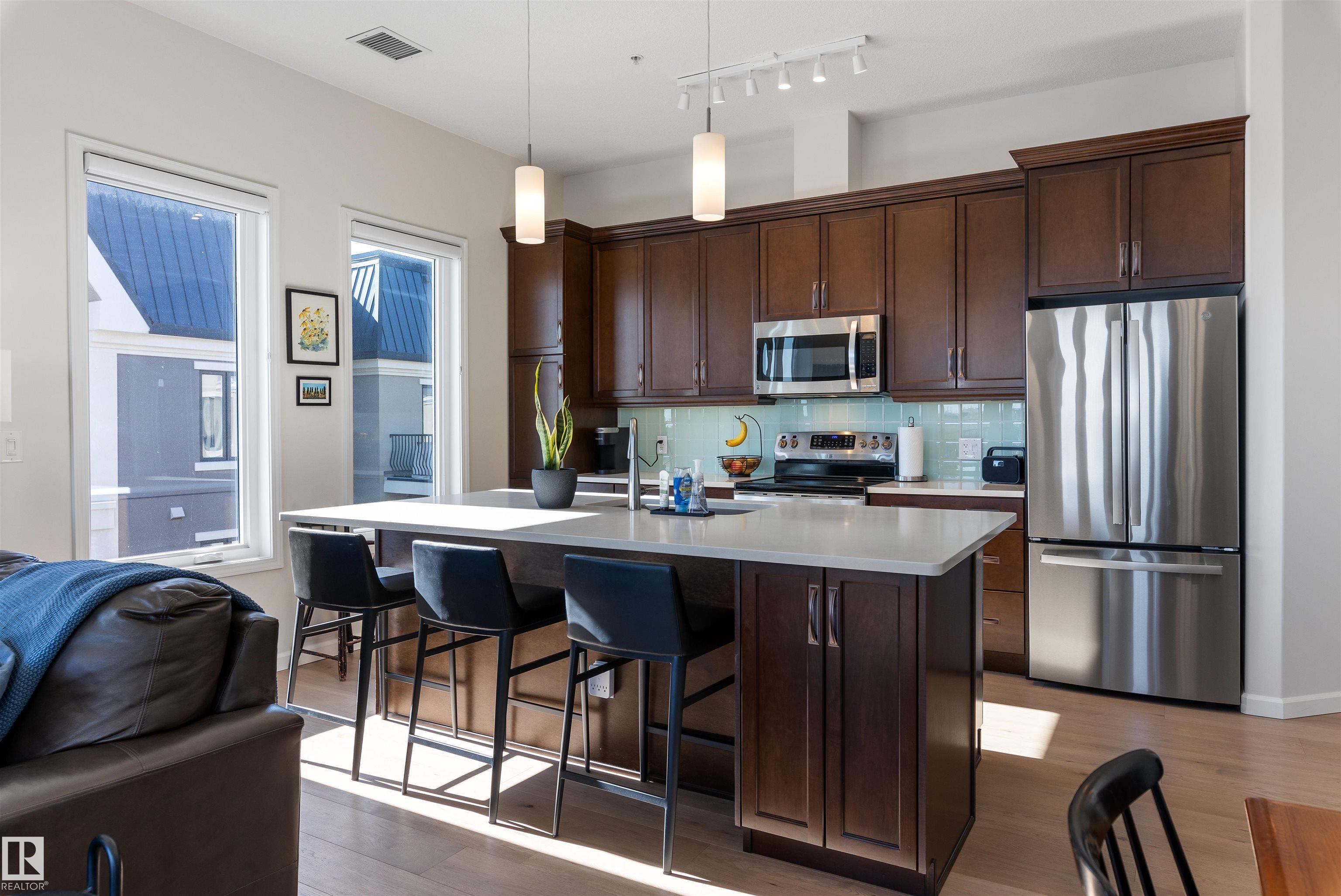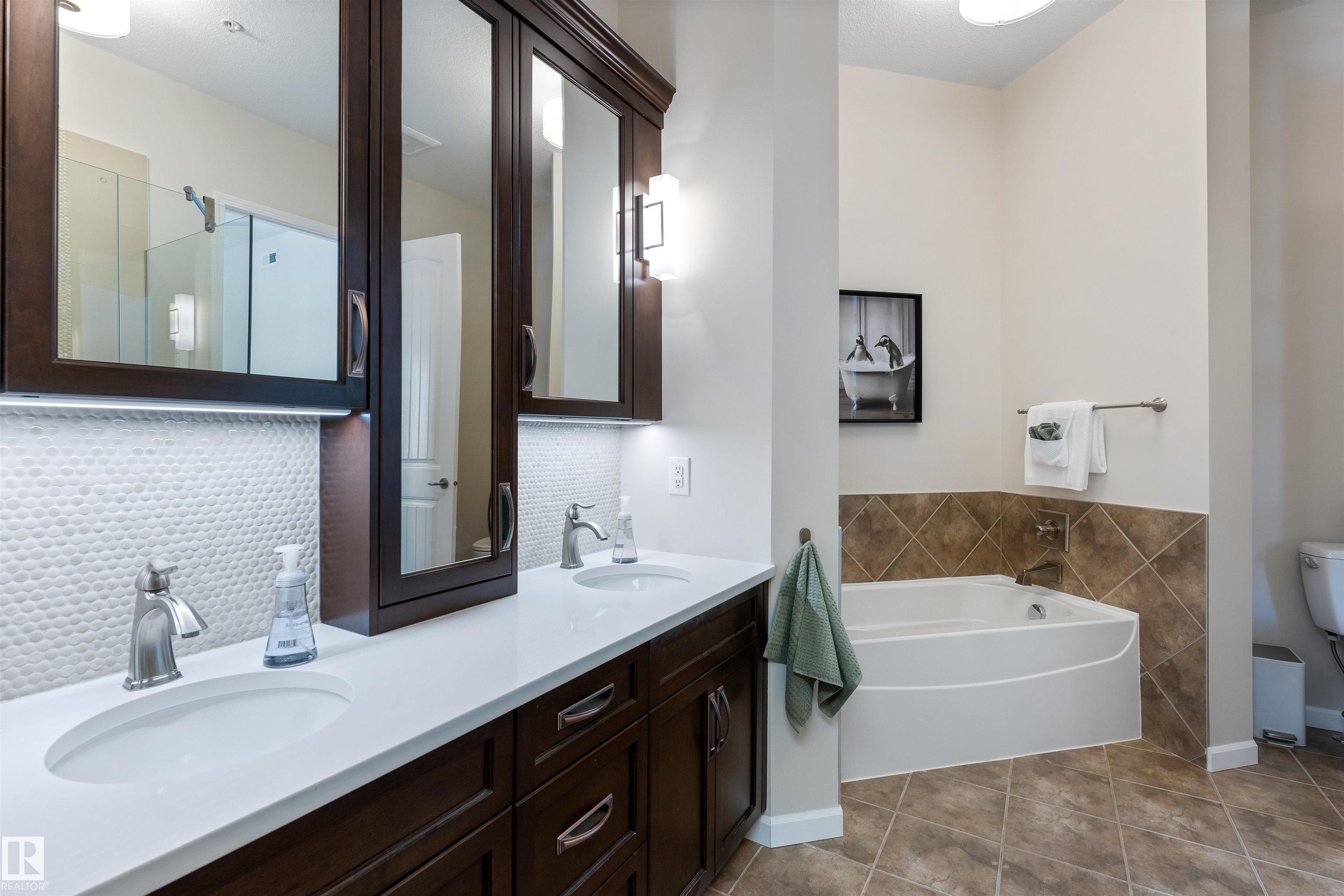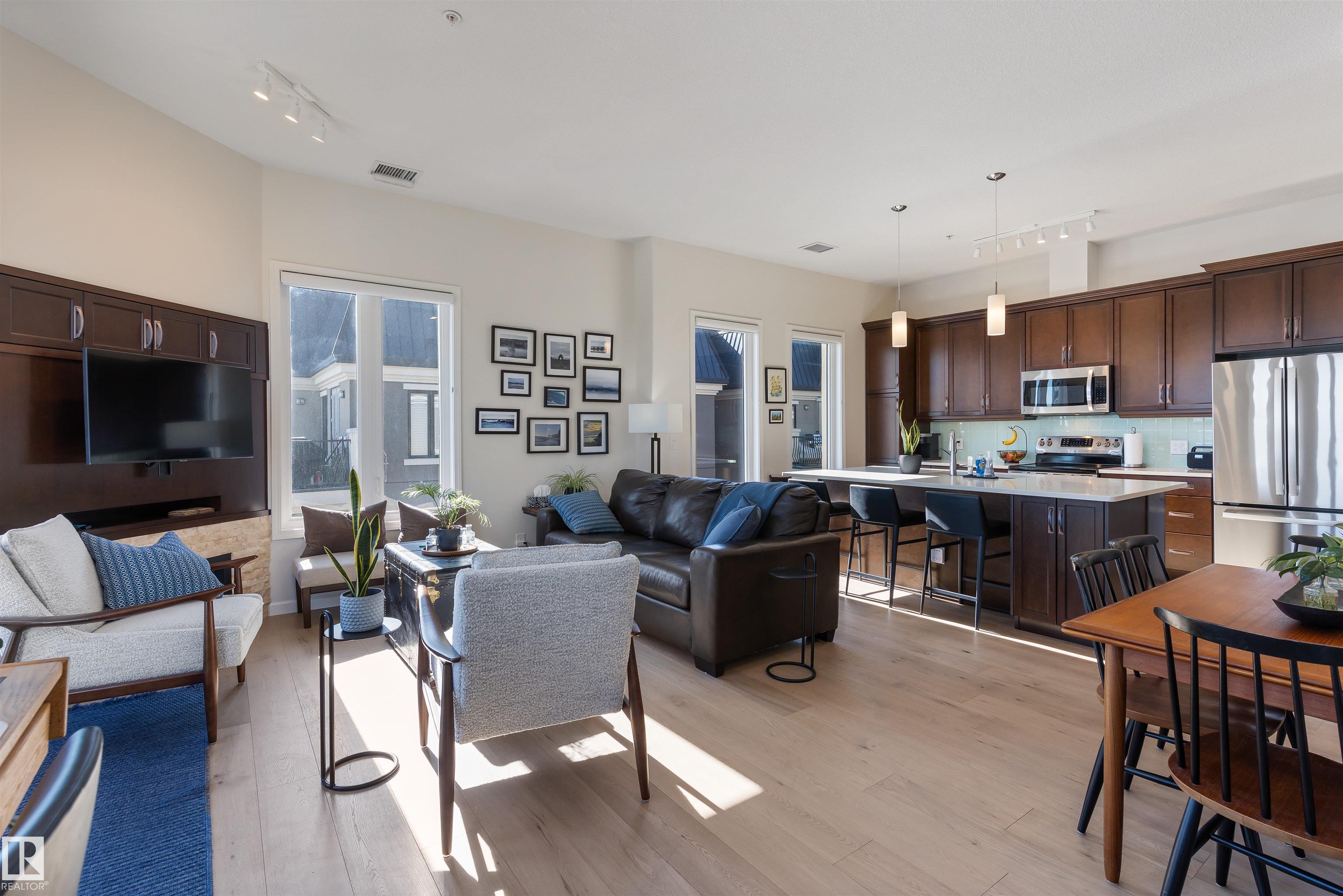 In the beautiful Waterstone complex, discover this SUN-SOAKED, TOP FLOOR, CORNER UNIT w/ incredible LAKE VIEWS, 2 UNDERGROUND PARKING STALLS & a main-floor STORAGE CAGE. Overlook green space, a serene pond & walking trail from the comfort of your home or step outside to the large balcony, perfect for morning coffee or evening wine w/ a view. This updated suite has a warm & welcoming open-concept layout, featuring a cozy corner electric f/p & expansive windows. The kitchen features an abundance of cabinetry, massive eating bar island, QUARTZ counters, pot/pan drawers, s/s appliances, under cabinet lighting & a pantry. The dining area can accommodate large entertaining. Double French doors lead into the den space w/ stunning lake views. The spacious primary bedroom is a true retreat featuring a walk-in closet, California Custom closet organizers & a luxurious 5pce ensuite w/ a custom shower. A large 2nd bedroom, 4pce bath, insuite laundry, A/C & 10' ceilings all add to the magnificence of this unit!