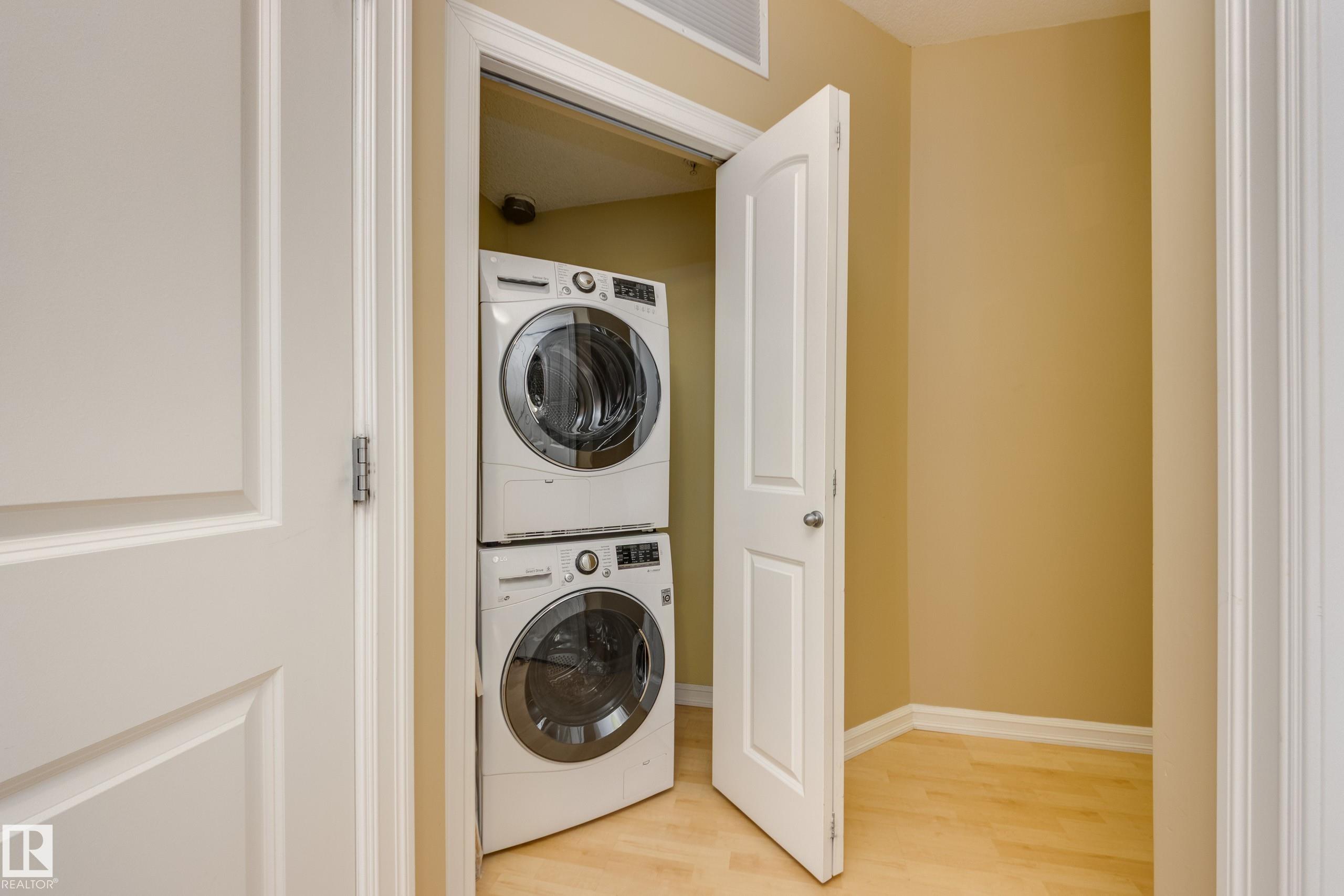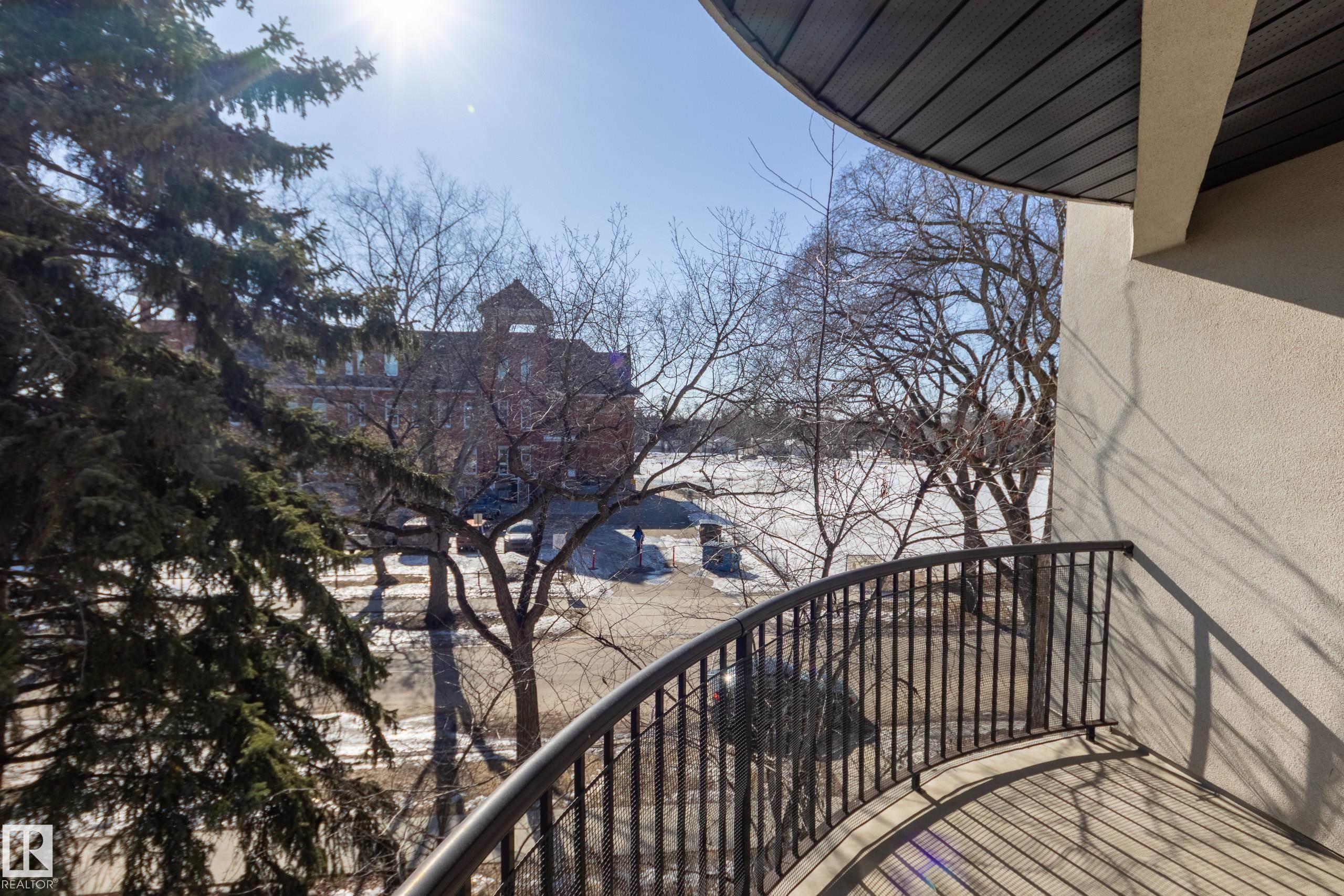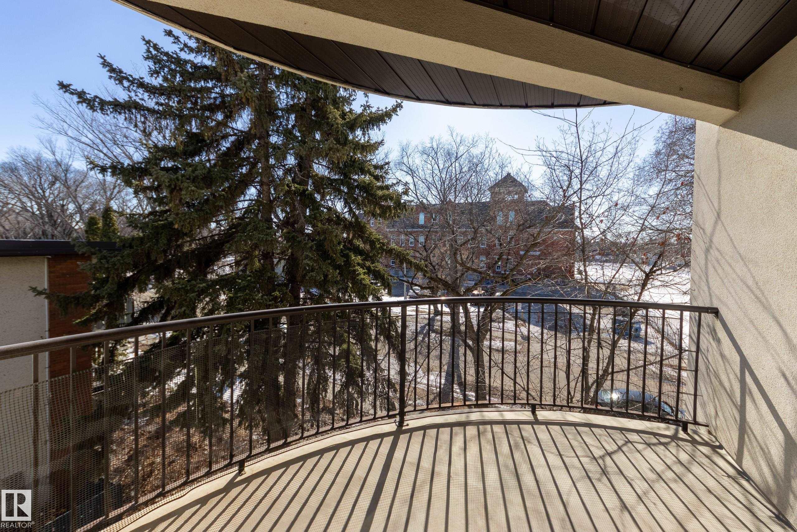 Welcome to Tuscany Place! This 2-bedroom corner unit offers a unique, quiet location overlooking trees, greenspace and historic Queen Alexandra School. Located in the heart of Queen Alexandra, with quick access to Whyte Ave, the university and downtown, this unit is ideally located for walkability and an active lifestyle. Stepping into the unit you?ll find an open-concept layout with 9ft ceilings and lots of natural light. The living room is open and sunny with a large window and a cozy corner fireplace, and the kitchen offers tons of storage, full-height cabinets and a pantry. The adjacent dining area has direct access to a private and spacious south-facing balcony. Down the hall you?ll find a primary suite with a walk-in closet and a luxurious ensuite with dual sinks. A 2nd bedroom and another full bath complete the unit, along with in-suite laundry and A/C, plus a titled underground parking stall. Recent upgrades include new dishwasher and toilets (2023), stove (2024) and new furnace and A/C (2025).